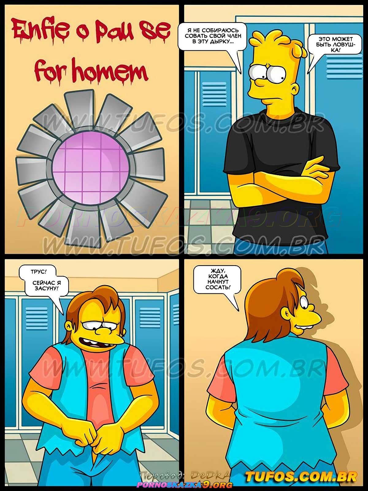 Порно комикс Симпсоны. Часть 56: Раздевалка для девочек. Os Simptoons. Tufos Барт с друзьями стал подсматривать за девушками в женской раздевалке. Красотки это спалили, поэтому позвали парней к себе, чтобы отсосать у них и как следует поебаться…