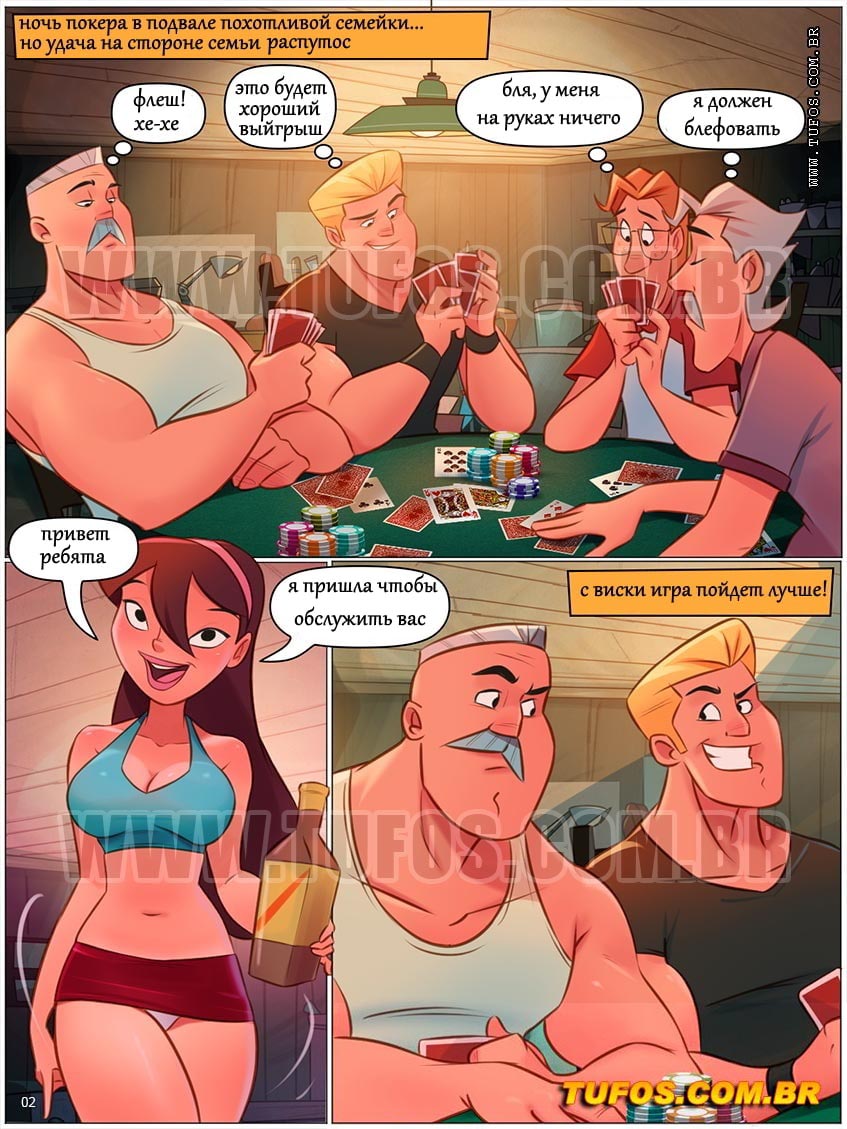 Порно комикс Похотливая семейка. Часть 73: Групповуха на покерном столе. Соседи устроили ночной турнир по покеру в подвале похотливой семейки. Но хозяевам не везло в этот раз и они все проиграли. Тогда у Карлоса появилась идея поиграть на киску Аниты и он снова проиграл. Тогда соседи не долго думая решили воспользоваться свои призом и начали трахать Анину. Девушка ловко справилась с несколькими хуями. Ведь она профессионал своего дела.