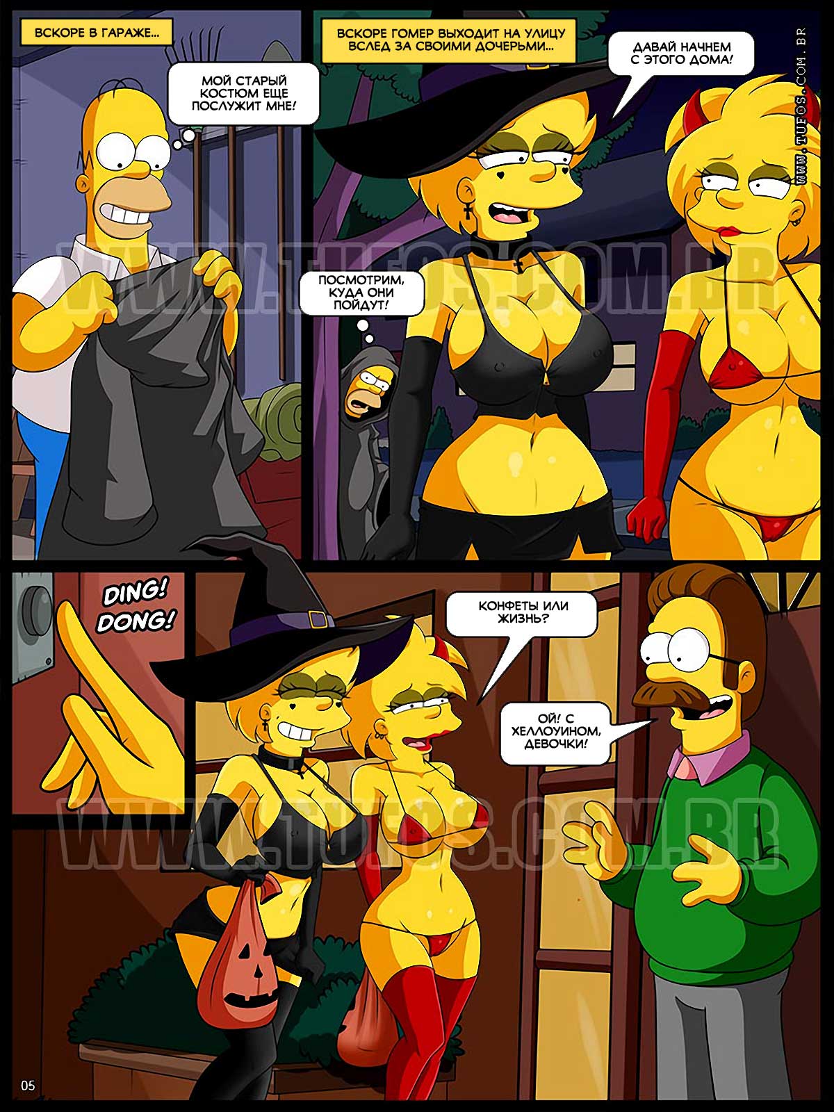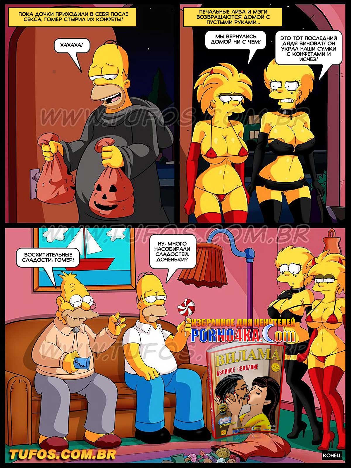 Порно комикс Симпсоны. Часть 17: Ночь на Хэллоуин. Наступил вечер, вся семья готовиться к празднику. Лиза и Меги нарядились в развратные костюмы и собрались пройти по соседям, за конфетами. Но их увидел Гомер и был очень озадачен вызывающими костюмами своих дочерей. Просьбу переодеться в что-то менее сексуальное девушки проигнорировали и он решил проследить за ними. Оказывается они социально так оделись, чтобы собрать побольше конфет. Сестры показывали свои большие сиськи соседским мужчинам, и те щедро награждали их за это.