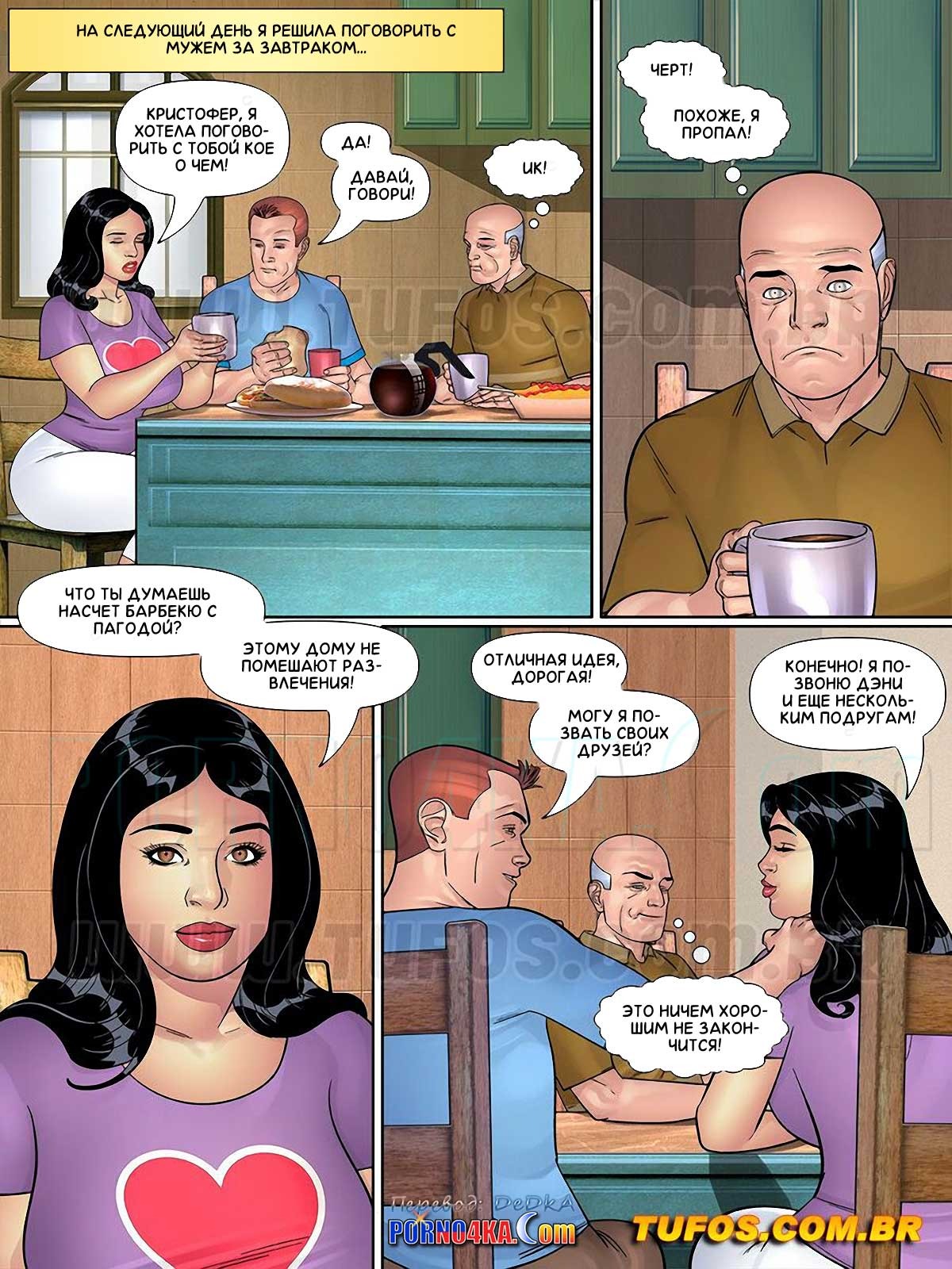 Порно комикс Похотливый папа мужа. Часть 6: Барбекю с пагодой. Эпизод 1. Кларисса предлагает мужу устроить барбекю с пагодой… Ее цель — вернуть мир в дом и, прежде всего, спасти свой брак! В присутствии Даниэлы, которая любит наслаждаться жизнью, и подвыпивших друзей Кристофера лакомство жареной «говядиной» пойдет не так, как планировалось…