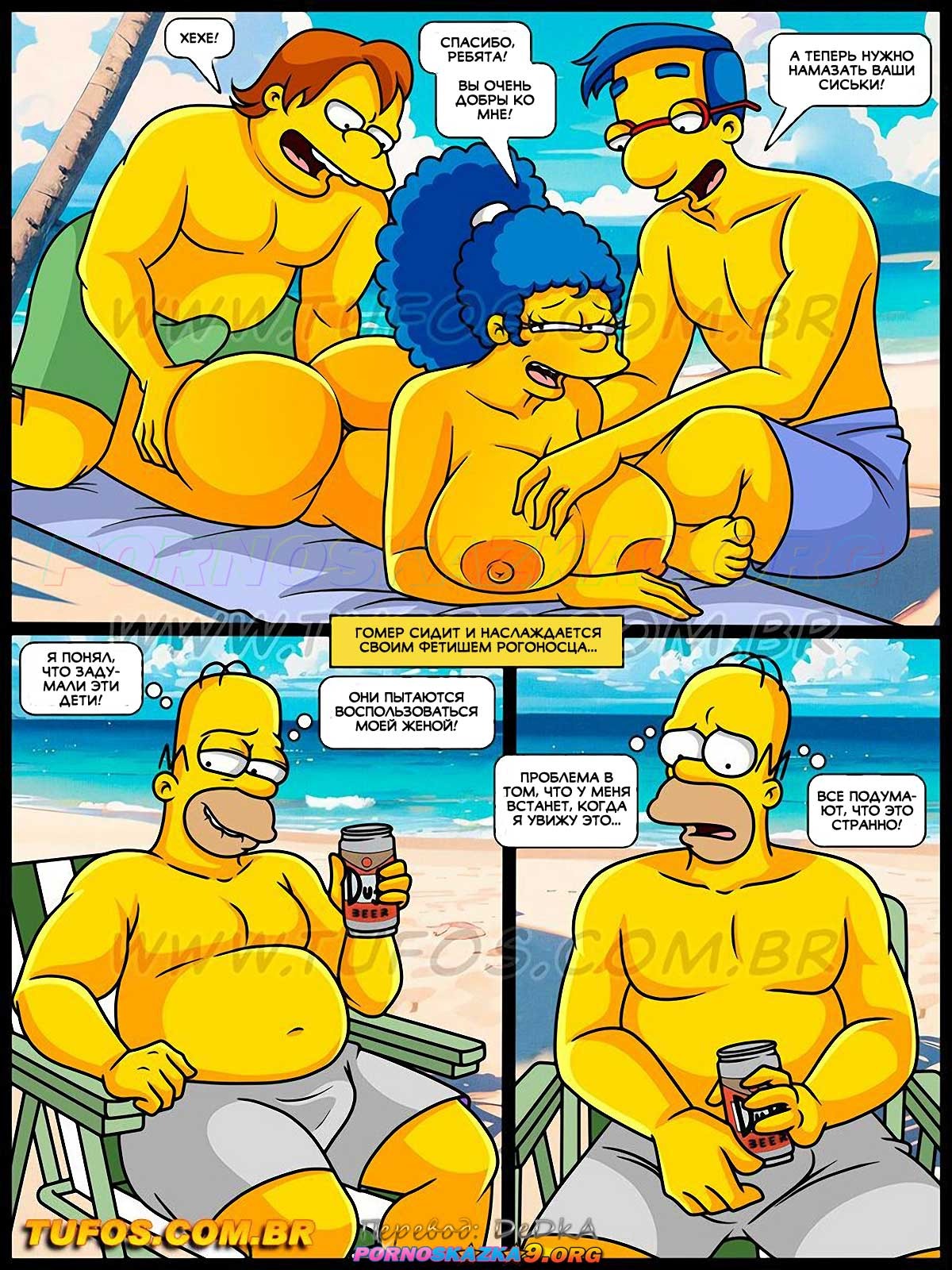 Порно комикс Симпсоны. Часть 66: Закопанный в песок. В Спрингфилде жаркий солнечный день и местные жители отправляются отдыхать на пляж… Нильсон и Милхаус сразу идут купаться, а Барт предпочитает остаться на берегу и любоваться красотками в бикини…
