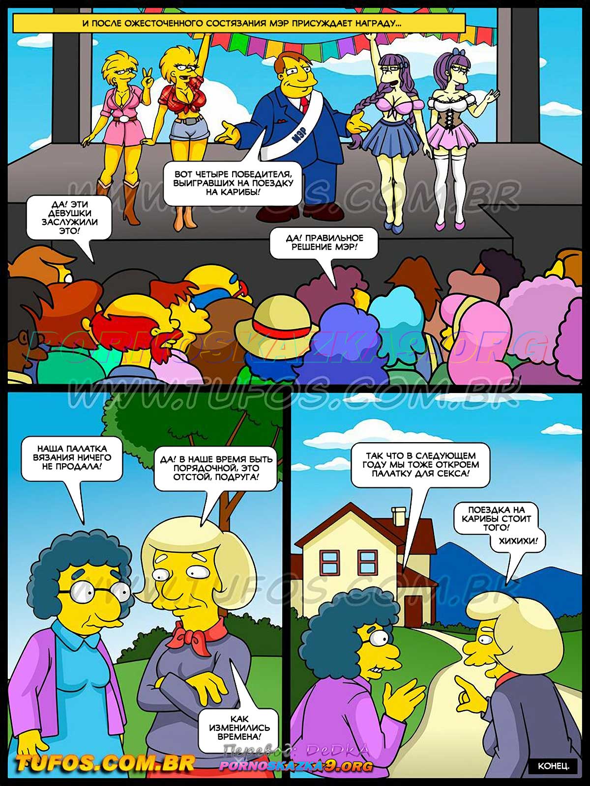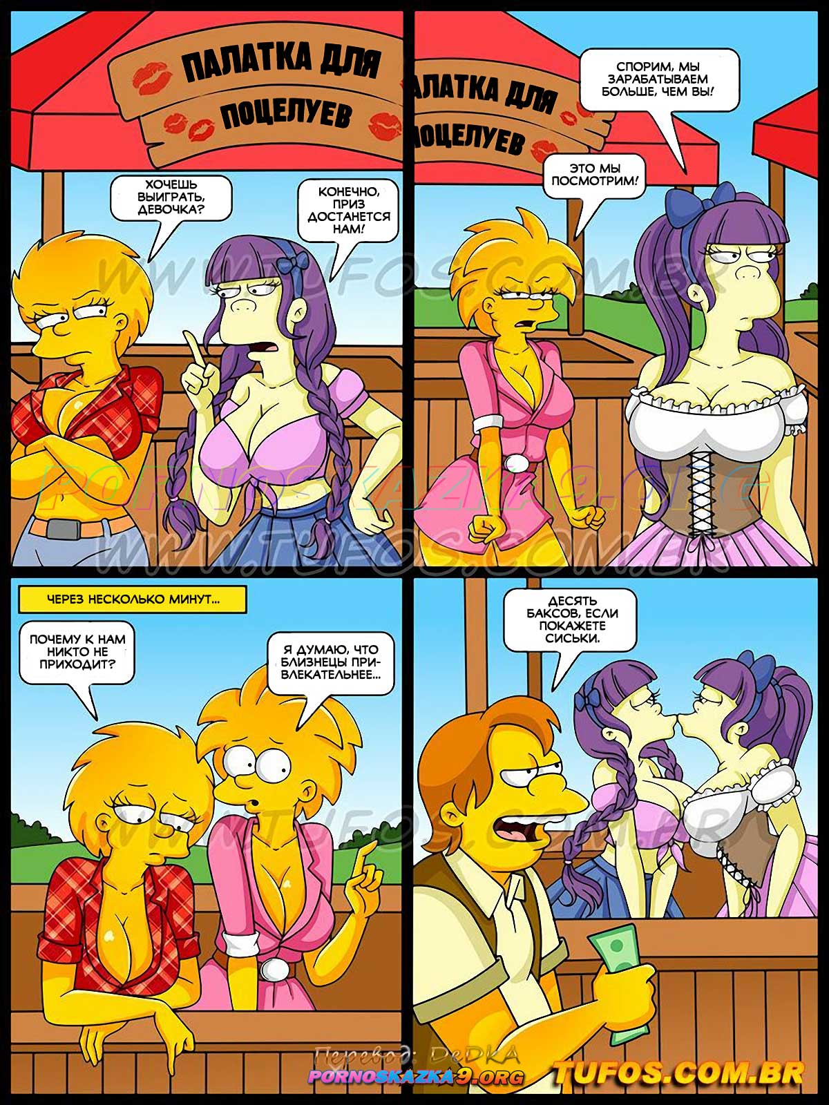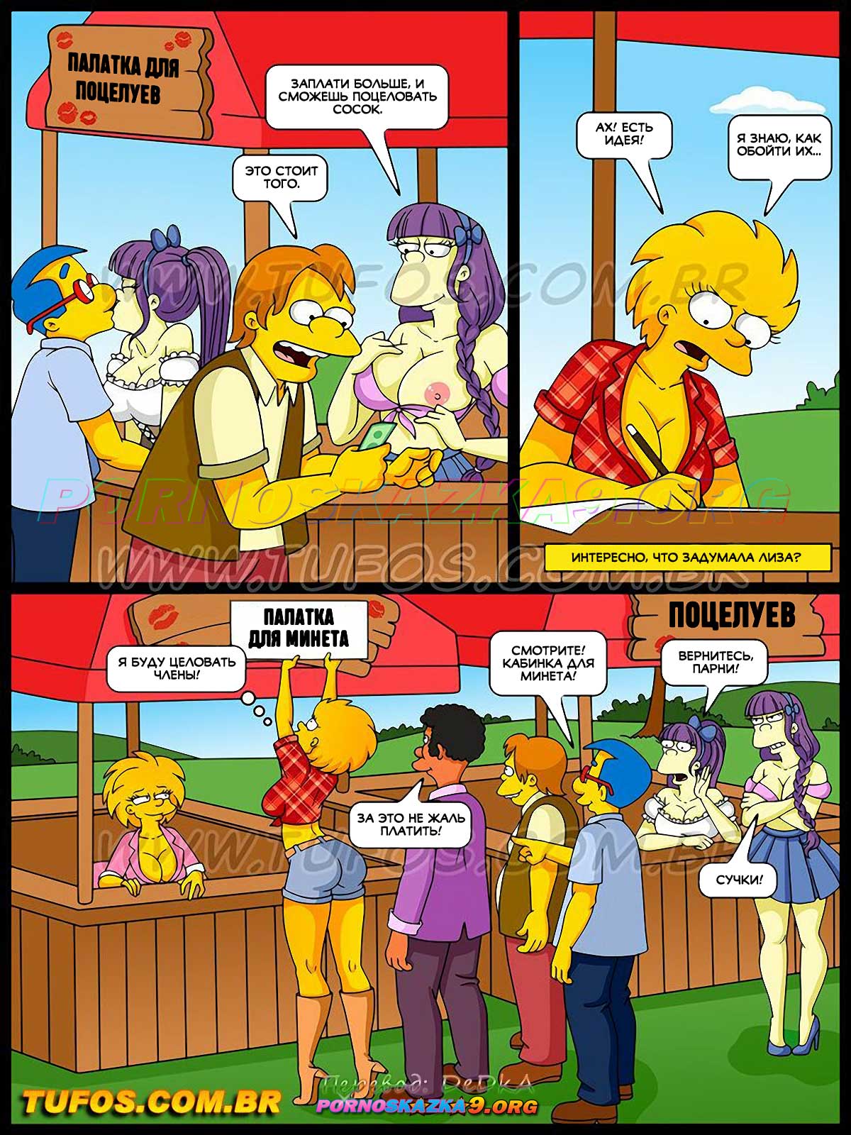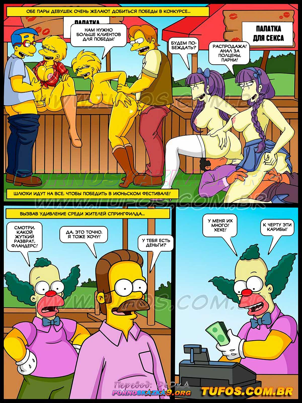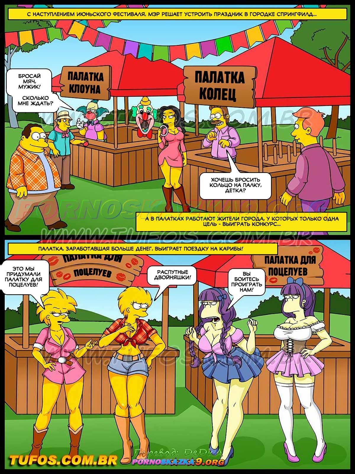 Порно комикс Симпсоны. Часть 43. Палатка для секса. Спрингфилдский июньский фестиваль продолжается! Мэр города обещает наградить хозяев палатки, которая соберет больше всего денег, поездкой на Карибы… Мэгги и Лиза в палатке поцелуев надеются получить приз.