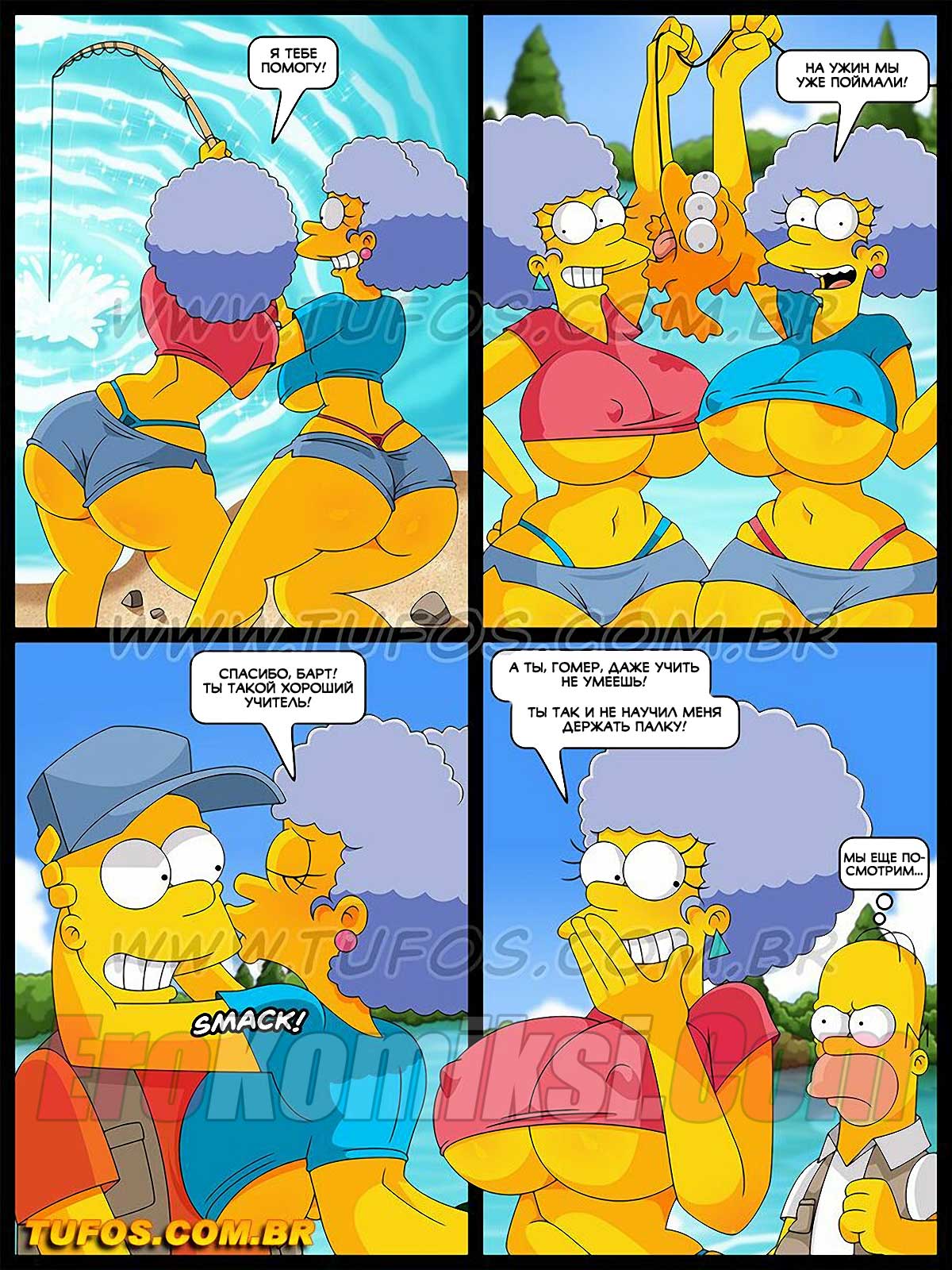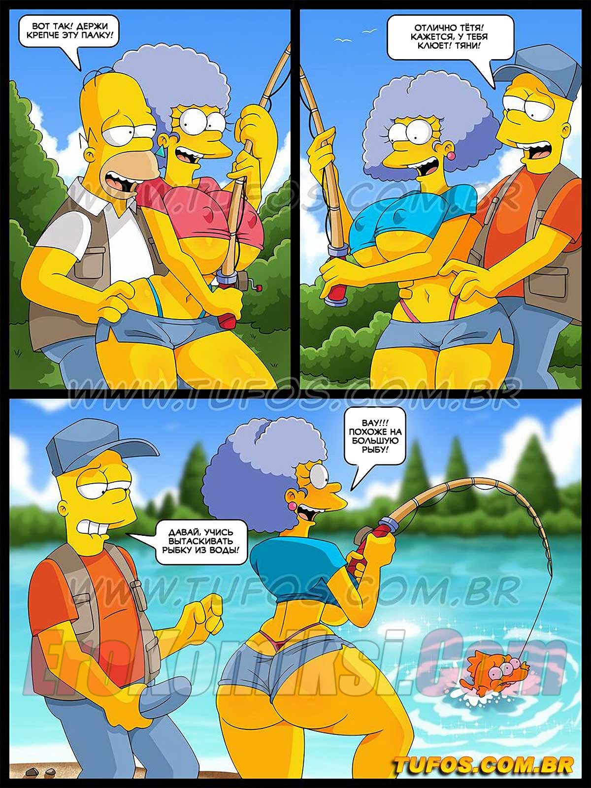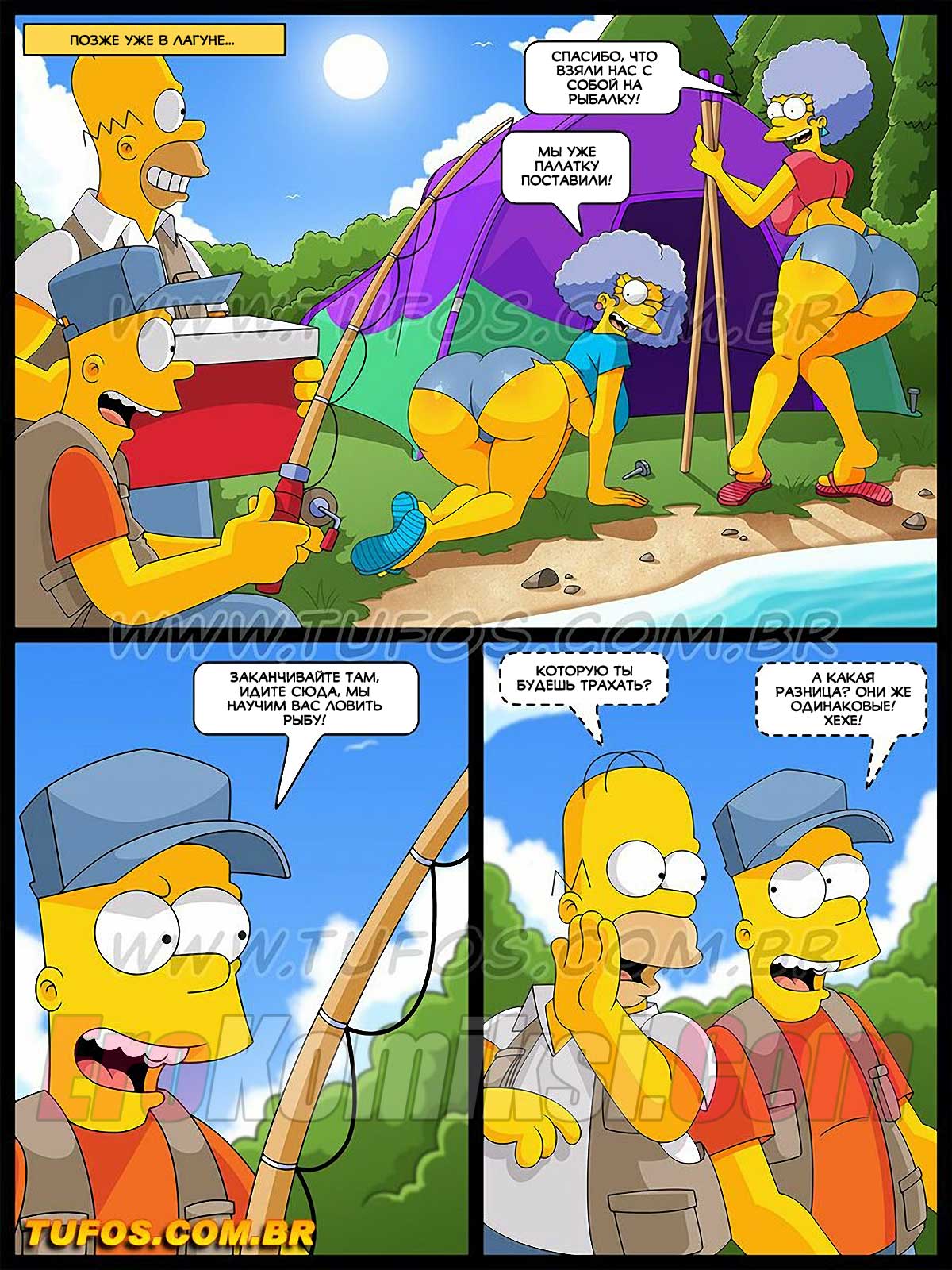Порно комикс Симпсоны. Часть 30: Рыбалка с развратом. Гомер и Барт поехали на рыбалку, за ними увязались сестры Мардж. Мужчина нашли применение этим двум красоткам.