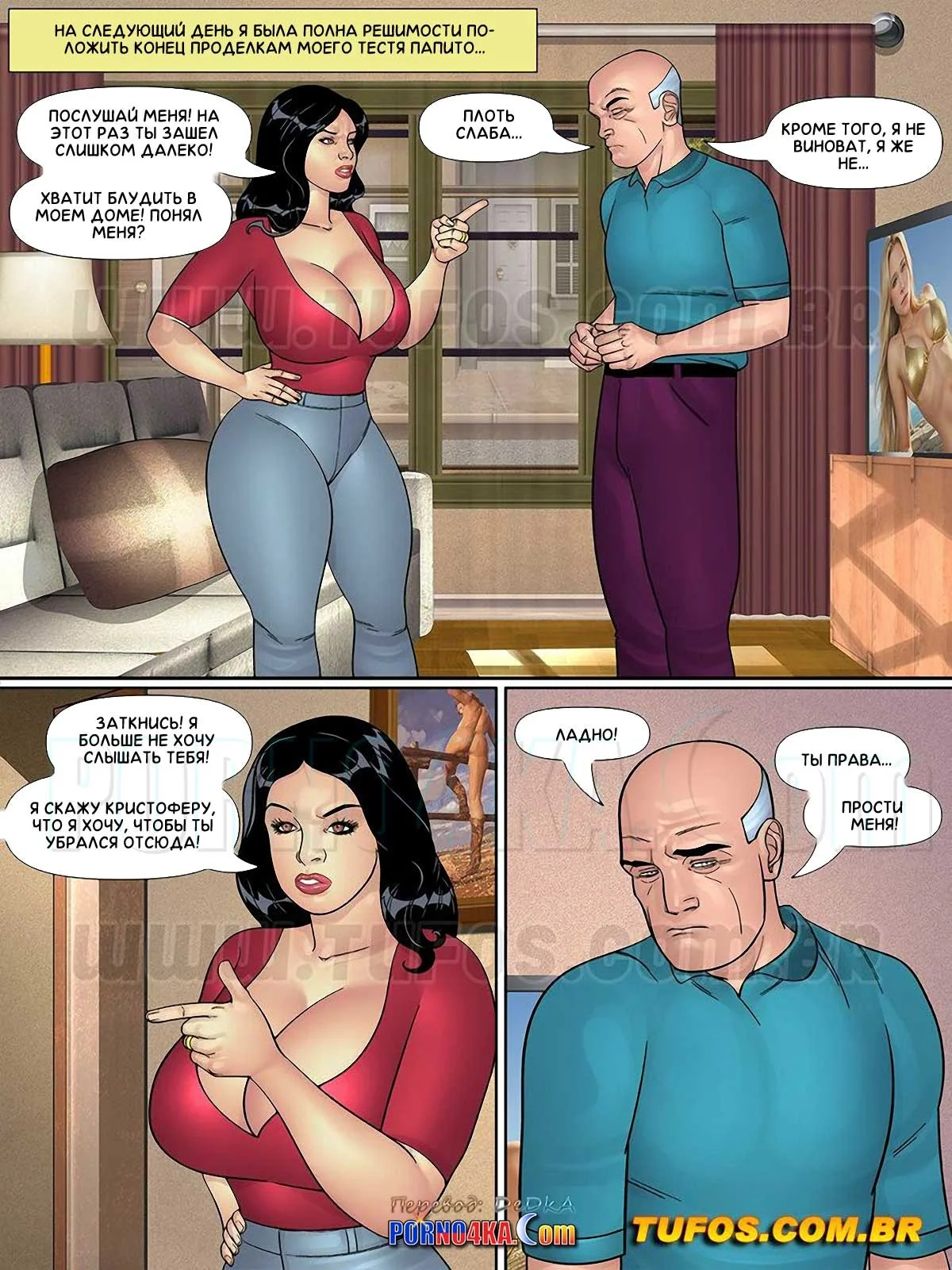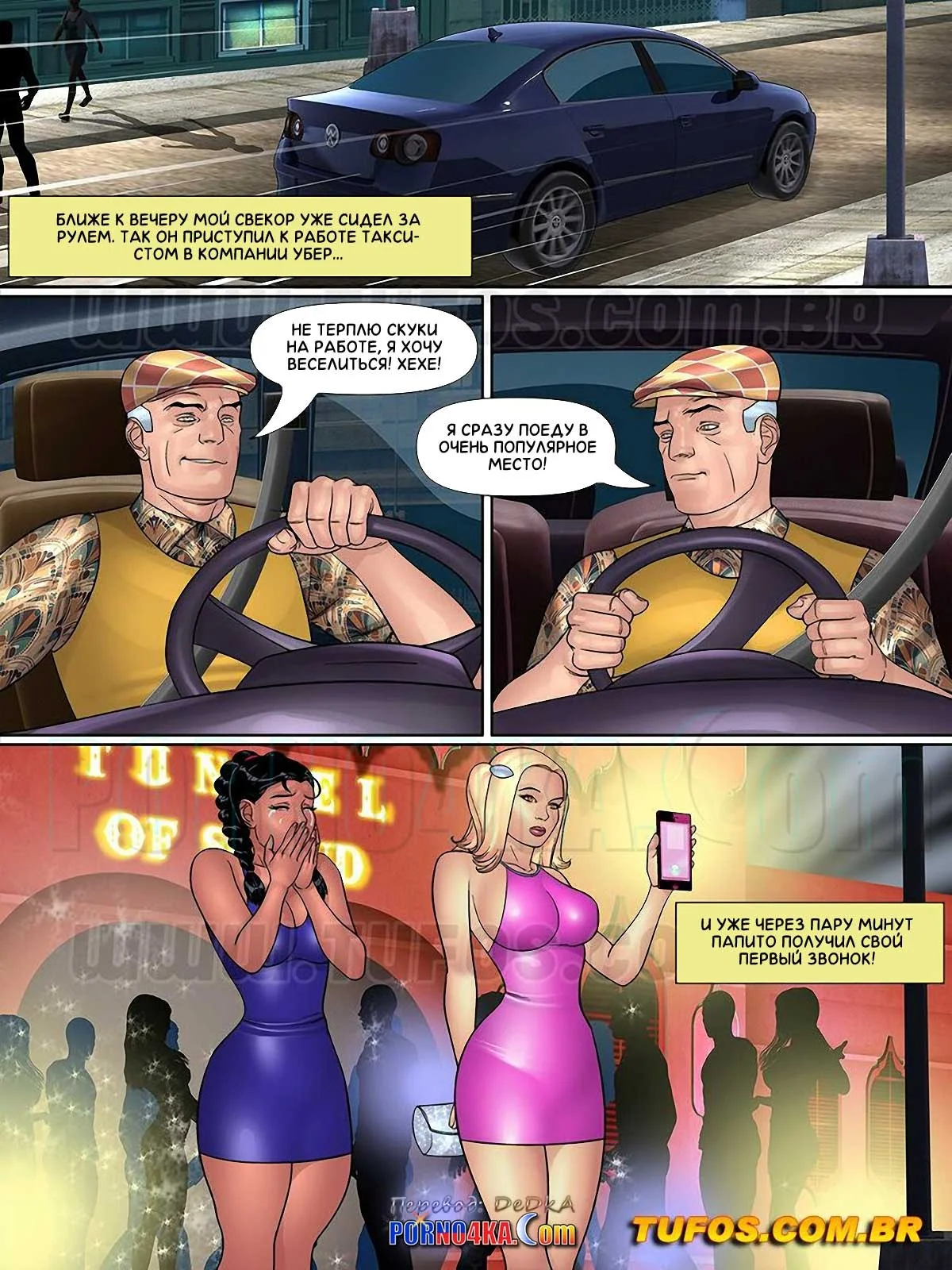 Порно комикс Похотливый папа мужа. Часть 4: Убер и девочки. Кларисса решительно захотела положить конец безобразиям свекра и сообщить обо всем супругу. Но внезапно ее мужа уволили с работы, и она вынуждена поменять свои планы, чтобы не портить ему настроение еще больше. И тут, к общему удивлению, Папито предлагает свою помощь и сообщает, что может подработать в качестве таксиста в известной компании убер. Но, правда, старый извращенец планировал не столько заработать, сколько потрахаться с клиентками…