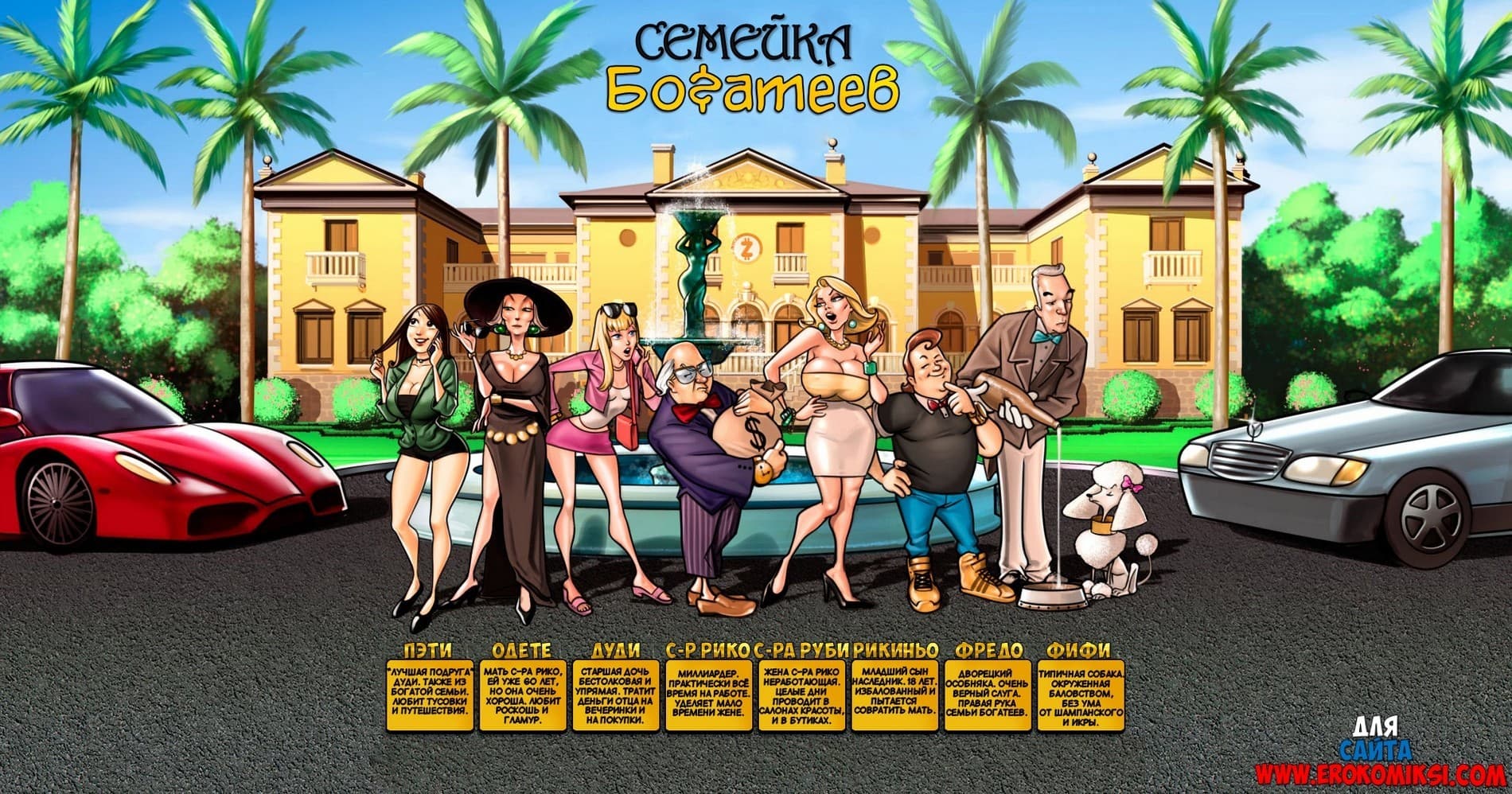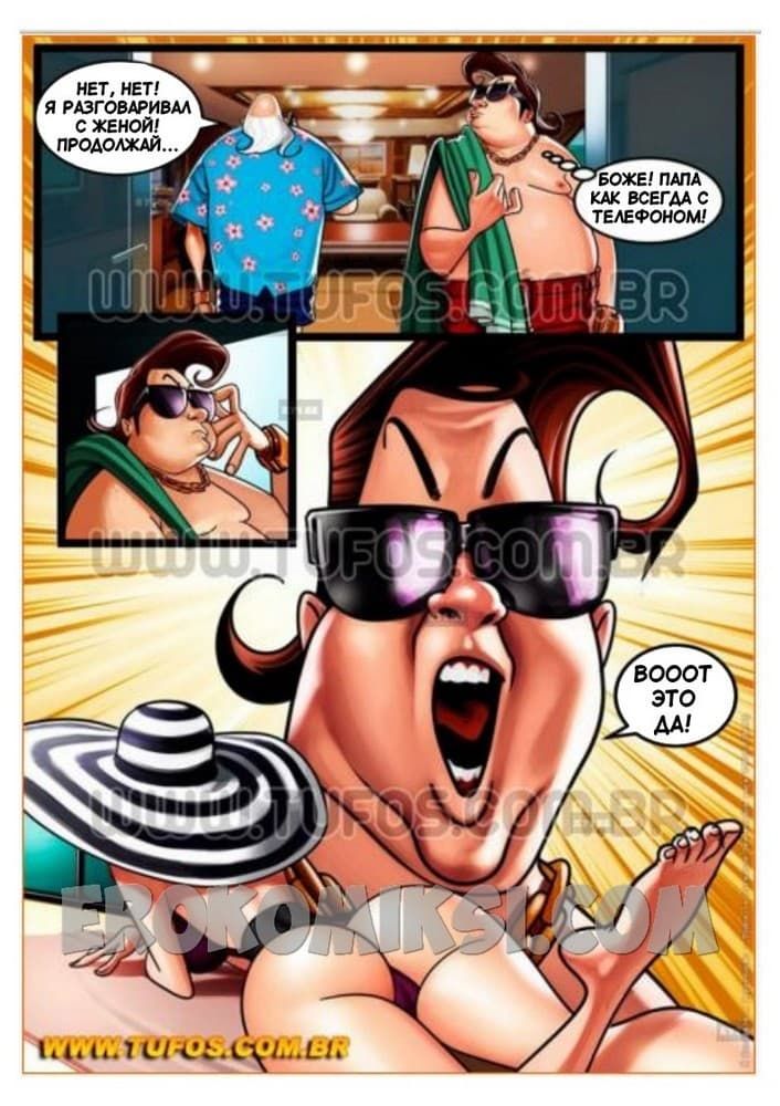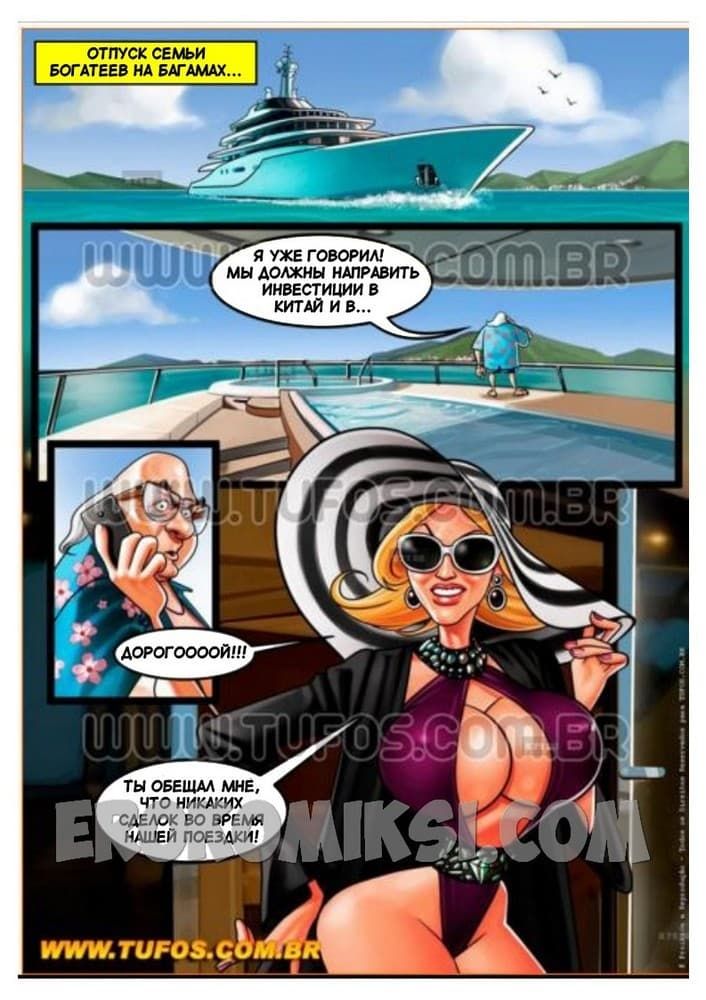 Представляем вам новый порно комикс семейка богатеев. Сюжет первой части начинается с того, что семья богатеев проводит свой отпуск на райских Багамских островах. Но даже здесь сеньор Рико не может оставить свои финансовые дела. Сеньора Руби, напялив на себя новый откровенный купальник просит супруга помазать ее тело кремом для загара, но тому не до нее, ведь для него бизнес на первом месте. Тогда таким удобным шансом пользуется их озабоченный сынок Рикиньо…