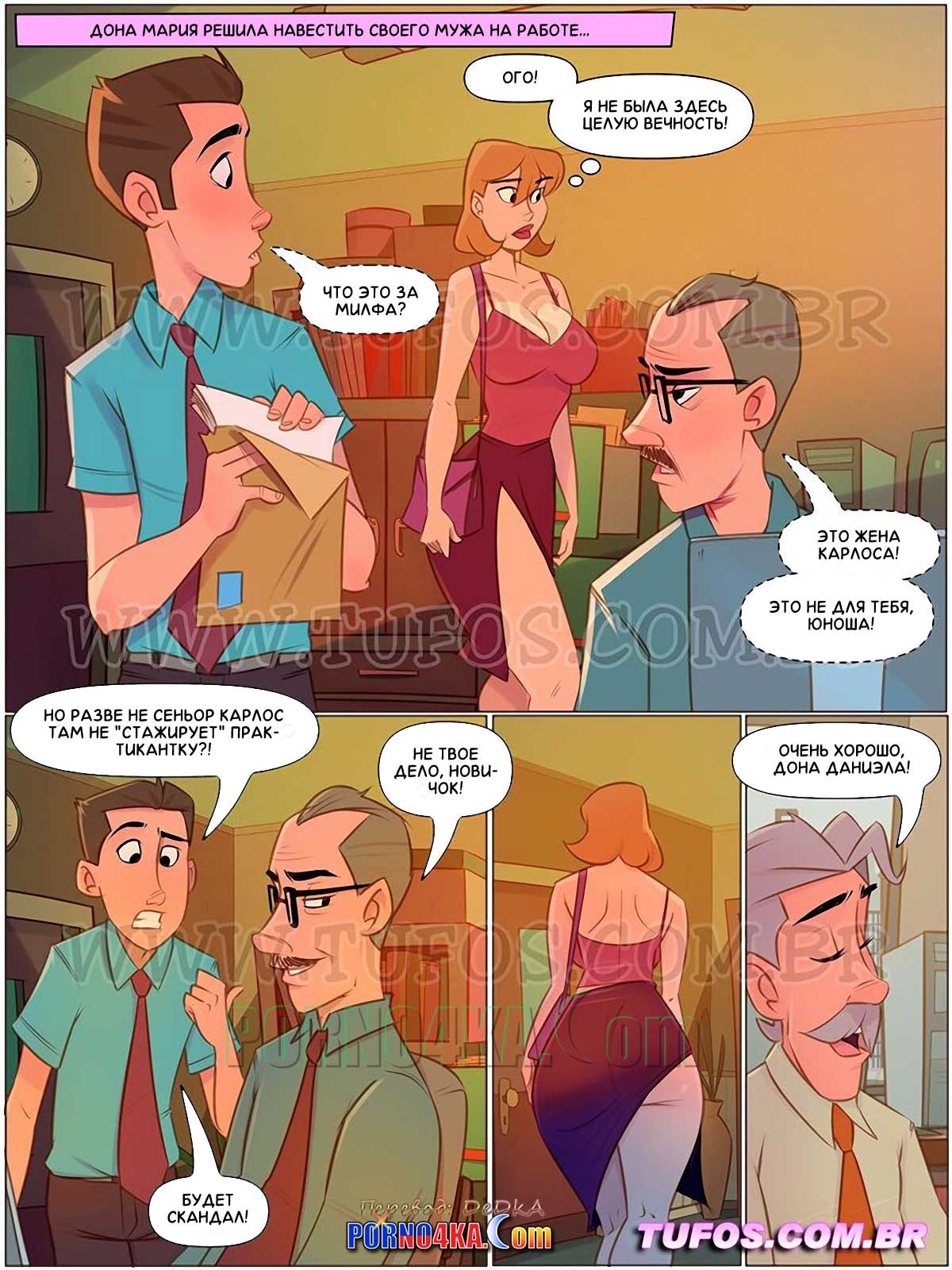 Порно комикс Четверо похотливых. Часть 11: Сгорел на работе. Дона Мария зашла в офис к своему мужу поздороваться, но увидела, как стажера сосет член босса. Красотка решила отомстить мужу и стала сосать хуй молодого сотрудника офиса, после чего дала ему выебать себя во все дырочки и кончить ей в задницу…