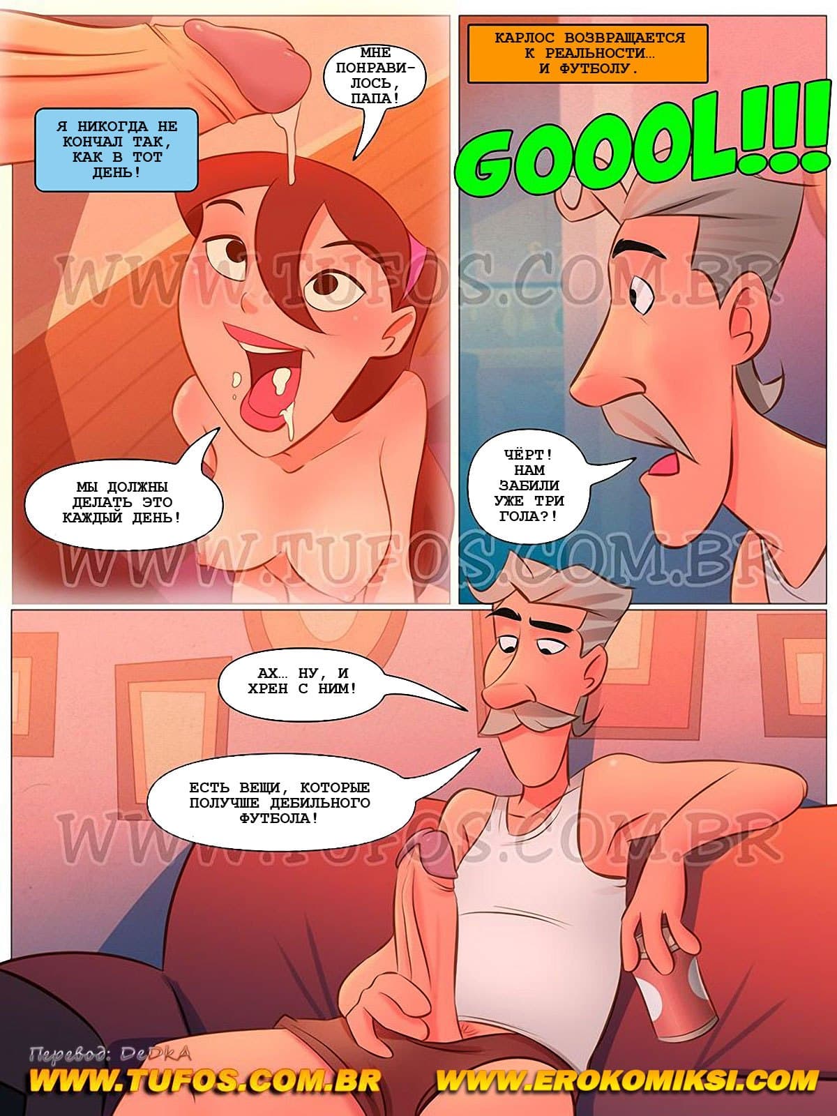Инцест комиксы Похотливая семейка продолжаются! В 38 части все начинается с того, что в выходной день Карлос сидел дома в кресле, смотрел футбол и потягивал холодное пиво. И казалось, ничто не может отвлечь его от пива и зрелища. Но, как говорится, клин клином вышибают. От зрелища, а заодно и от пива, Карлоса отвлекло другое зрелище. Между ним и экраном телевизора прошла его дочка с откормленной задницей, туго обтянутой тесными голубыми шортиками. Ах, эти шортики… Они напомнили Карлосу о таком, что ему стало не до футбола, и он предался сладостным воспоминаниям. Да, было дело…