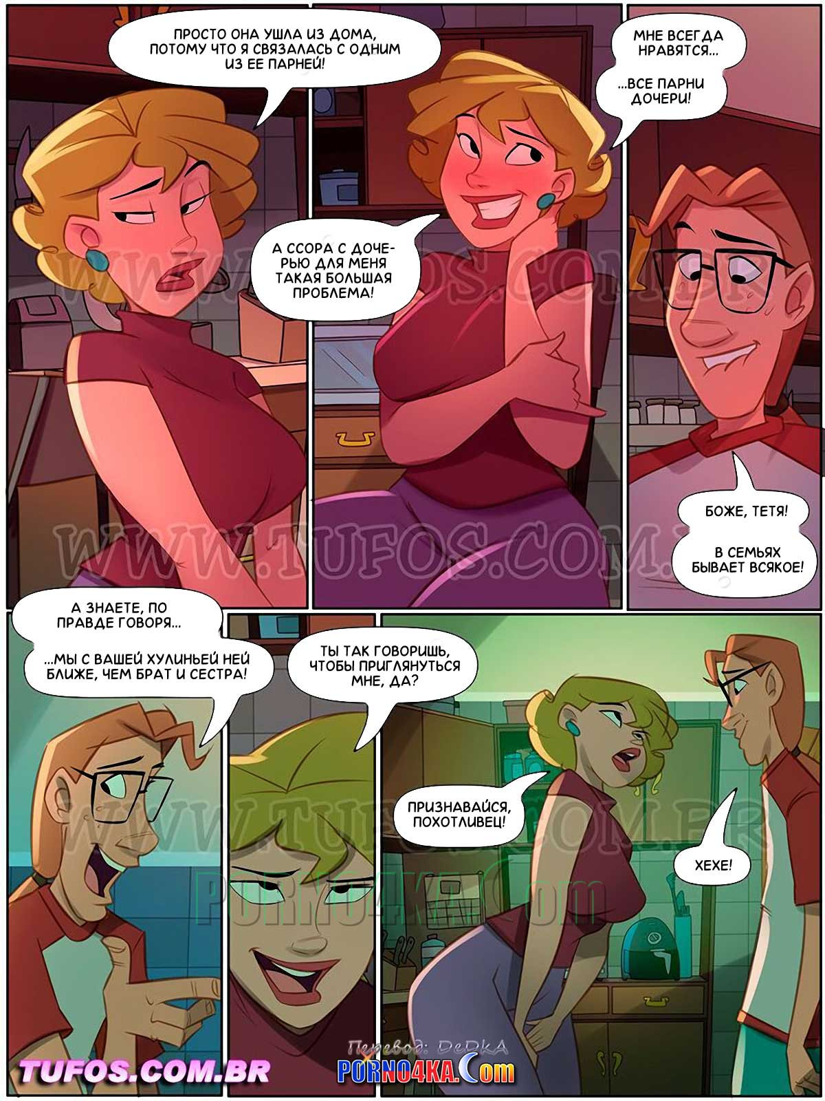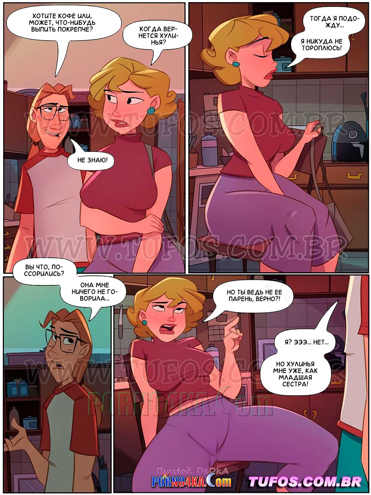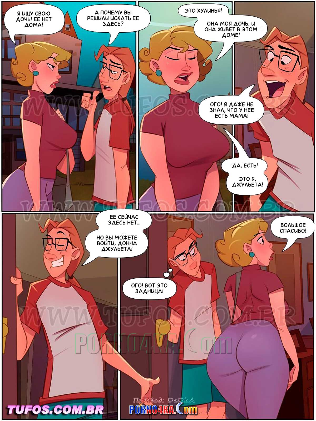 Порно комикс Четверо похотливых. Часть 17: Знакомство с мамой Хулиньи. Однажды утром в дверь дома похотливой семейки звонит красивая милфа… Карлиньос открывает дверь, не глядя на женщину, которая спрашивает о местонахождении ее дочери. Узнав, что это сеньора Жульета, мать Хулиньи, парень приходит в восторг и приглашает милфу в дом…