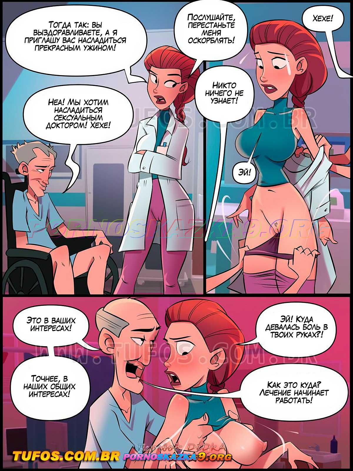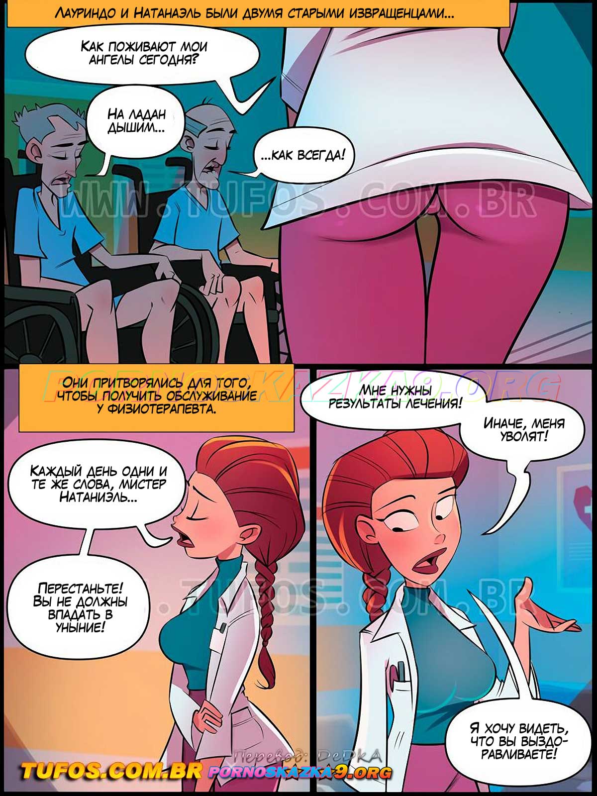 Порно комикс Дом мамы Жоаны. Часть 22: Физиотерапия. Лауриндо и Натанаэль были двумя старыми извращенцами, они притворились немощными только для того, чтобы лечь в клинику и получать заботу и физиотерапевтические процедуры от лечащей их, молодой, сексуальной Жаклин. А доктору Жаклин, нужно было продемонстрировать главврачу прогресс в лечении стариков, которые никак не хотели выздоравливать…