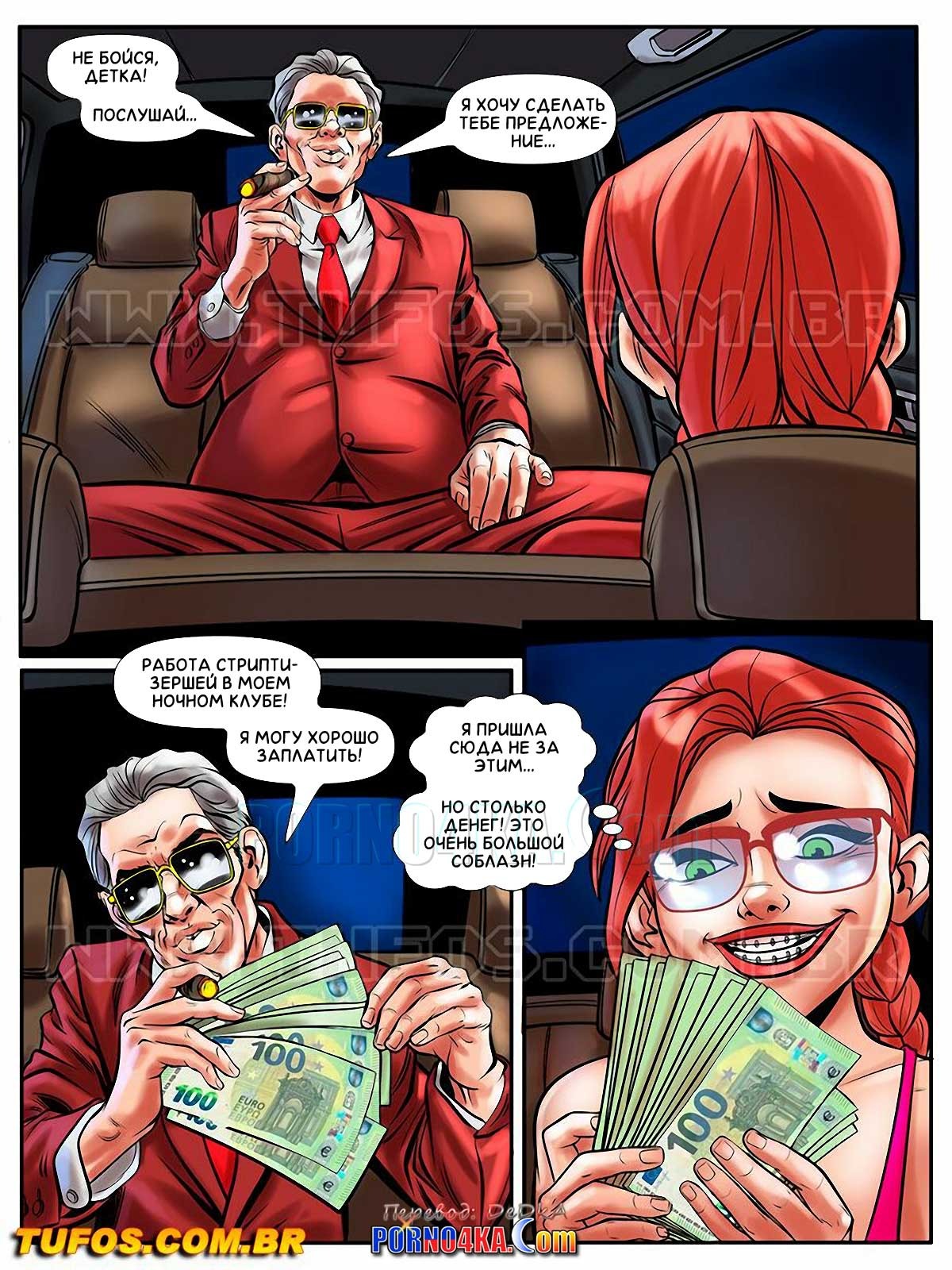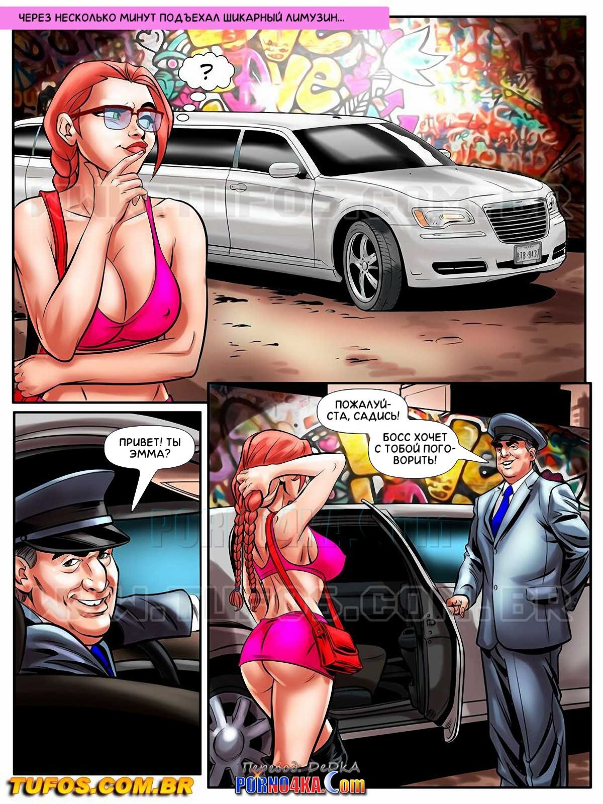 Порно комикс Похотливая ботанка. Часть 9: Проститутка на одну ночь. Эпизод 2. Нимфоманка снова приходит на угол перекрестка, где ждут клиентов проститутки… Эмма решила даже отдать свою тугую киску даже за копейки, ведь девушка решила заниматься проституцией не ради материальных благ, а ради нескончаемого удовольствия! Спустя всего пару минут в лимузине появляется известный мафиози, который делает ей крайне заманчивое предложение…