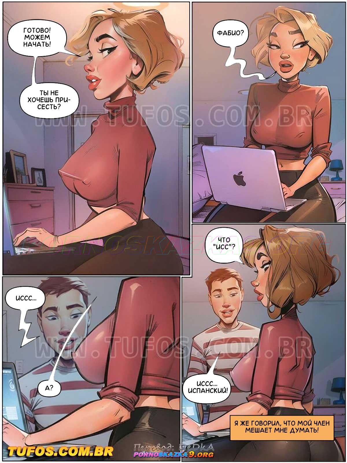 Порно комикс Наслаждайся жизнью по полной. Часть 8: Учительница испанского языка. Милфа училка пришла преподавать частные уроки. Парень ей так понравился, что женщина решали обучить его в первую очередь сексу…