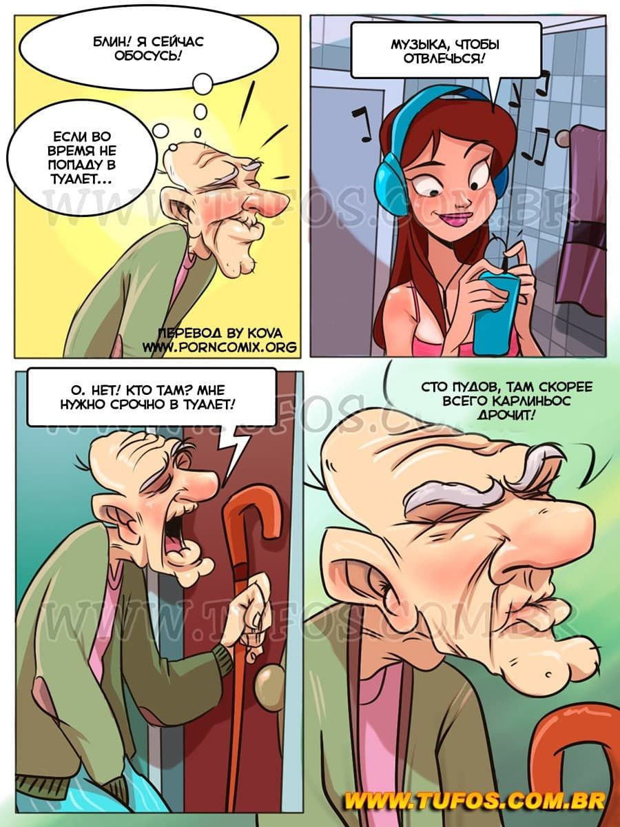 Развратный русский инцест комикс про похотливую семейку, в котором дедуля очень хочет справить нужду, но в туалете кто-то есть и не пускает старца. Деду ничего не остается, как надавить на дверь и зайти, и что же он там видит…