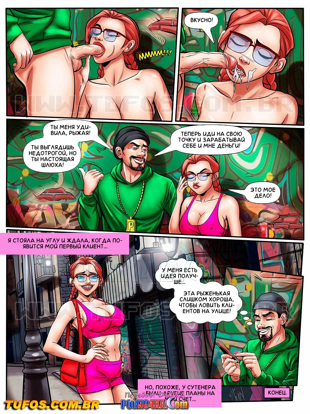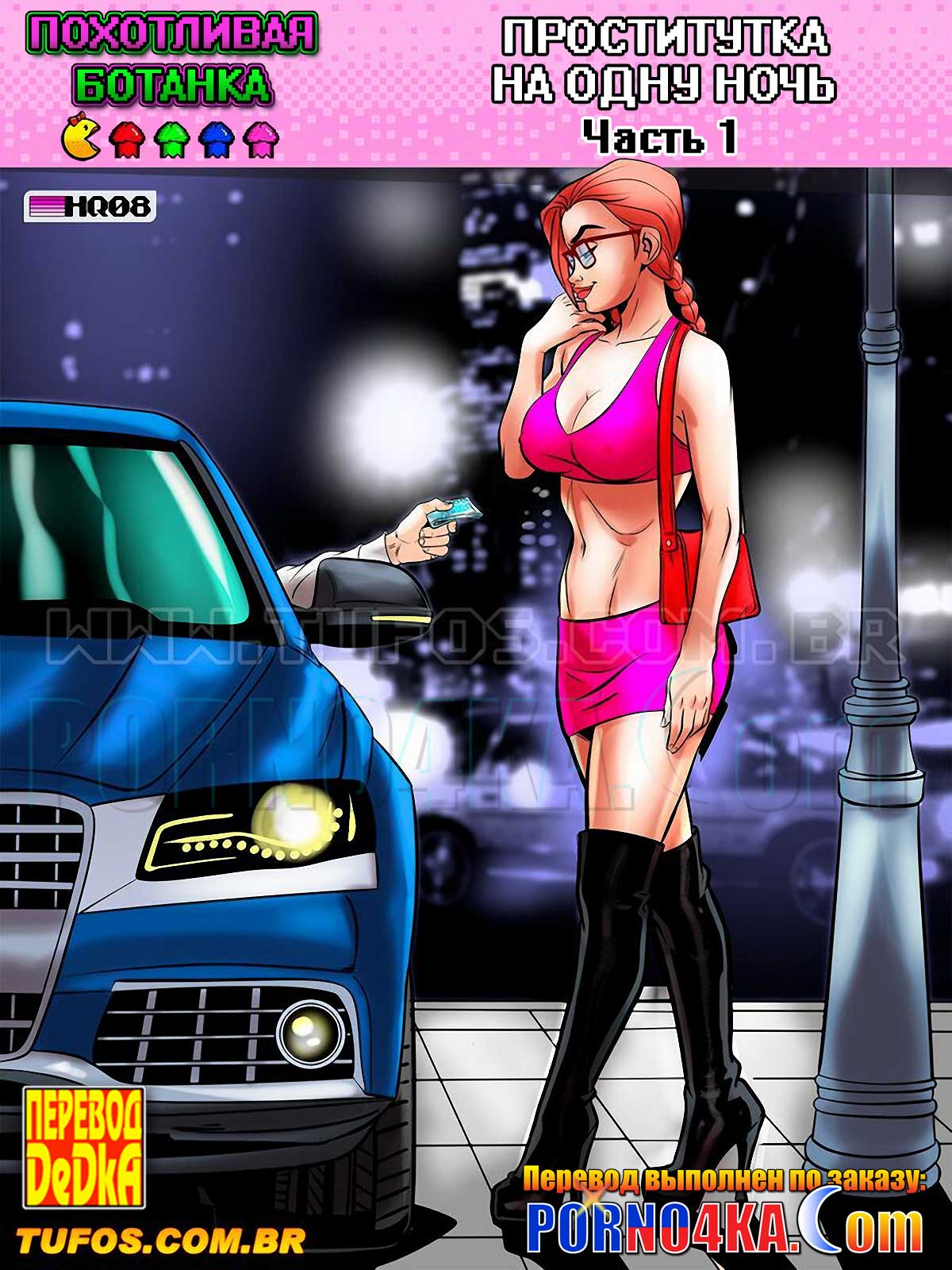 Порно комикс Похотливая ботанка. Часть 8: Проститутка на одну ночь. A Nerd Ninfomanca. Tufos Эмма решила попробовать коечто новое для себя, поэтому она оделась, как шлюха и отправилась в переулок, где водятся проститутки. Там она встретилась с сутенером, которые решил протестировать ее услуги…