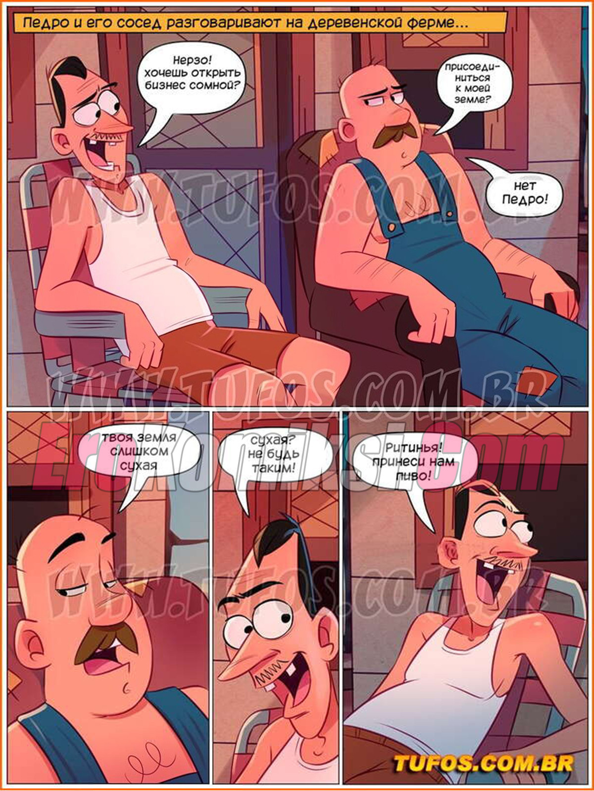 Порно комикс Деревенская семейка. Часть 38: Сделка закрыта. Педро предложил своему соседу бизнес сделку по объединению земли, но сосед сначала отказался, сказав что его земля слишком «сухая», но дочка Педро, по имени Ритинья, быстро его переубедила…