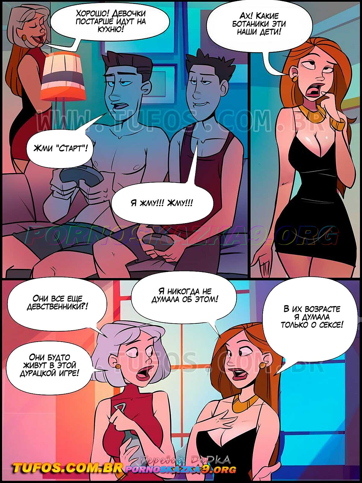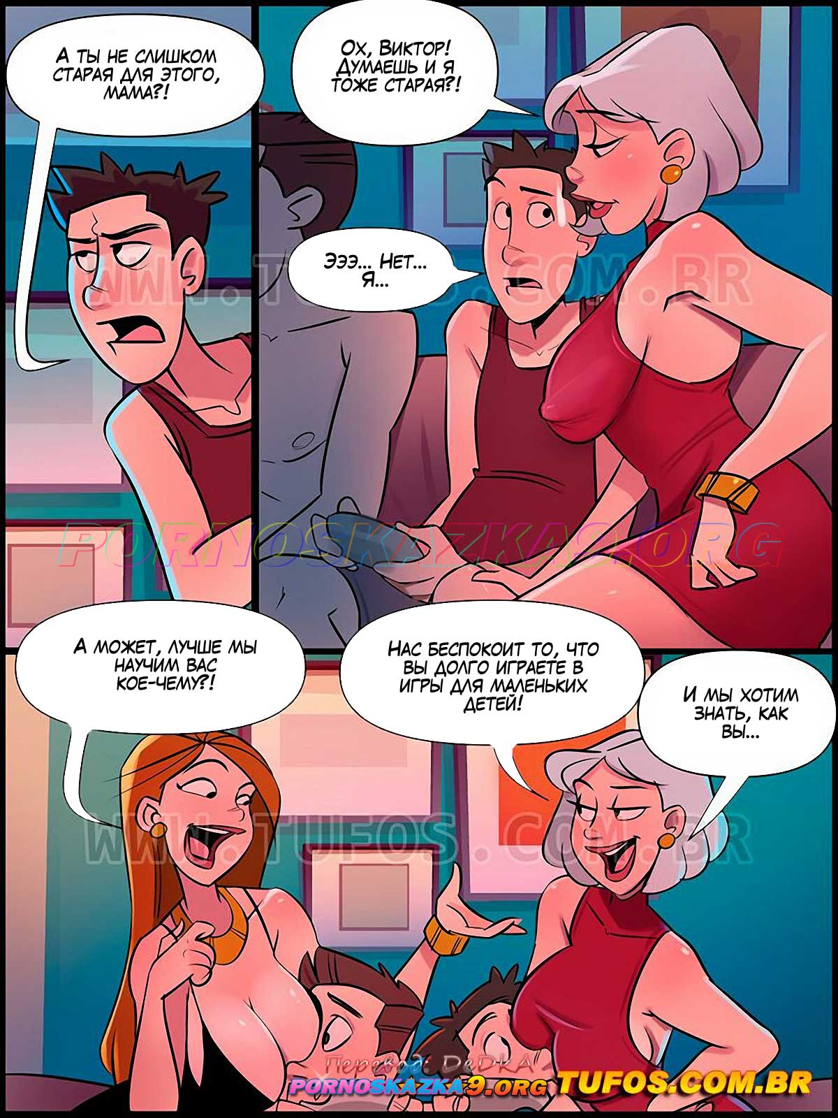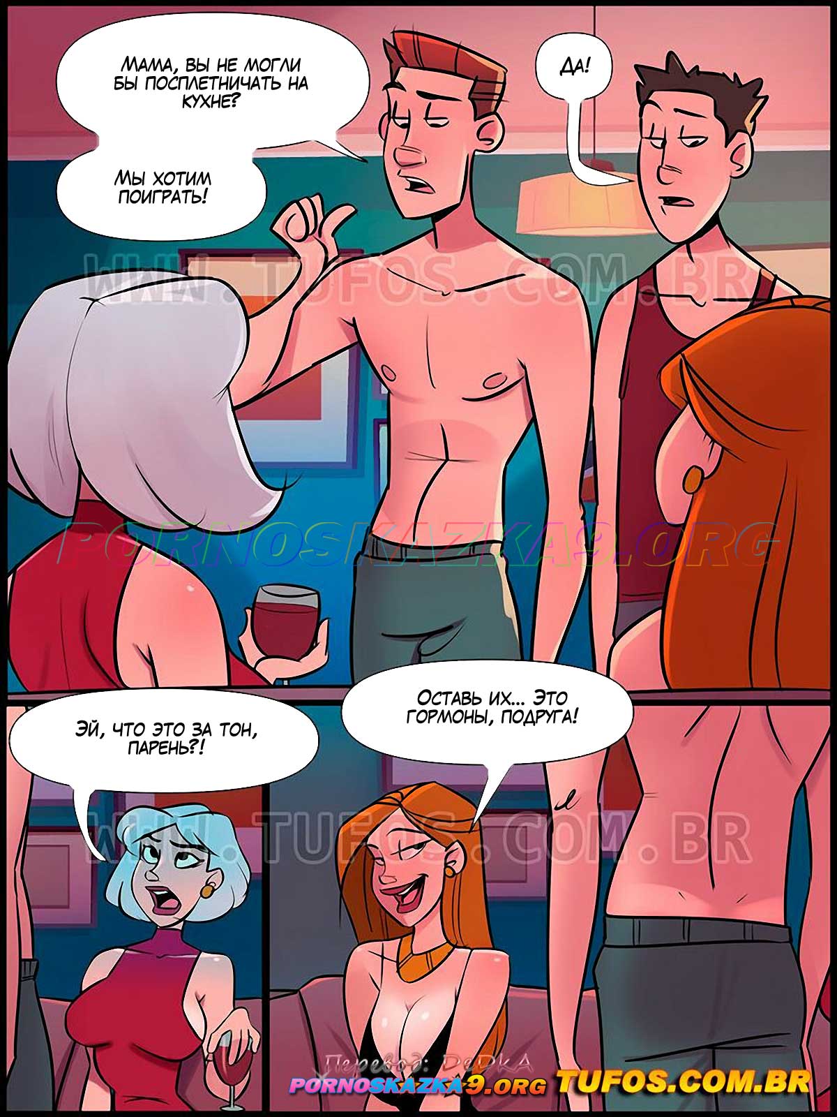 Порно комикс Дом мамы Жоаны. Часть 15: Обмен. Две горячие милфы развелись с мужьями, поэтому решили повеселиться со своими сыновьями. Сучки стали соблазнять сыновей друг дружки, после чего отсосали у них и дали им выебать все свои дырочки.