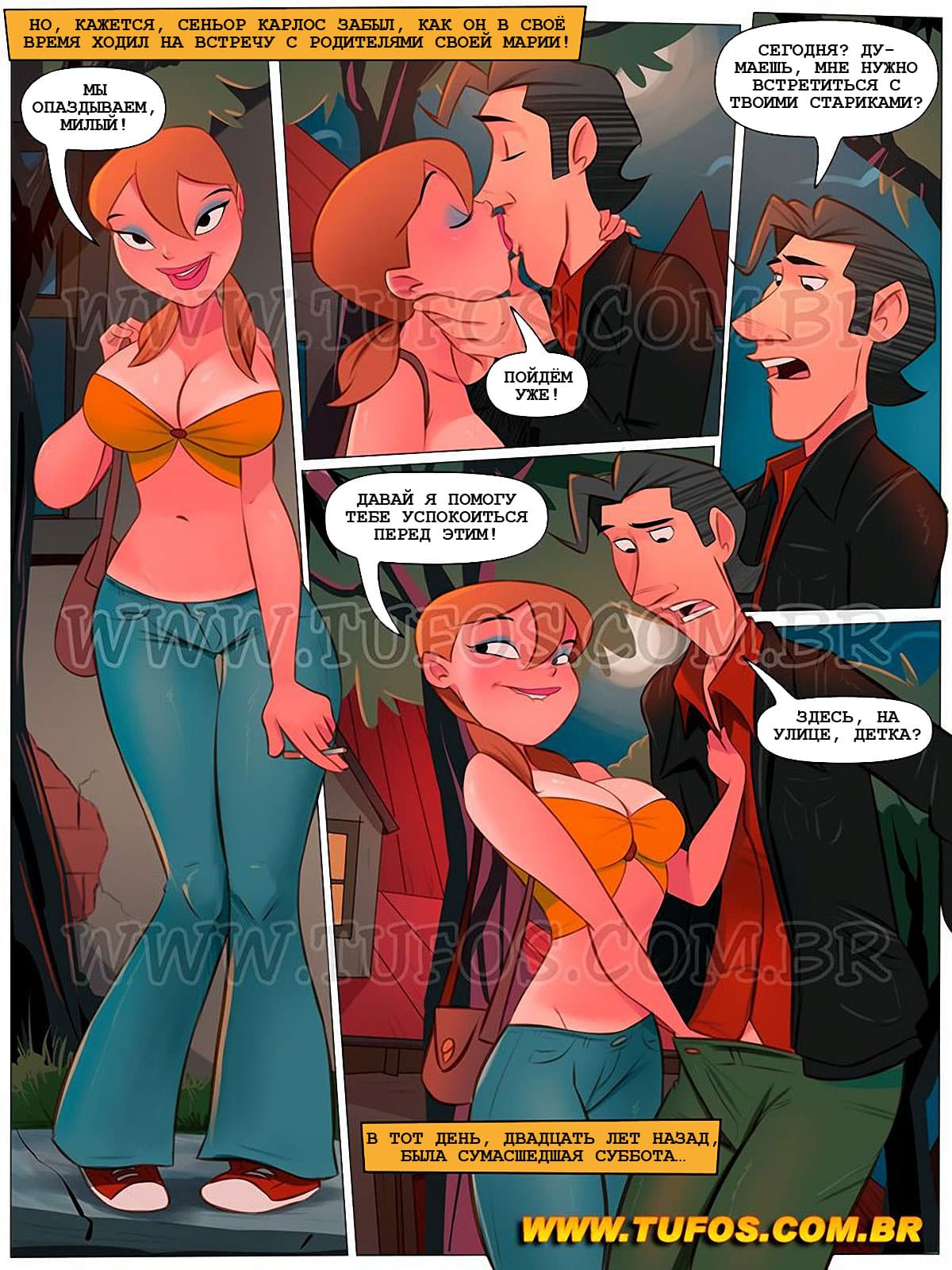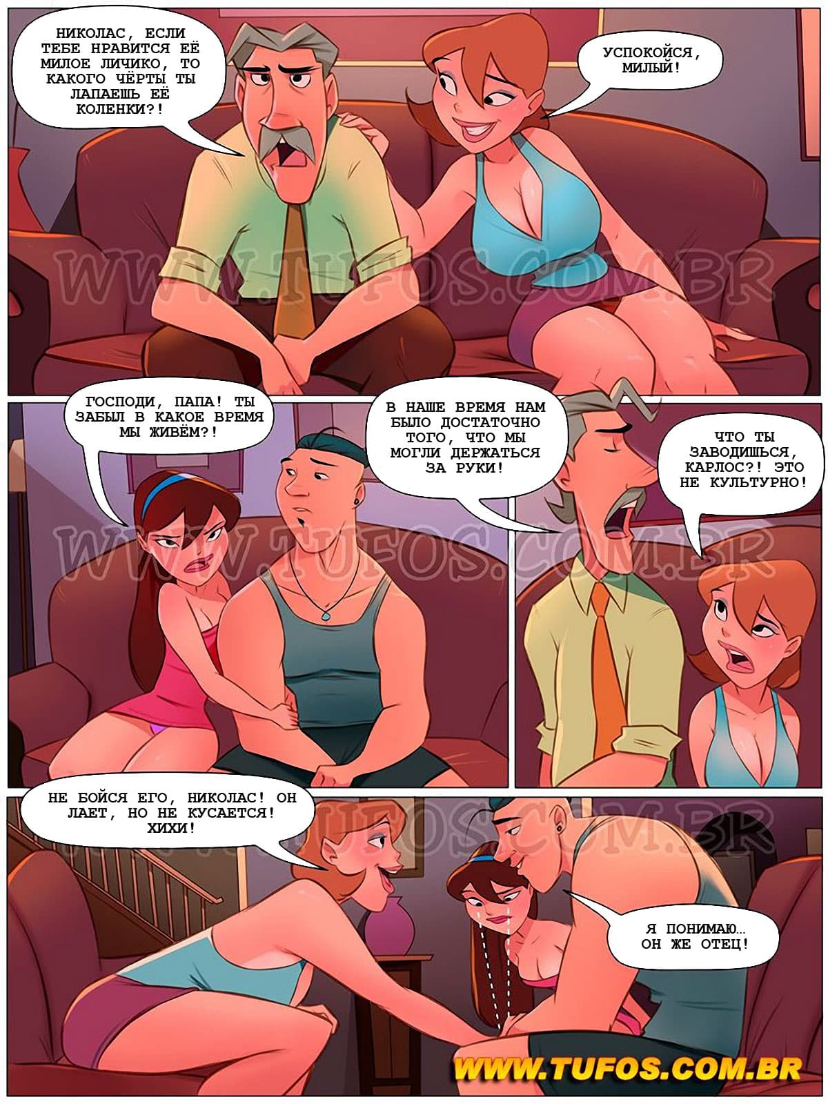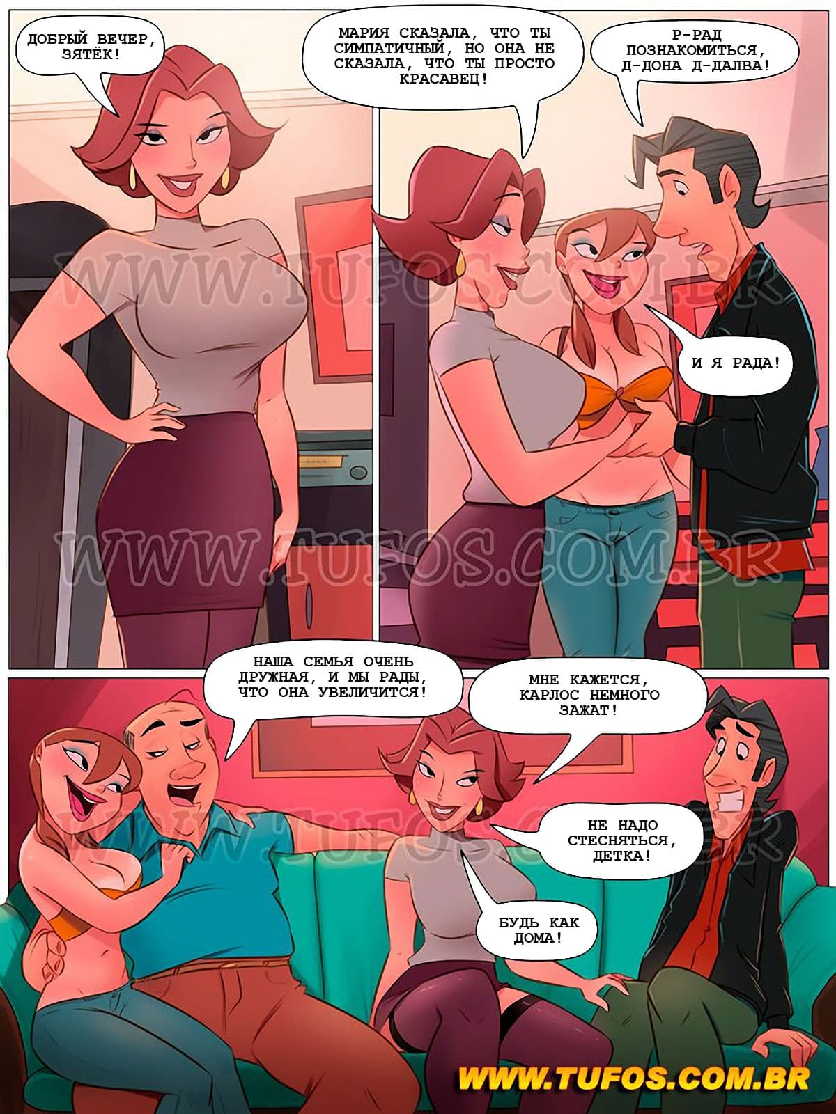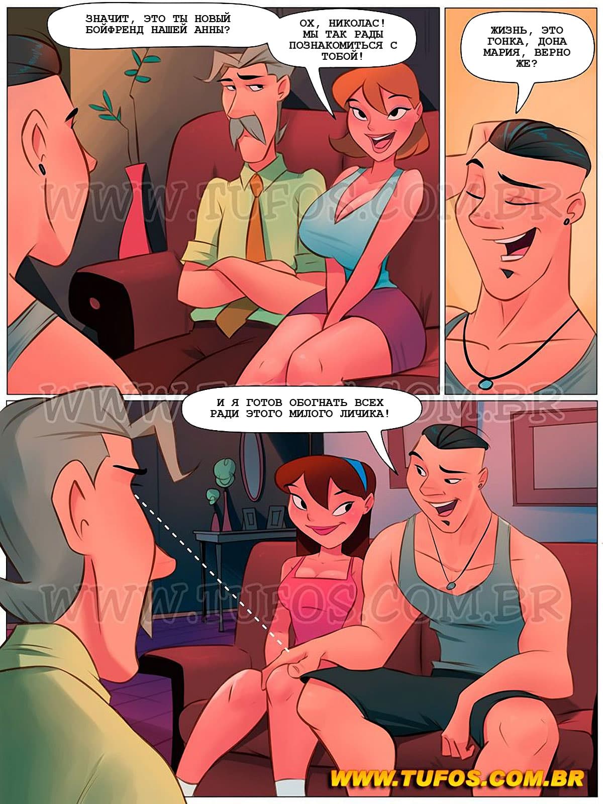 Анна привела в дом своего нового жениха, и когда жених, сидя на диване стал поглаживать голые коленки Анны, сеньор Карлос возмутился такой распущенности своего будущего зятя. Но жена Карлоса отвела его в сторону и напомнила, как в своё время, когда она знакомила его со своими родителями, это знакомство закончилось групповухой…