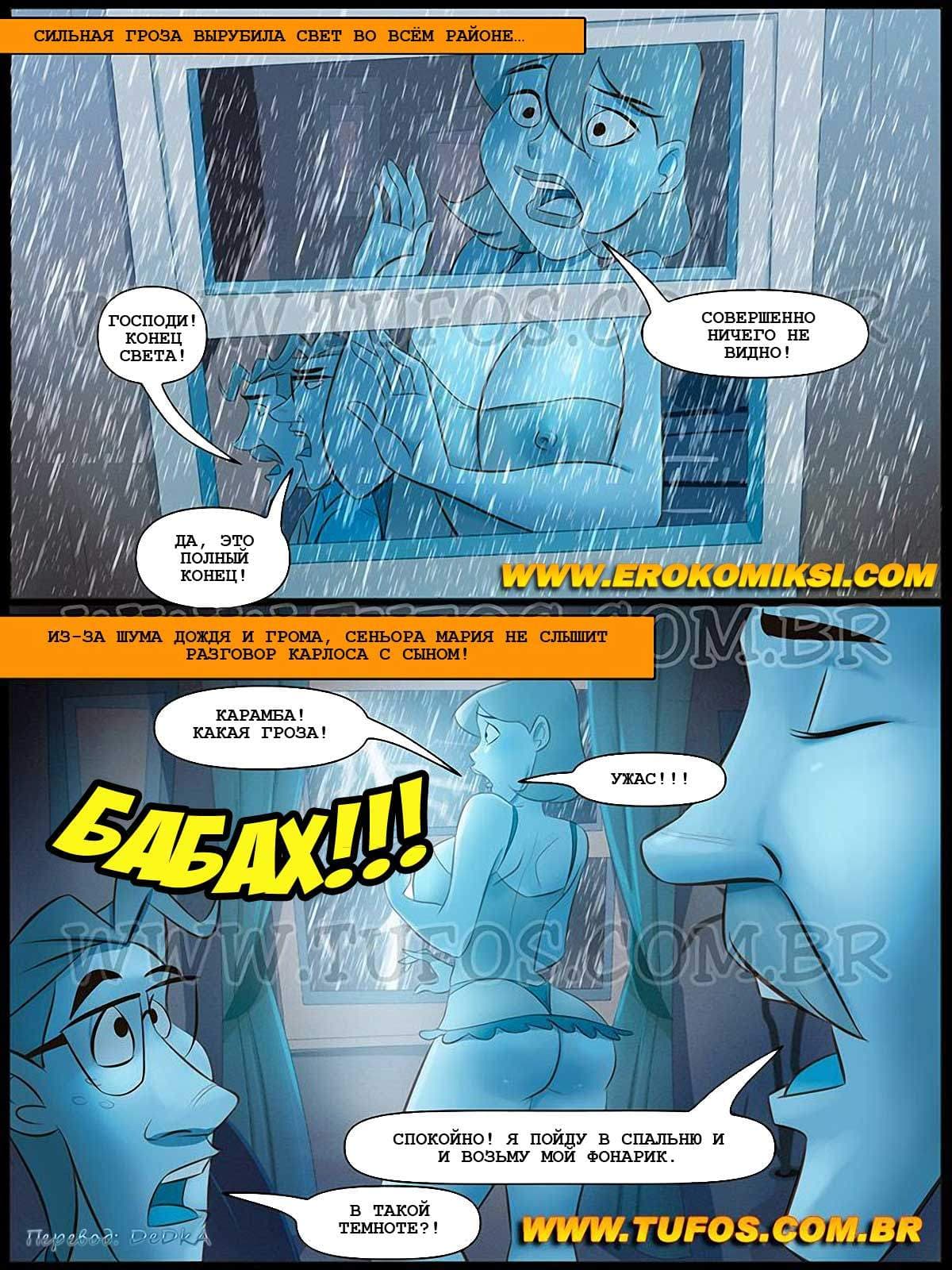 Порно комикс Похотливая семейка в 42 части расскажет о том, что распутство похотливого семейства Развратос переполнило чашу всяческого терпения, и разверзлись над ними хляби небесные! И зазвучали громы грозные, и огненные молнии посыпались на их головы! Но им эта беда, как с гуся вода. Главное, что электричество вырубилось, а это то, что надо, чтобы трахаться в кромешной тьме, даже не разбираясь, кто с кем…
