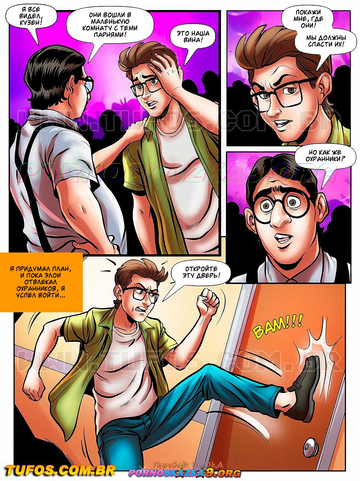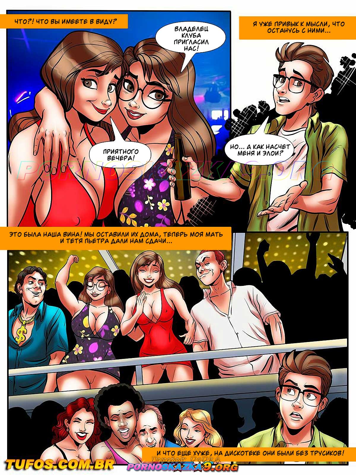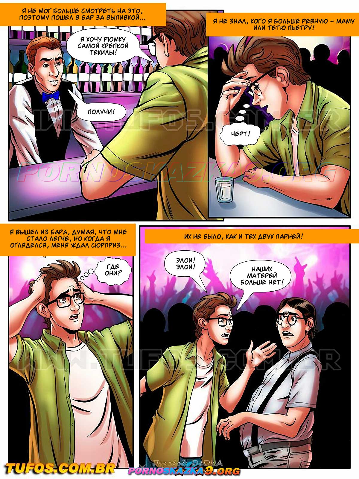 Порно комикс Похотливый ботан. Часть 19: В клубе без трусиков. Две мамаши милфы отправились в клуб со своими сыновьями и даже не надели трусики. Они привлекли внимание двух парней, которые выебали сучек в пизду и задницу на глазах главного героя.