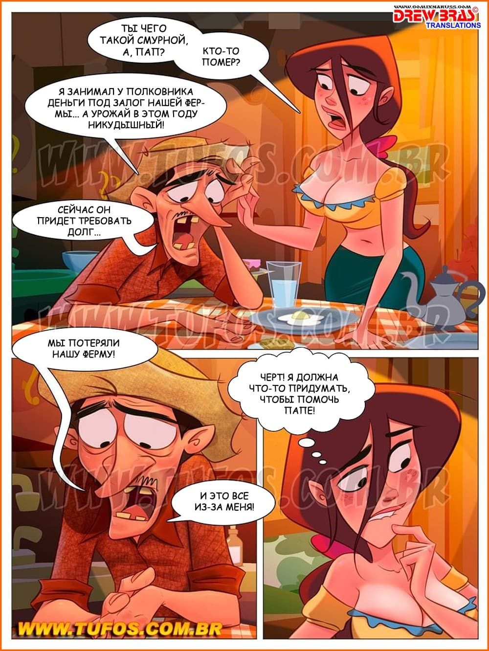Возбуждающие и развратные порно комиксы всегда радуют глаз. Вот и следующая часть об устоях в деревенской семейке поведает о новых приключениях ее членов. Так хороший день был омрачен тем, что сеньор Педрао был крайне расстроен. А все, потому что он брал деньги в долг у полковника Пистола под залог фермы. Вот только урожай был никудышным, и теперь платить по счетам просто нечем. Полковник Пистола долгов не прощает и обязательно отберет ферму. Но тут, Ритинья, узнав о проблеме, решила взять удар на себя. Точнее заплатить полковнику по счетам, только не деньгами, а своим роскошным и аппетитным телом.