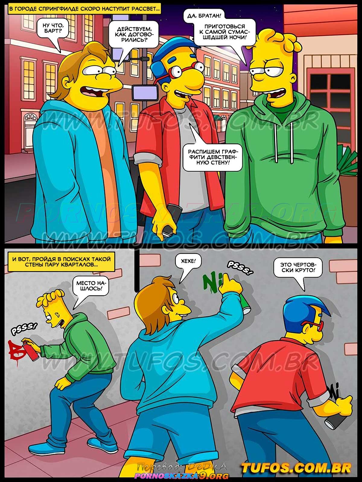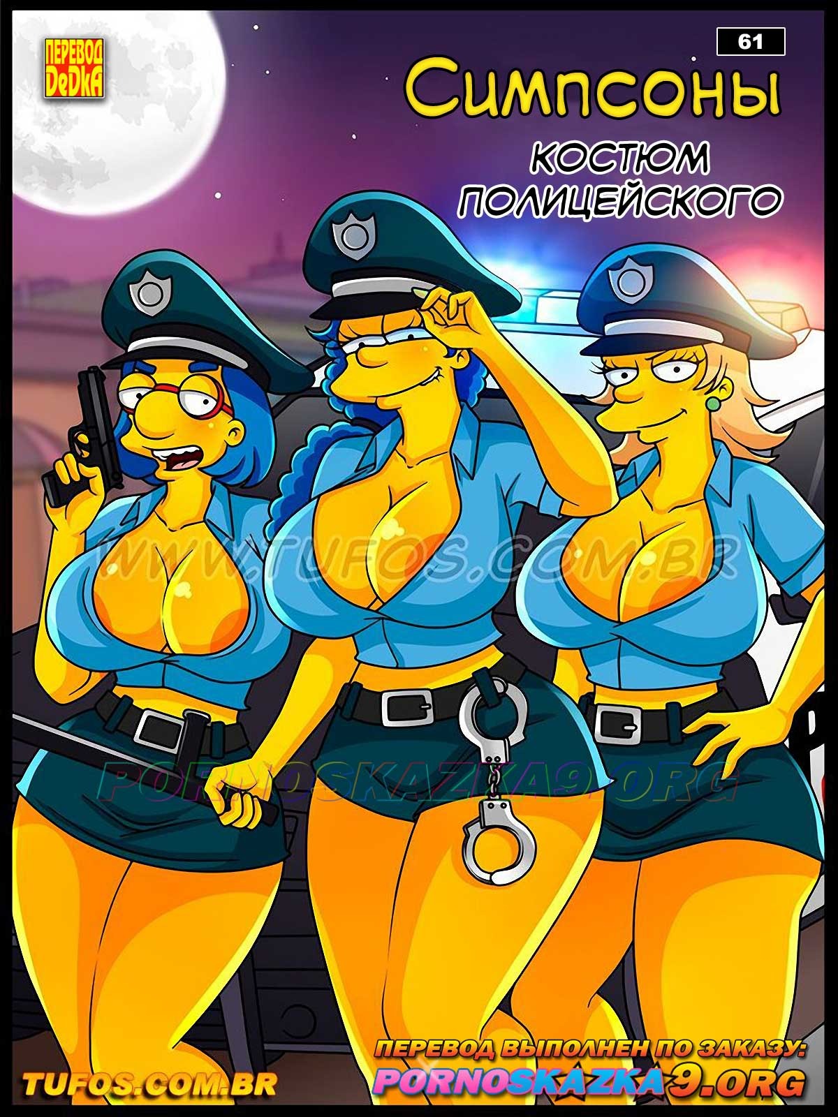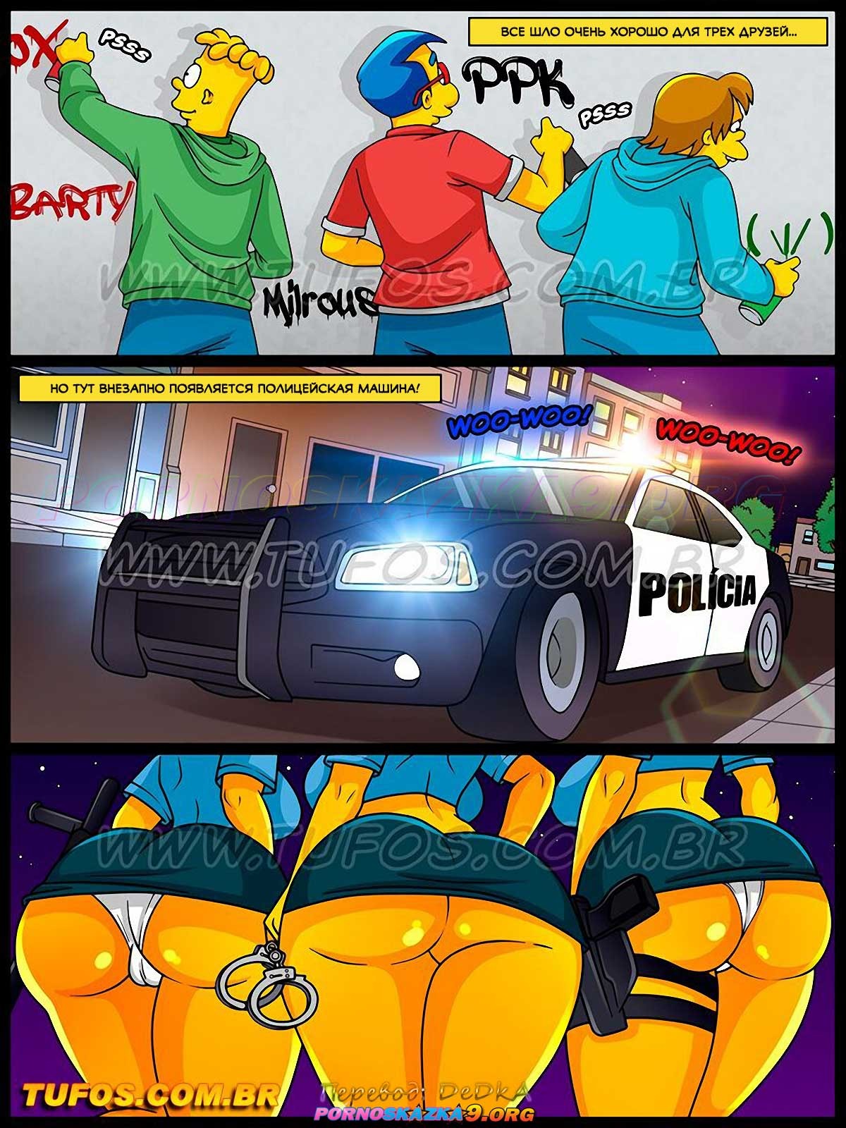 Порно комикс Симпсоны. Часть 61: Костюм полицейского. Ранним утром в Спрингфилде Барт, Милхауз и Нильсон отправляются рисовать граффити на «девственных» стенах района… Все шло хорошо, пока на месте преступления не появилась полицейская машина! Из машины выходят трое горячих копов и начинают тщательный досмотр нарушителей…