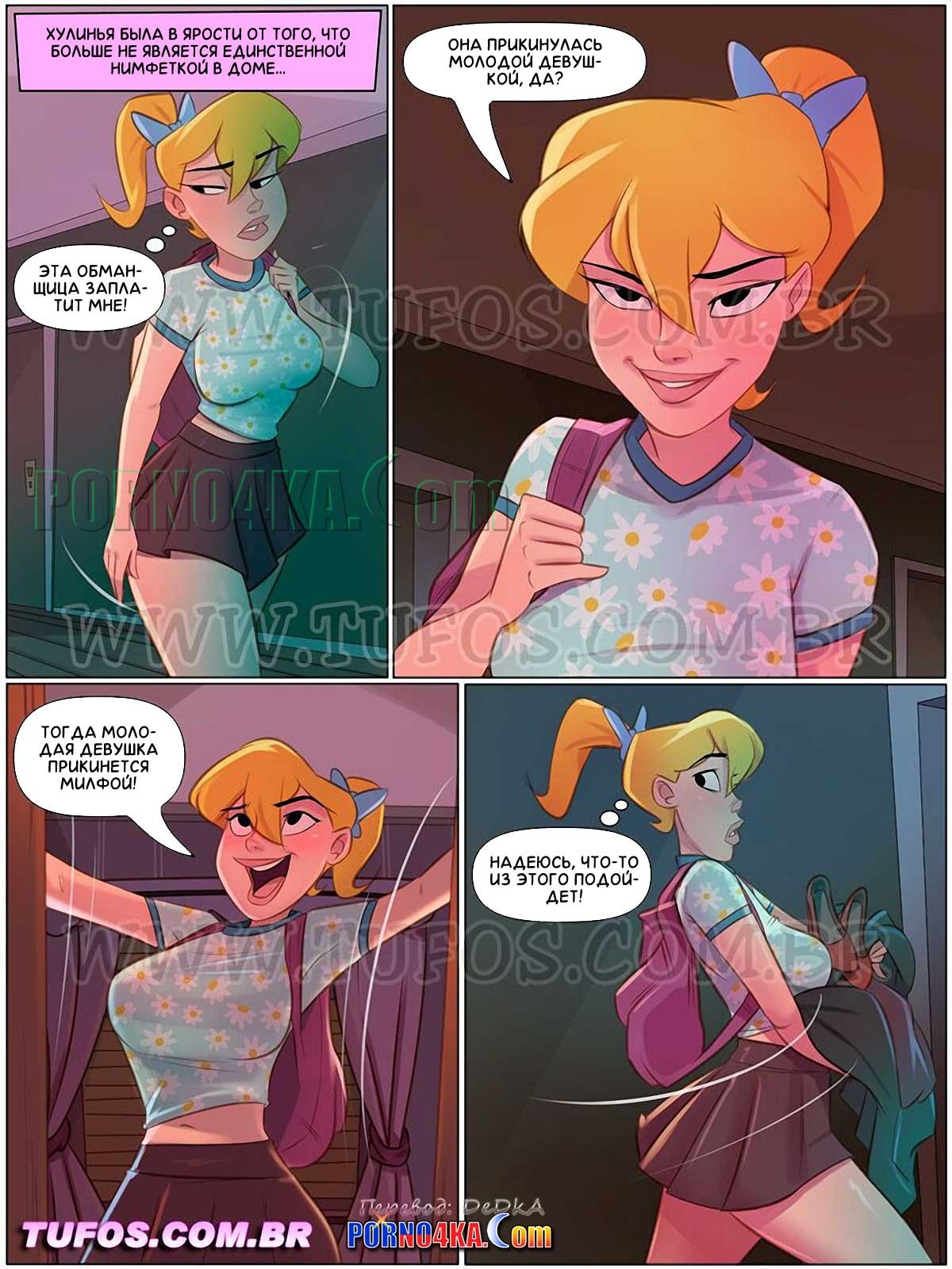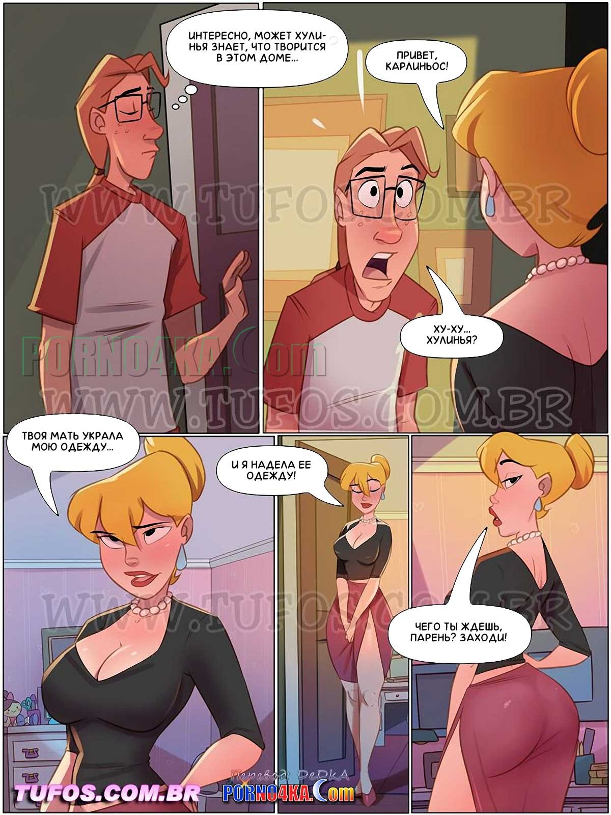 Порно комикс Четверо похотливых. Часть 9: Подмена. Эпизод 2. Хулинья только что застала дону Марию в одежде нимфетки… Разозлившись, девушка крадет несколько предметов одежды доны Марии. Одевшись, как горячая милфа, она ждет прихода Карлиньоса, чтобы проверить соблазнительную силу зрелой знойной женщины…