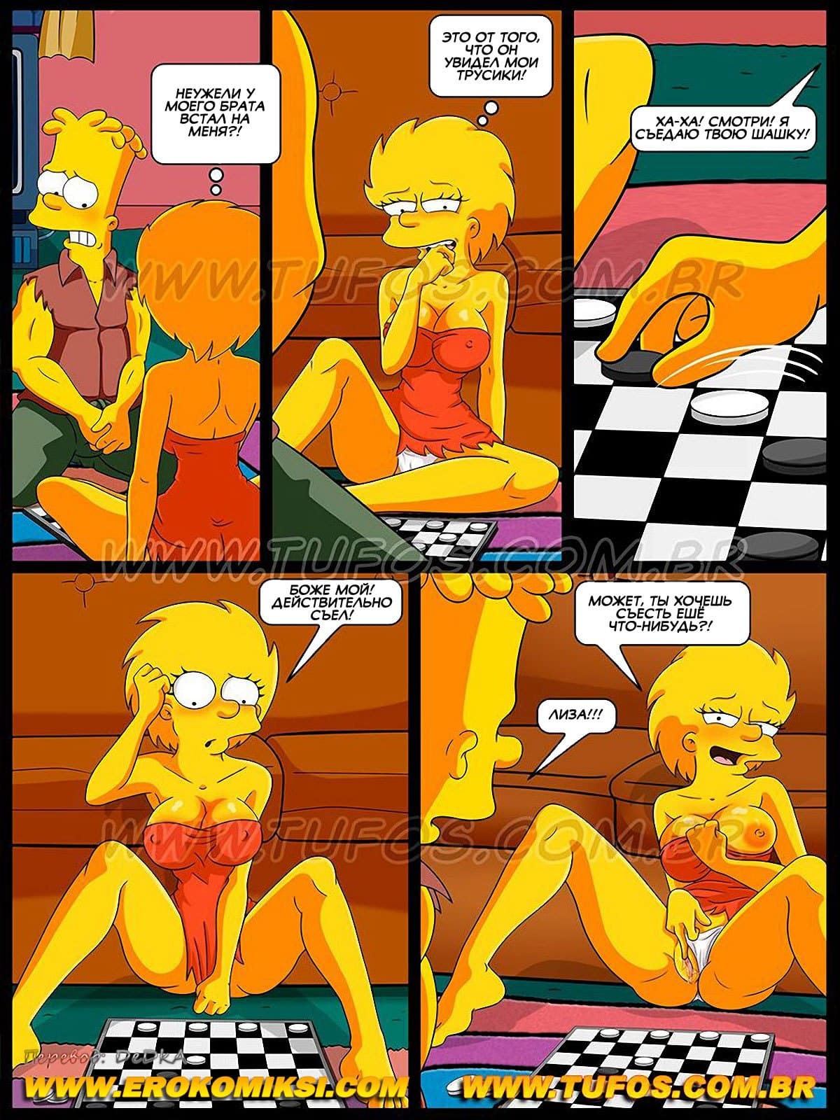 Порно комикс «Симпсоны. Часть 3: Игра в шашки». После обеда в семействе Симпсонов встал вопрос о том, кто должен мыть посуду. Мэгги сказала, что она вчера мыла. Гомер икнул и сказал, что он обожрался и не может ничего делать. Остались Барт и Лиза. Каждый из них стал кричать, что сегодня не его очередь. И тогда Мардж предложила Лизе и Барту сыграть в шашки. Кто проиграет, тот и моет…
