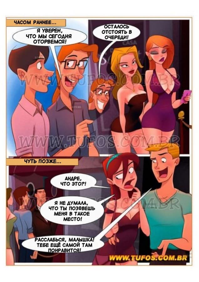 Порно комикс похотливая семейка вновь порадует очередной развратной историей, в которой всем ее членам надоело сидеть дома. Им захотелось развлечений. Анина ушла со своим парнем, Карлиньос с товарищем, а дона Мария со своим мужем. Сами того не зная, все они все очутились в одном ночном клубе, где с надетыми на лица масками можно было творить любые сексуальные шалости…