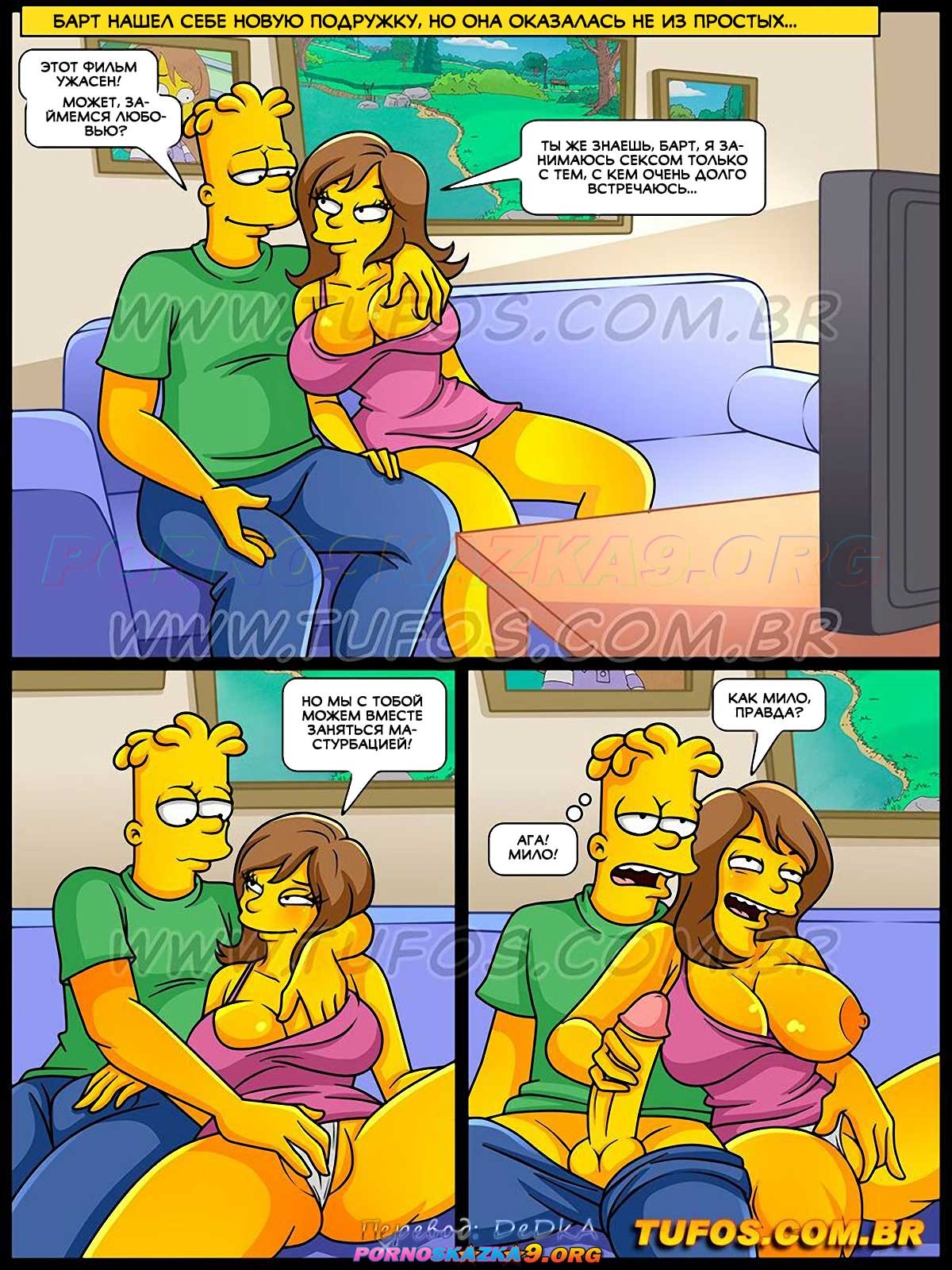 Порно комикс Симпсоны. Часть 62: Мама моей девушки. Барт нашел себе новую подружку, но она оказалась не из простых! Дженнифер разрешила ему только совместную мастурбацию, но, кончив, уснула, оставив своего парня без внимания. Разозлившись, Барт ушел со стояком и по дороге столкнулся с мамой Дженнифер…