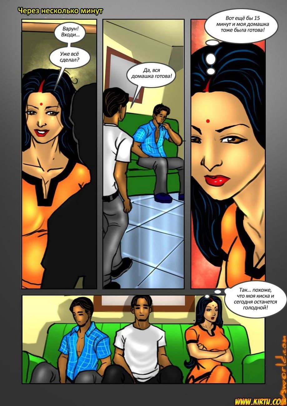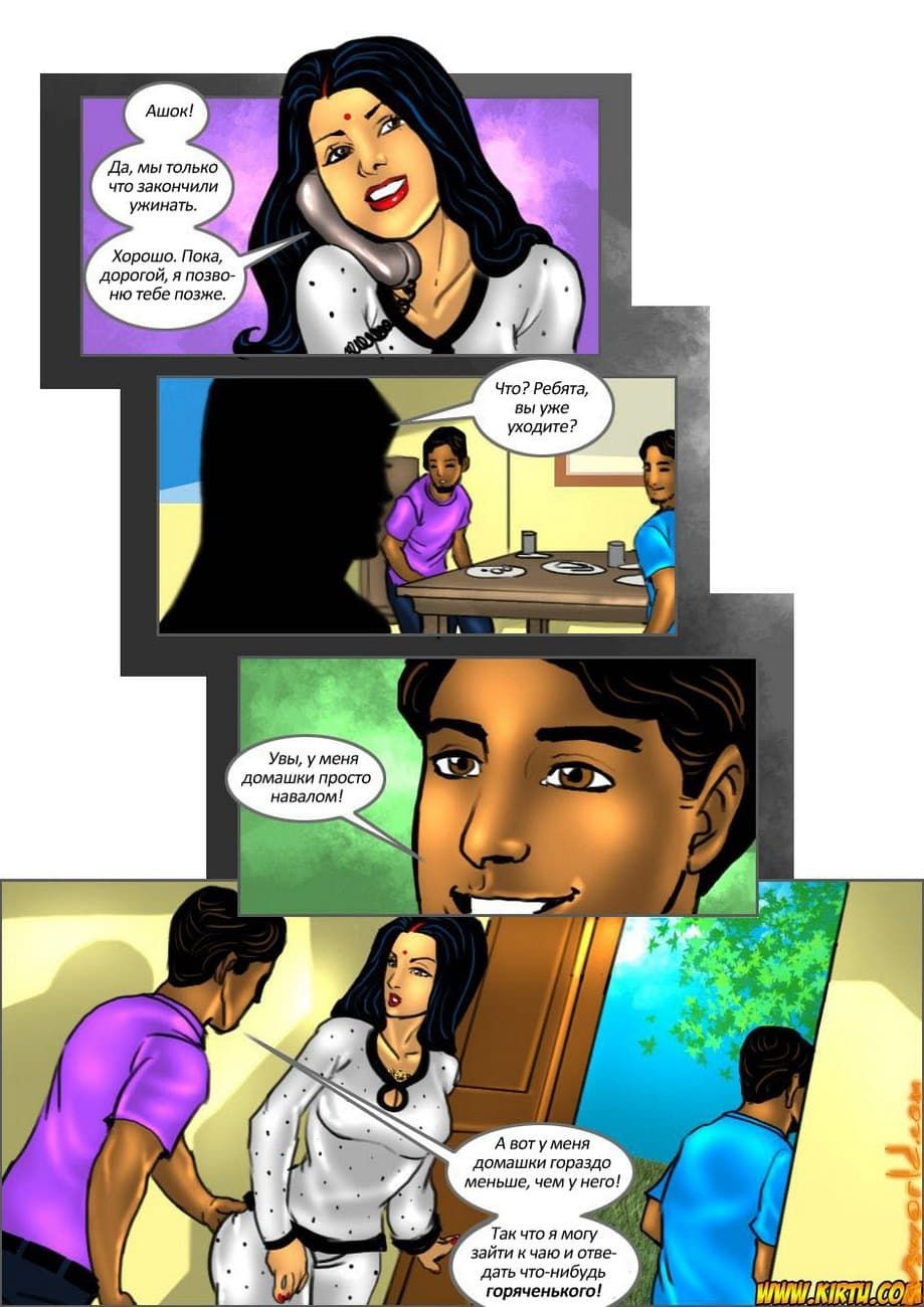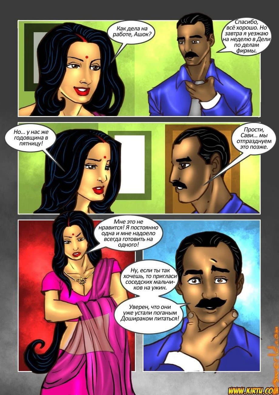 Сексуальное знакомство с соседними мальчишками для Савиты не закончилось. Муж Ашок уезжает в командировку, и наивно просит парней помочь своей жене в ее делах, ну а те, естественно согласились. Еще бы, целую неделю они будут сношать красивую зрелую соседку, которая позволяет им все, что угодно. Смотрите данную часть рисованного порнокомикса и получайте удовольствие.