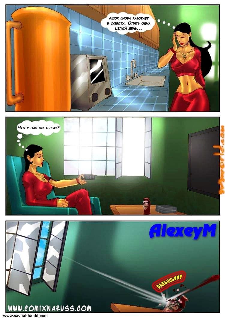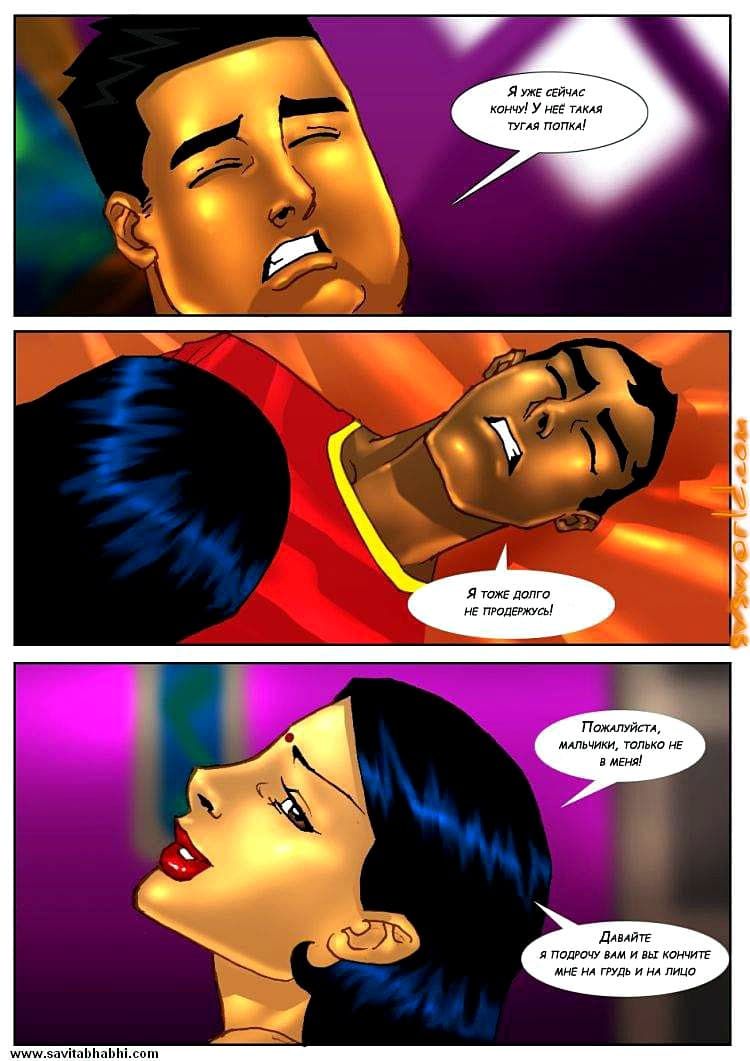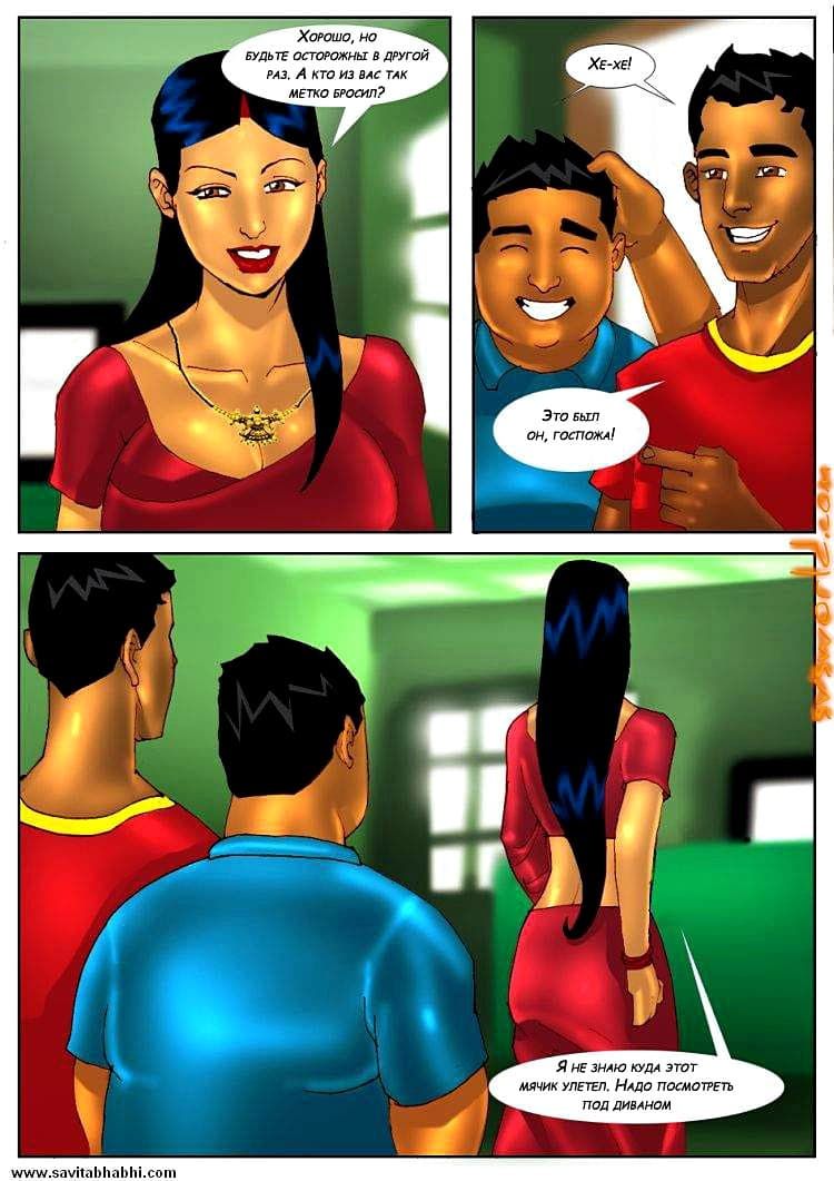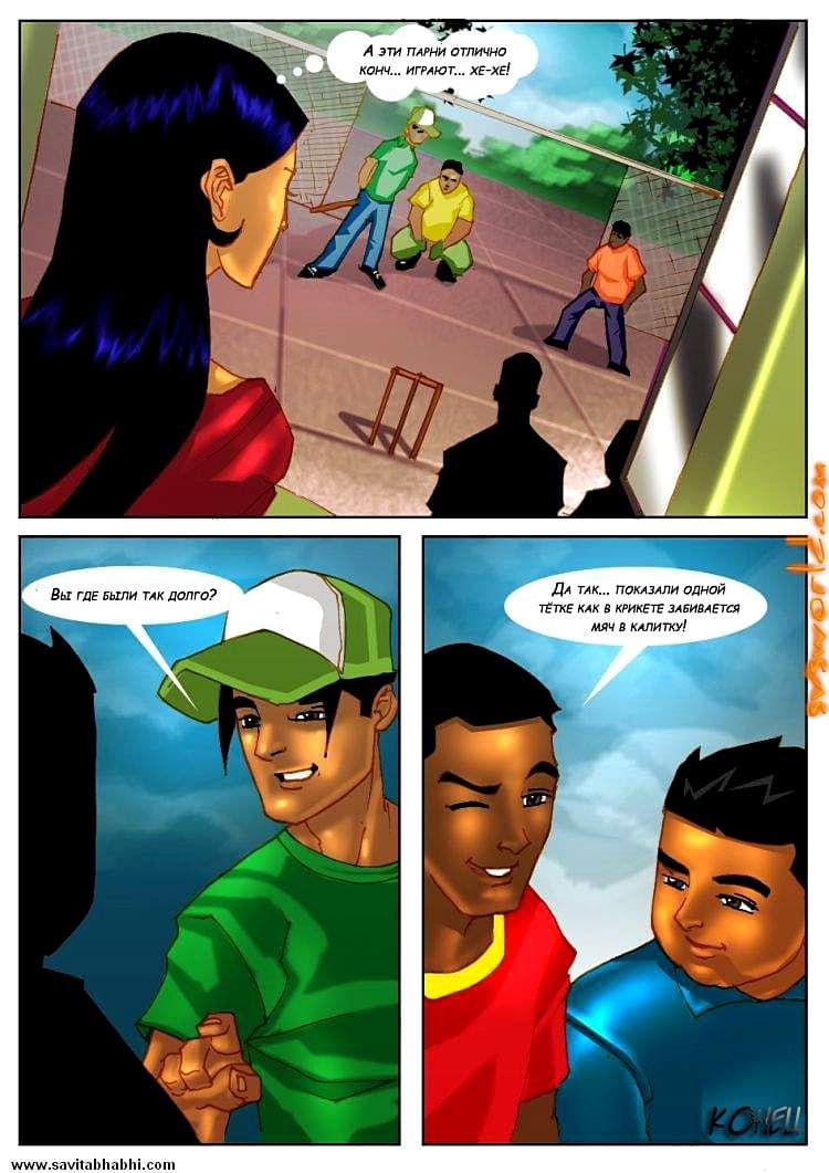 И так перед вами вторая рисованая эротическая история о восхитительной женщине по имени Савита. Сегодня суббота – долгожданный выходной, но даже сегодня мужу нашей героини Ашоку приходится находиться на работе. Савита опять начинает откровенно скучать и думает о любовных утехах. Вдруг в ее окно влетает мяч от крикета, в который играли соседские пацаны. Женщина решает пофлиртовать с ними, когда они приходят к ней с просьбой вернуть мячик. Она обратилась к ним с предложением подать ей вещи с верхних полок шкафа. При этом она так сексуально себя вела, что тут же завела озабоченных молодых людей. Смотрите комикс дальше, и вы не пожалеете…