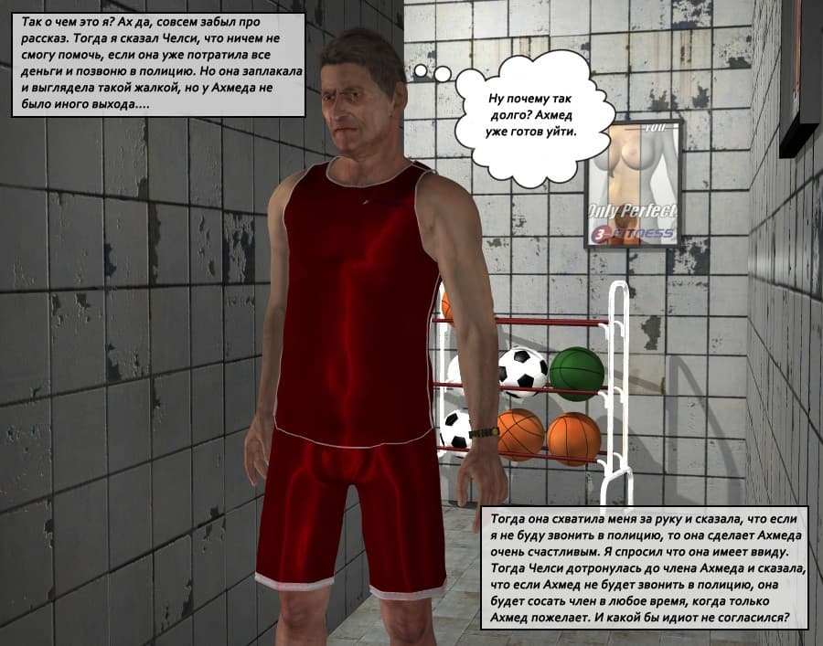 В этом комиксе речь пойдет о владельце спортивного зала по имени Ахмед Азис и его работнице — 18 — летней девушке, которая убирает зал и раздевалки. Дело в том, что Челси (так зовут девушку) проворовалась, украв деньги из кассы, принадлежащие Азису, и за это тот поставил ее перед выбором, либо периодический ей придется трахаться с ним, когда он этого захочет, или пиши пропало, и он звонит в полицию. Челси выбрала первый вариант, подставляя все свои молодые и тугие отверстия. Ей пришлось испытать много унижений и испробовать большие порции спермы, а как это было вы увидите из этого онлайн 3d порно комикса.