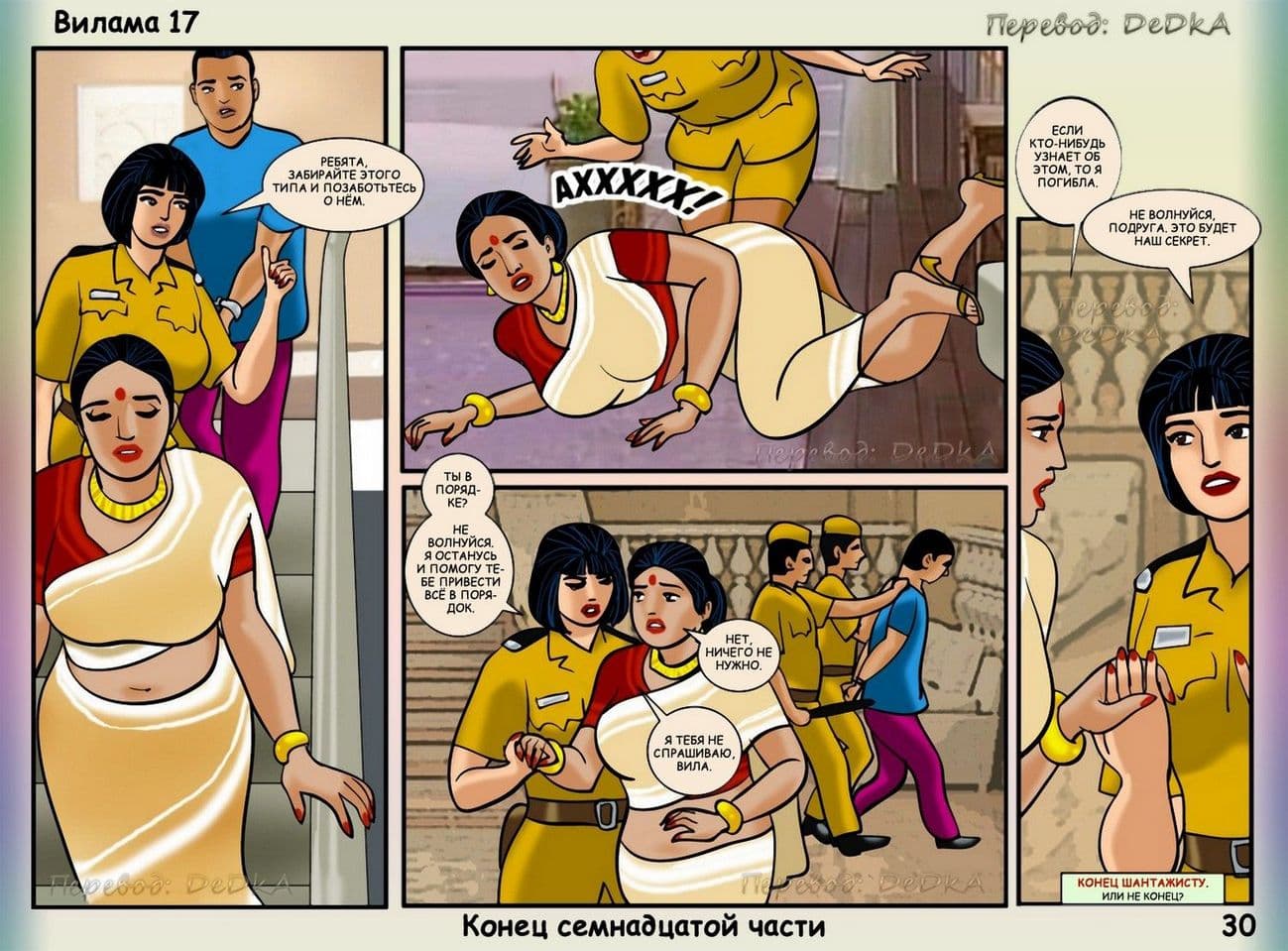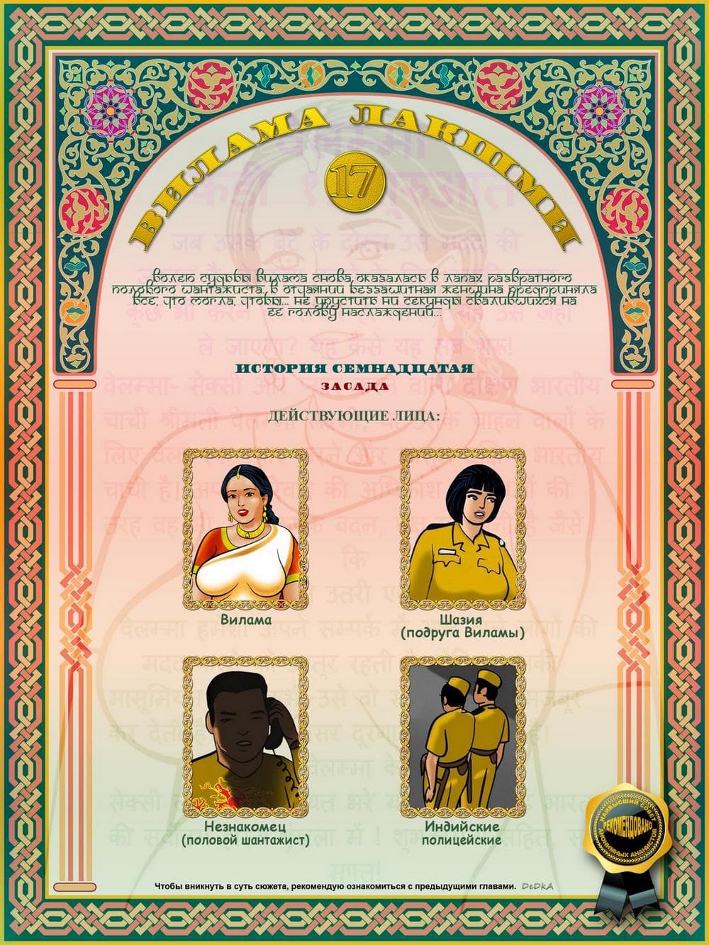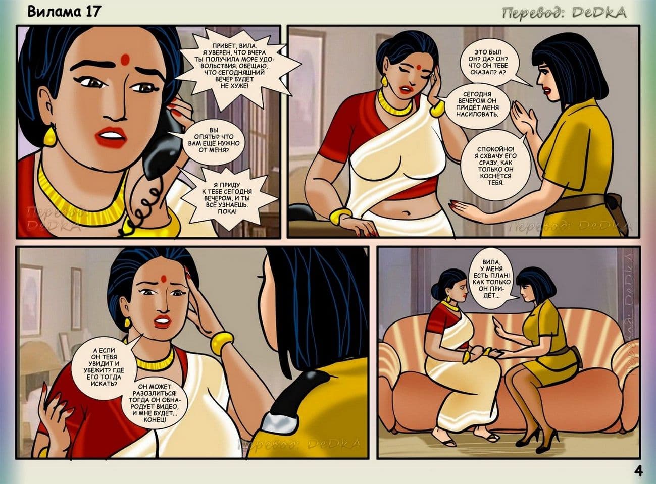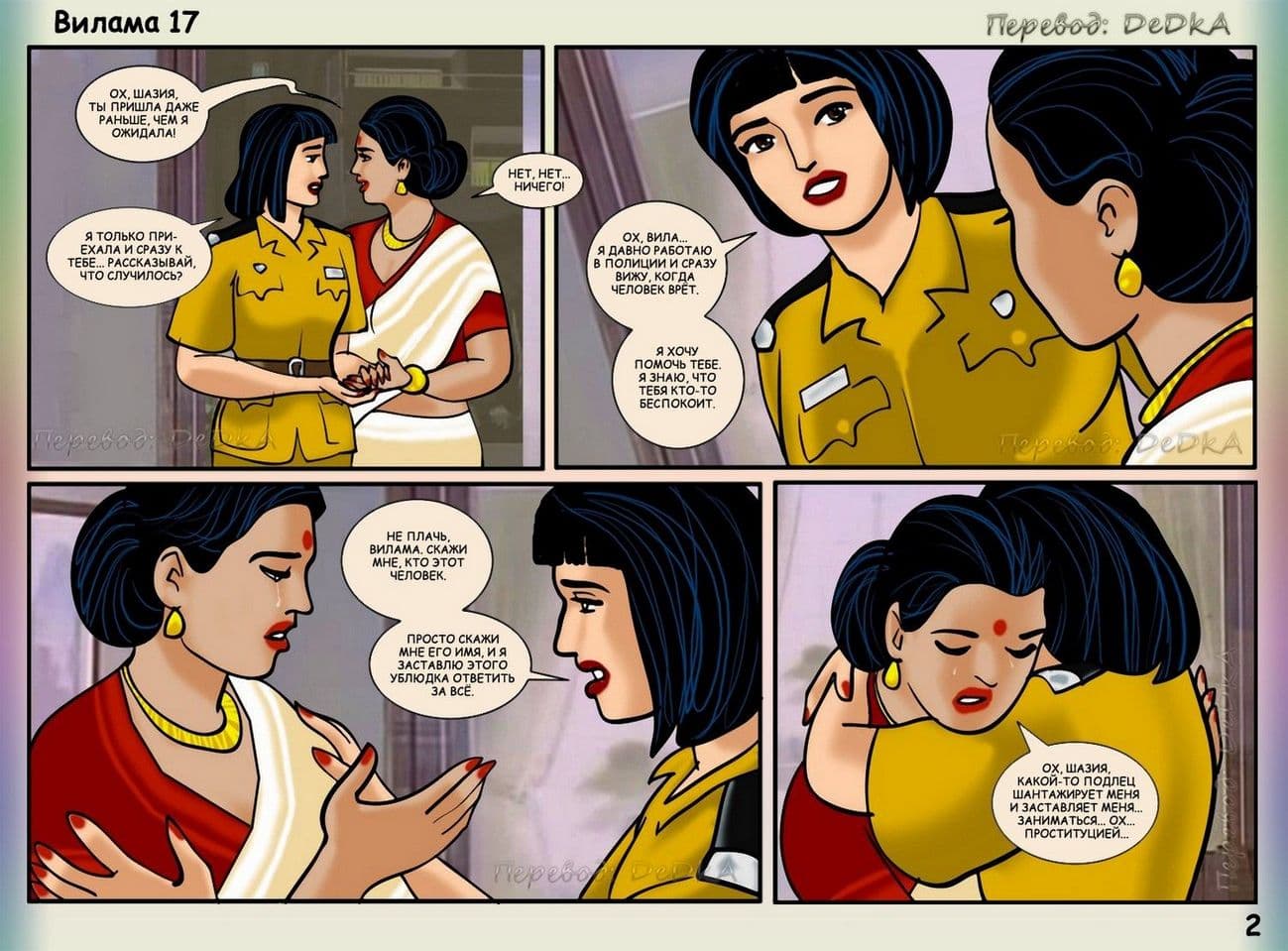 В продолжении рисованного порнокомикса о Виламе речь пойдет о том, как наша благоверная и наивная героиня не находит себе места, от тревожных раздумий, из – за подлого сексуального шантажиста. Этот негодяй делает из порядочной и обворожительной взрослой женщины обычную дешевую проститутку. С этим надо, что — то делать. Вилама обращается за помощью к своей подруге по имени Шазия, которая работает в местной полиции. Добрая знакомая нашей обожаемой Виламы Лакшми обещает принять все меры для поимки озабоченного вымогателя и отправить его очень надолго за решетку. Сказано – сделано, и у дома зрелой женщины была выставлена засада. Но все же сексуальный террорист проник в дом, и потребовал от Виламочки жесткого траха во все ее дырочки. У Виламы не оставалось выбора, как только подчиниться, но только для того, чтобы хитрого ебаря поймали.