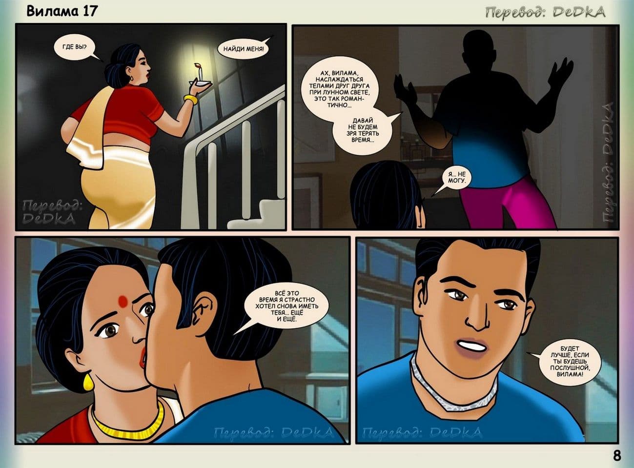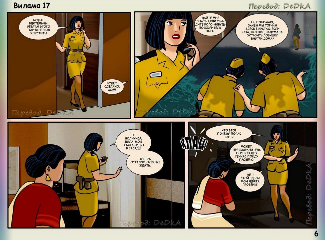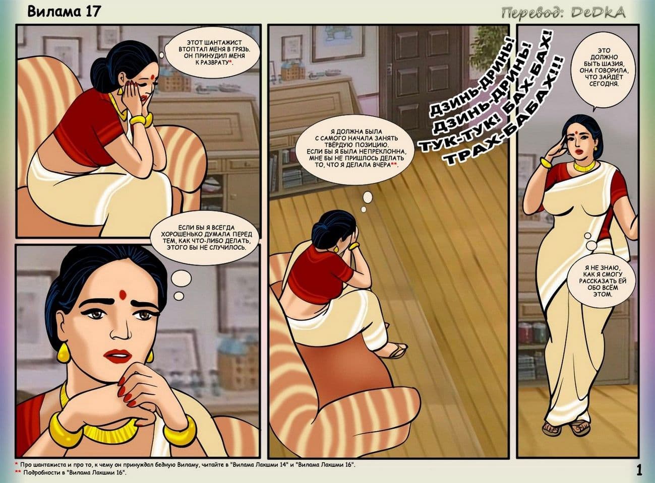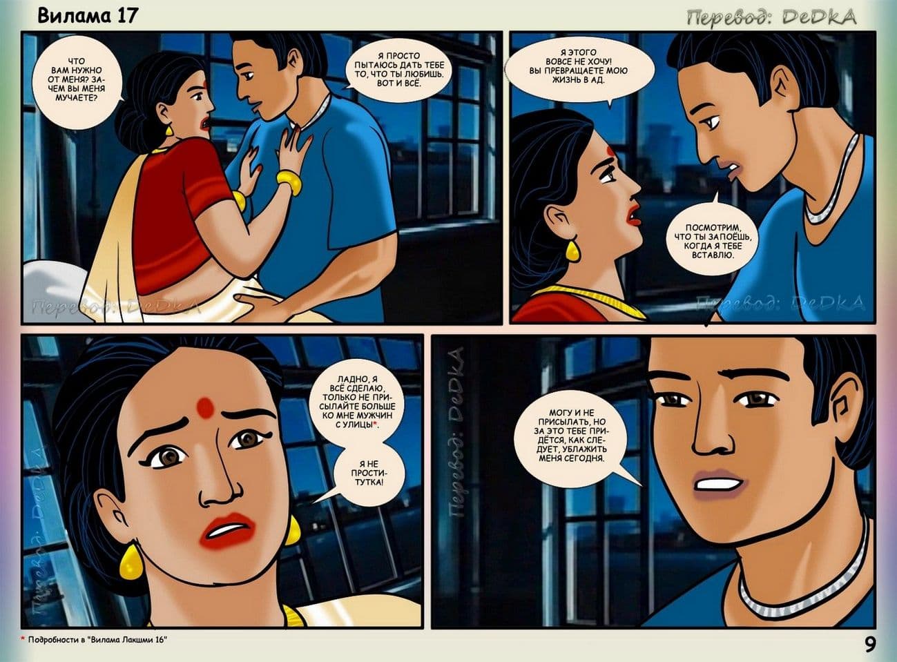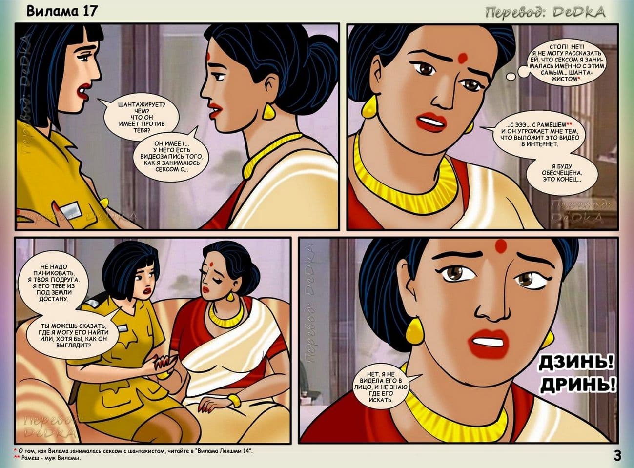 В продолжении рисованного порнокомикса о Виламе речь пойдет о том, как наша благоверная и наивная героиня не находит себе места, от тревожных раздумий, из – за подлого сексуального шантажиста. Этот негодяй делает из порядочной и обворожительной взрослой женщины обычную дешевую проститутку. С этим надо, что — то делать. Вилама обращается за помощью к своей подруге по имени Шазия, которая работает в местной полиции. Добрая знакомая нашей обожаемой Виламы Лакшми обещает принять все меры для поимки озабоченного вымогателя и отправить его очень надолго за решетку. Сказано – сделано, и у дома зрелой женщины была выставлена засада. Но все же сексуальный террорист проник в дом, и потребовал от Виламочки жесткого траха во все ее дырочки. У Виламы не оставалось выбора, как только подчиниться, но только для того, чтобы хитрого ебаря поймали.