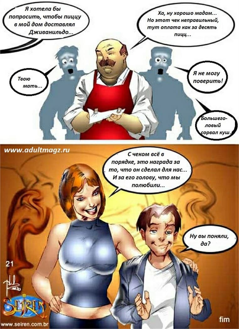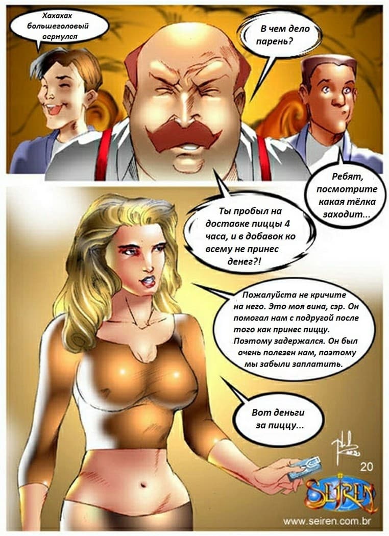 Возбуждающее рисованное порно о доставщике пиццу В один прекрасный день он принес заказ двум сексапильным женщинам, которые захотели с ним пошалить, но когда они увидели его член, то жадно набросились на него. Жаркое анальное порево было обеспечено.