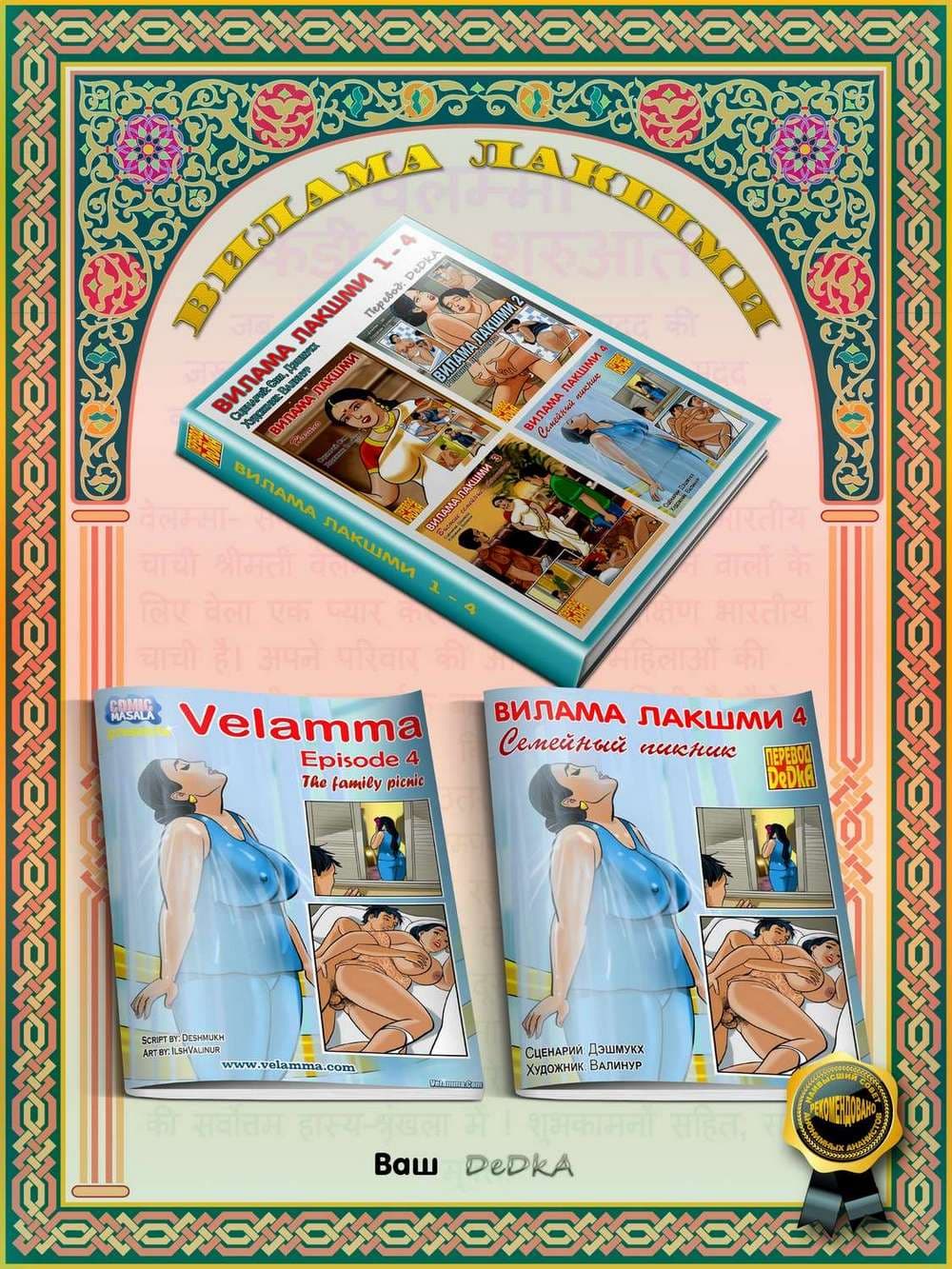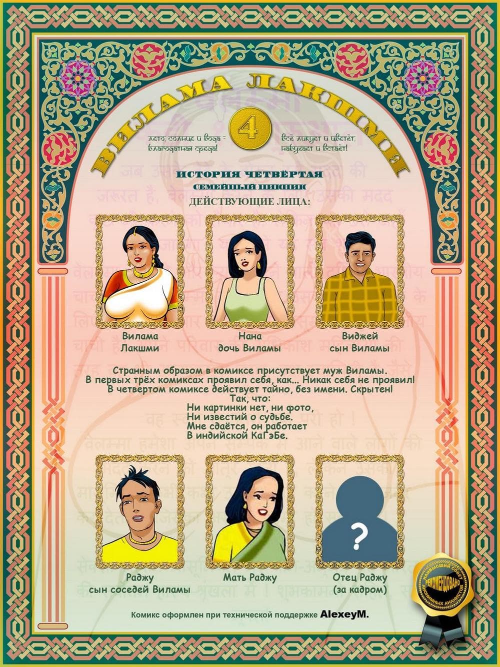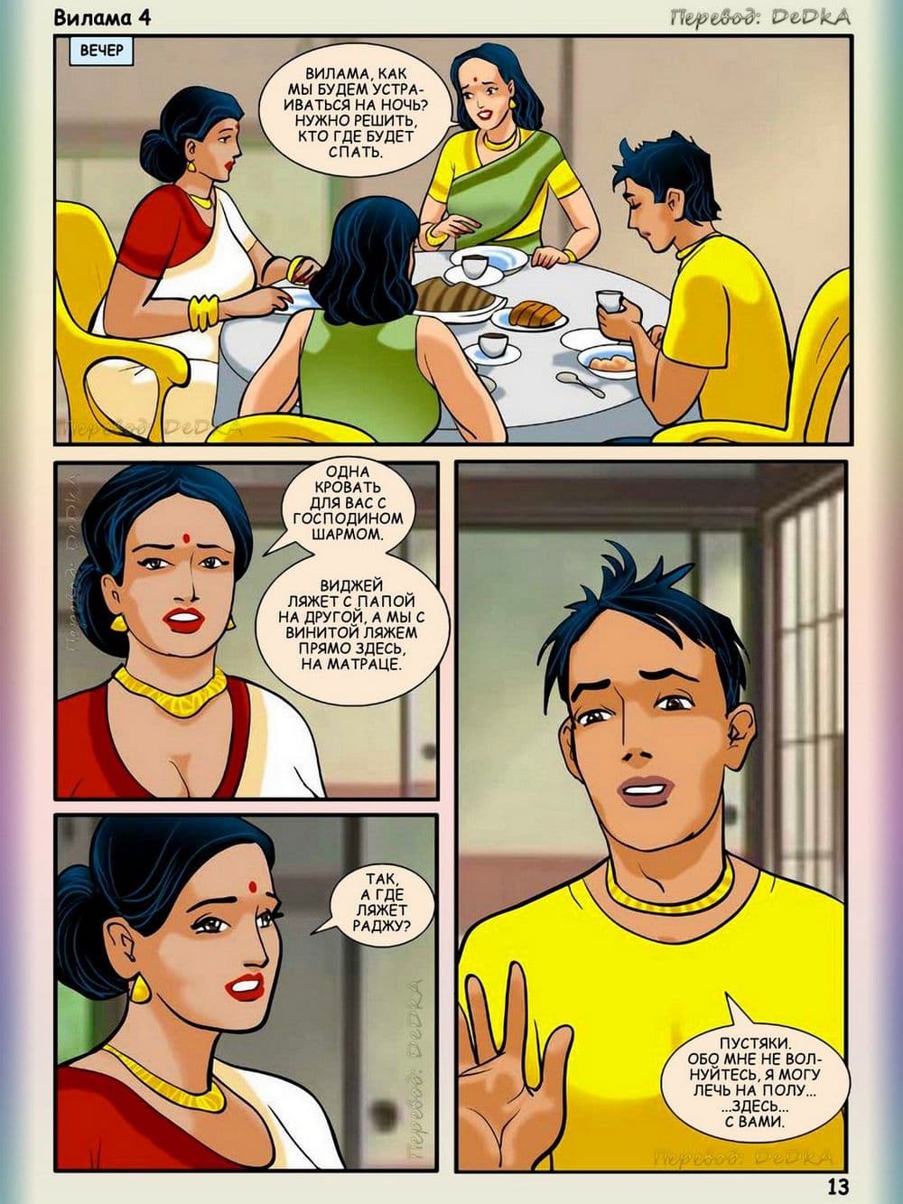 В этом порно эротическом комиксе для взрослых действие происходит одним прекрасным жарким летним днем. Две индийские семьи — соседи собрались вместе, чтобы устроить пикник, Добрая и красивая Вилами была в преддверии того, что приятно проведет этот день, а сын семьи друзей по имени Раджу был в восторге, и состоянии очень сильного возбуждения, когда увидел все, четко выдающиеся подробности сексуального тела своей взрослой соседки Вилами. Весь день озабоченный подросток искал нужный момент, чтобы коснуться тела обворожительной женщины, он подглянул за ней, когда зрелая женщина переодевалась после купания, и не выдержав неутолимого напряжения в паху кончил от увиденного. Постепенно наступила ночь, и на везение и счастливый случай возбужденного Раджу он смог спать рядом в одной постели с обожаемой Виламой. В голове сексуально – озабоченного юнца тут же созрел хитрый план траха с добропорядочной и наивной женщиной. Раджу потихоньку начинает щупать Виламу, пока та спит. А взрослая большегрудая Вилама, пребывает в растерянности от того, когда почувствовала наглые руки и твердый член подростка. Как же она поступит? Ответ на этот вопрос вы узнаете из четвертой истории про индийскую женщину.