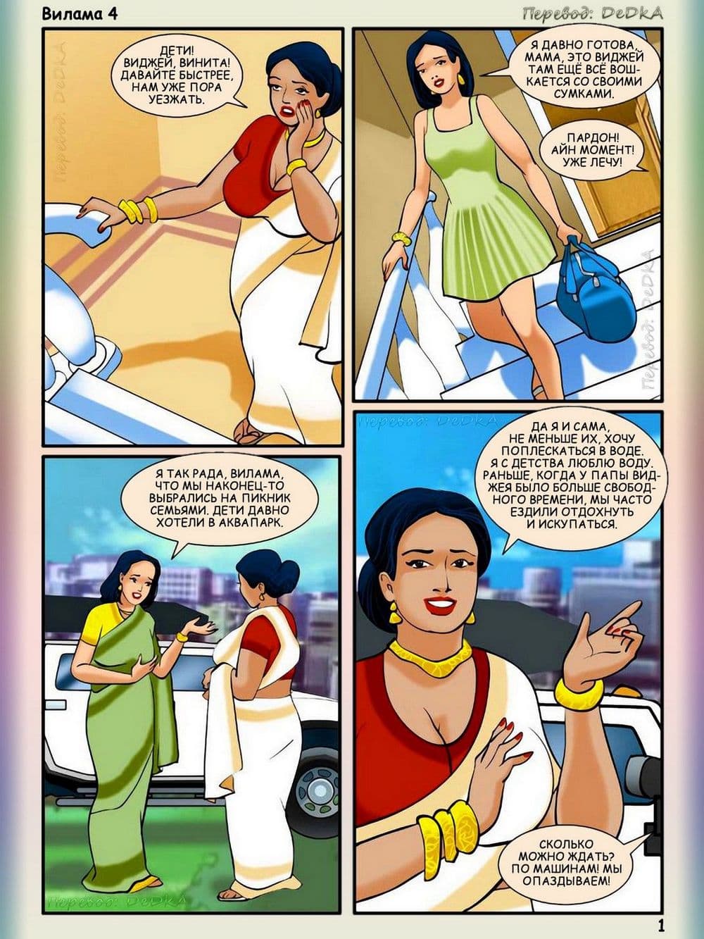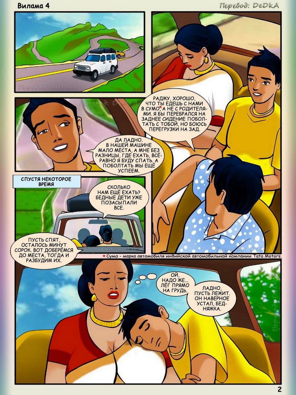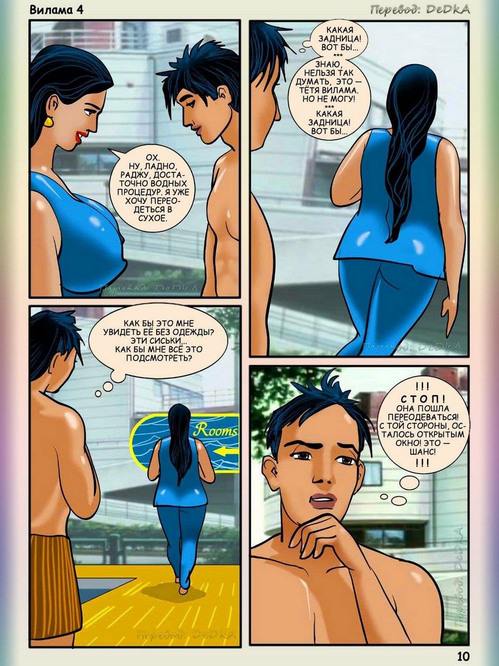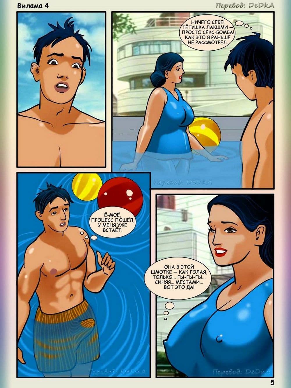 В этом порно эротическом комиксе для взрослых действие происходит одним прекрасным жарким летним днем. Две индийские семьи — соседи собрались вместе, чтобы устроить пикник, Добрая и красивая Вилами была в преддверии того, что приятно проведет этот день, а сын семьи друзей по имени Раджу был в восторге, и состоянии очень сильного возбуждения, когда увидел все, четко выдающиеся подробности сексуального тела своей взрослой соседки Вилами. Весь день озабоченный подросток искал нужный момент, чтобы коснуться тела обворожительной женщины, он подглянул за ней, когда зрелая женщина переодевалась после купания, и не выдержав неутолимого напряжения в паху кончил от увиденного. Постепенно наступила ночь, и на везение и счастливый случай возбужденного Раджу он смог спать рядом в одной постели с обожаемой Виламой. В голове сексуально – озабоченного юнца тут же созрел хитрый план траха с добропорядочной и наивной женщиной. Раджу потихоньку начинает щупать Виламу, пока та спит. А взрослая большегрудая Вилама, пребывает в растерянности от того, когда почувствовала наглые руки и твердый член подростка. Как же она поступит? Ответ на этот вопрос вы узнаете из четвертой истории про индийскую женщину.