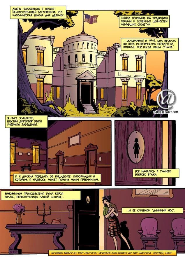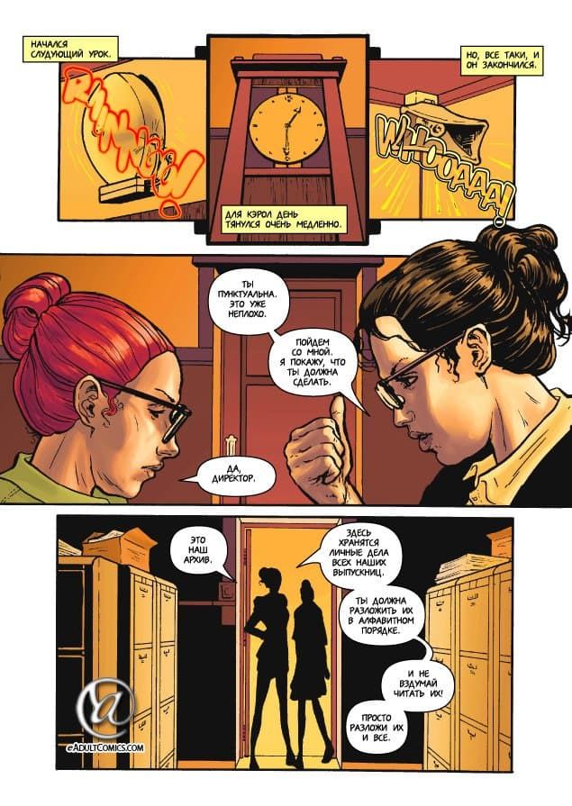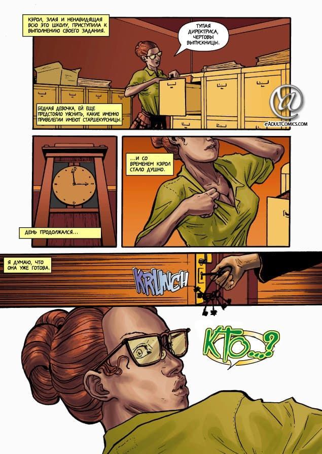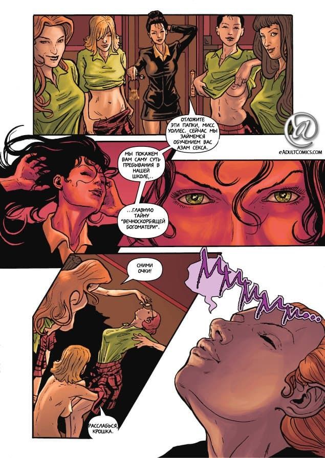 В католический и целомудренный колледж приехала новенькая студентка Кэрол. Она была очень строгих правил, но в первый же день увидела, как другие постоялицы заведения устраивают сексуальные оргии с друг другом. Кэрол решила обо всем рассказать директору. За это ученицы захотели преподать урок новенькой. Чем все кончилось узнаете из этого порно комикса.