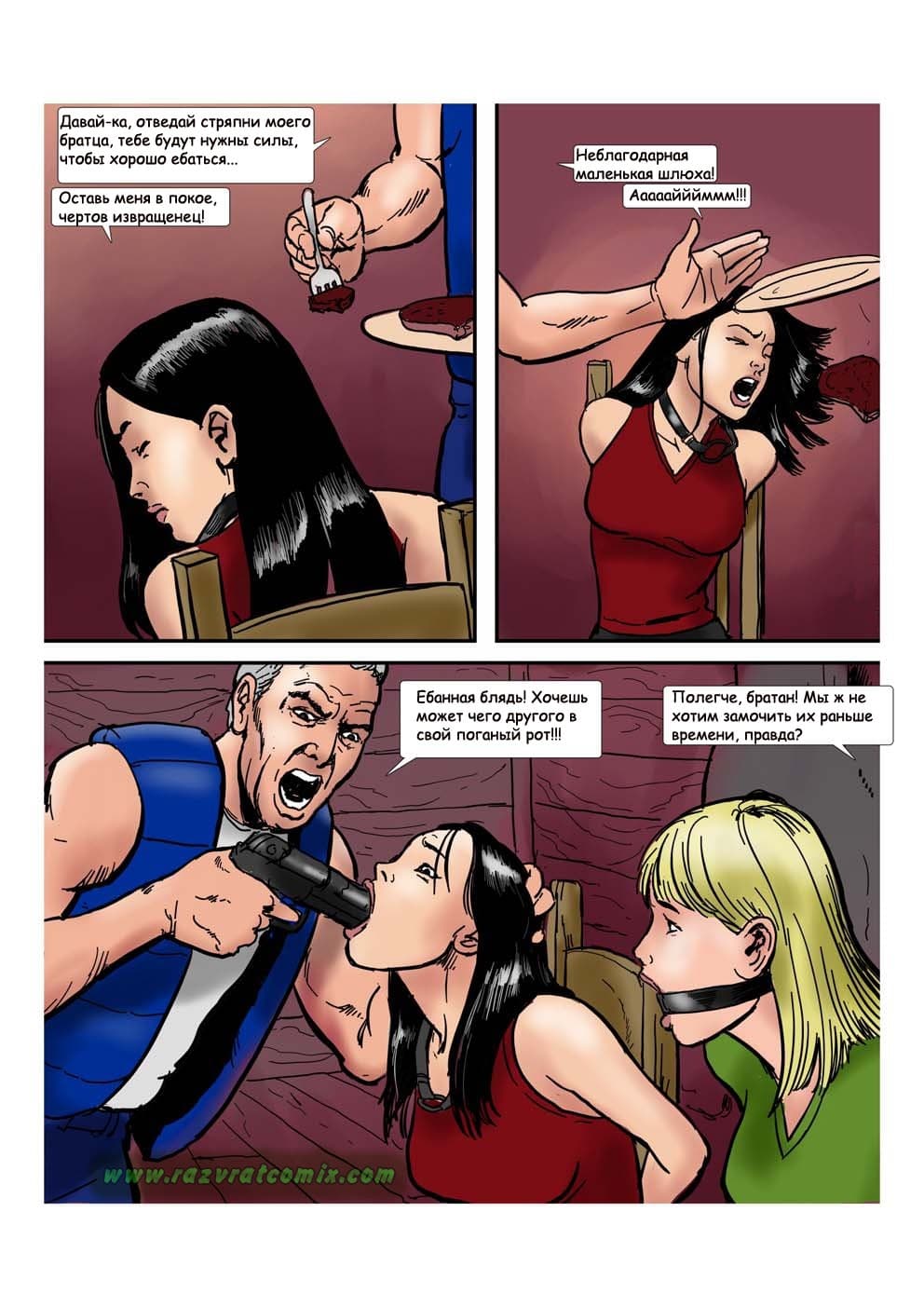 В этом комиксе рассказе пойдет речь о нескольких красивых и очень сексуальных девушках, которые пошли в поход в горы. По пути им встретился охотничий домик, в который они зашли, и найдя горячий шоколад, выпили его, после чего потеряли сознание. Вот тут и начинается жестокое порно. Наши девоньки очнулись в руках насильников, которые уже вытащили свои члены, чтобы запихать их в тугие горячие дырочки.