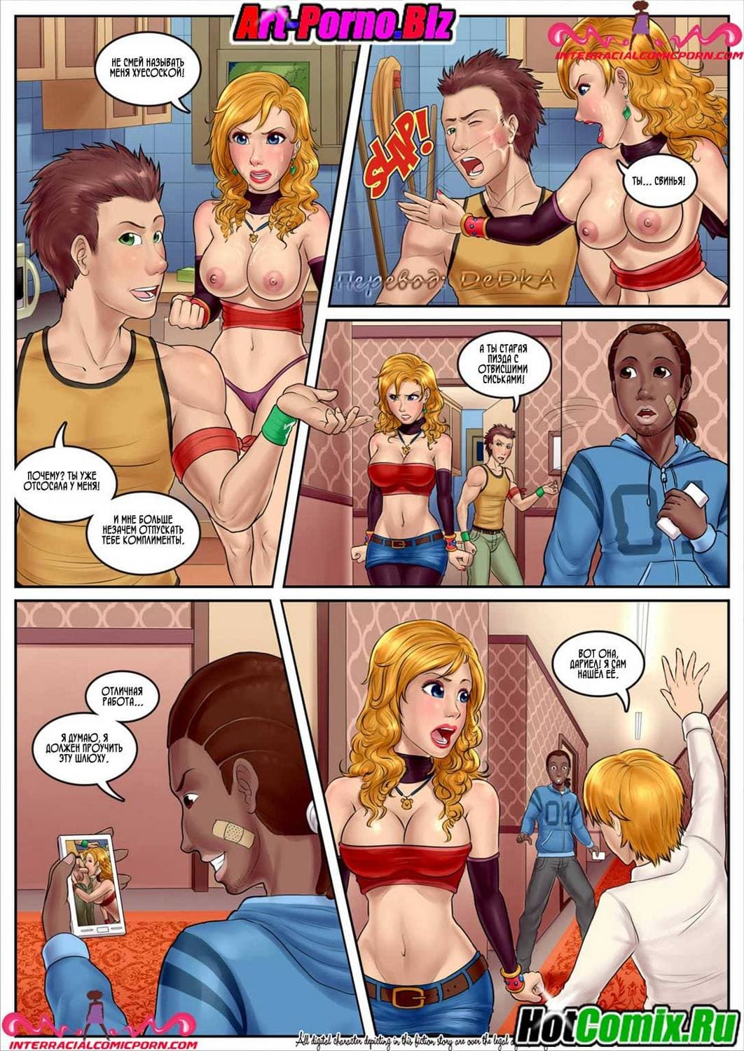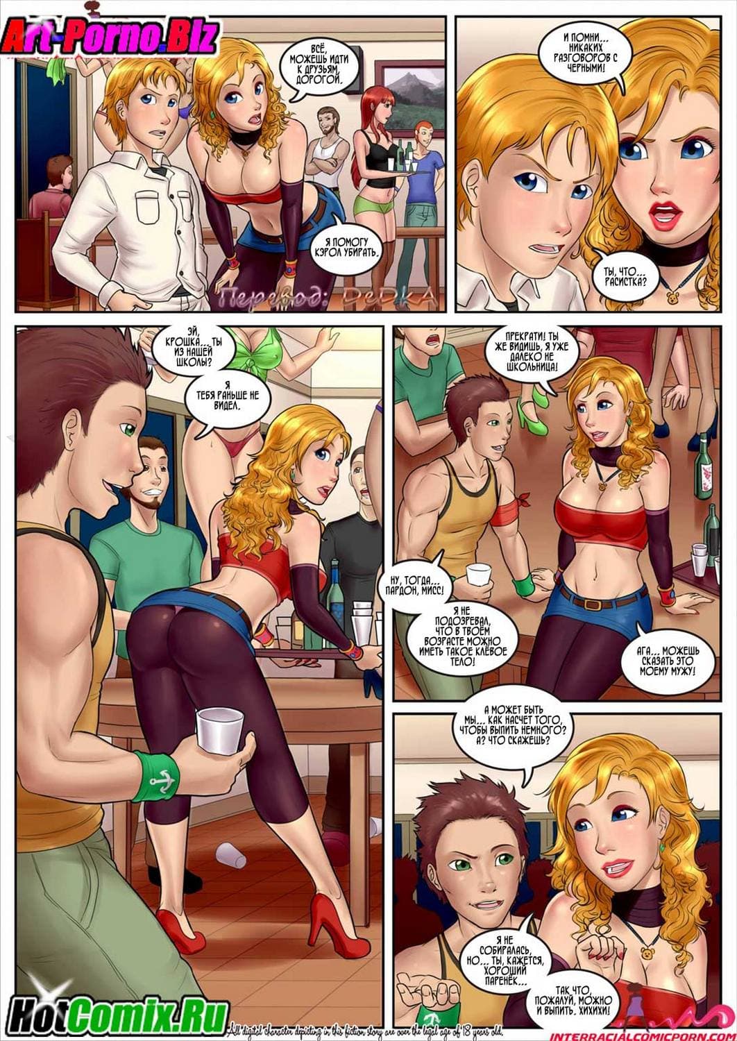 Откровенный порно комикс с переводом на русский язык про вечеринку, где мамочка Люка запретила ему общаться с неграми, потому что считает их необразованными и очень наглыми людьми, которые не научат его ни чему хорошему. Люк, не придал значения словам матери, так как многие чернокожие парни были его друзьями. А вот сама мамуля, выпив лишнего, оказалась в довольно пикантной ситуации, подробности которой узнаете далее.