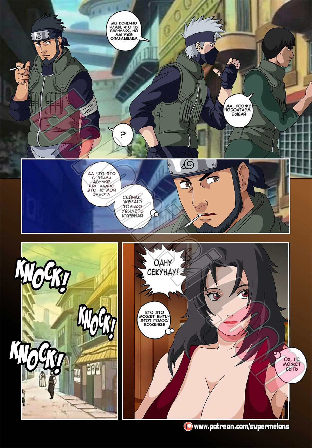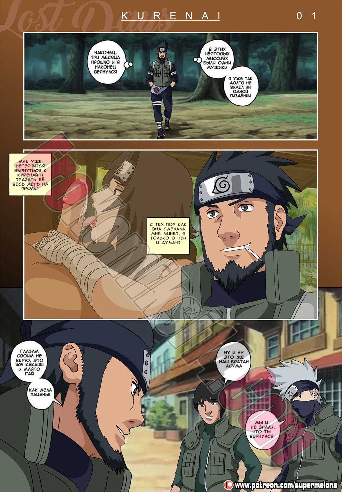 Порно комикс Наруто. Последние дни. Куренай. Super Melons. Парень вернулся домой после трех месяцев путешествий, друзья поговорили с ним не долго, это и хорошо. Больше всего он ждал встречи со своей возлюбленной и при первой же встречи начал ее раздевать и трахать.