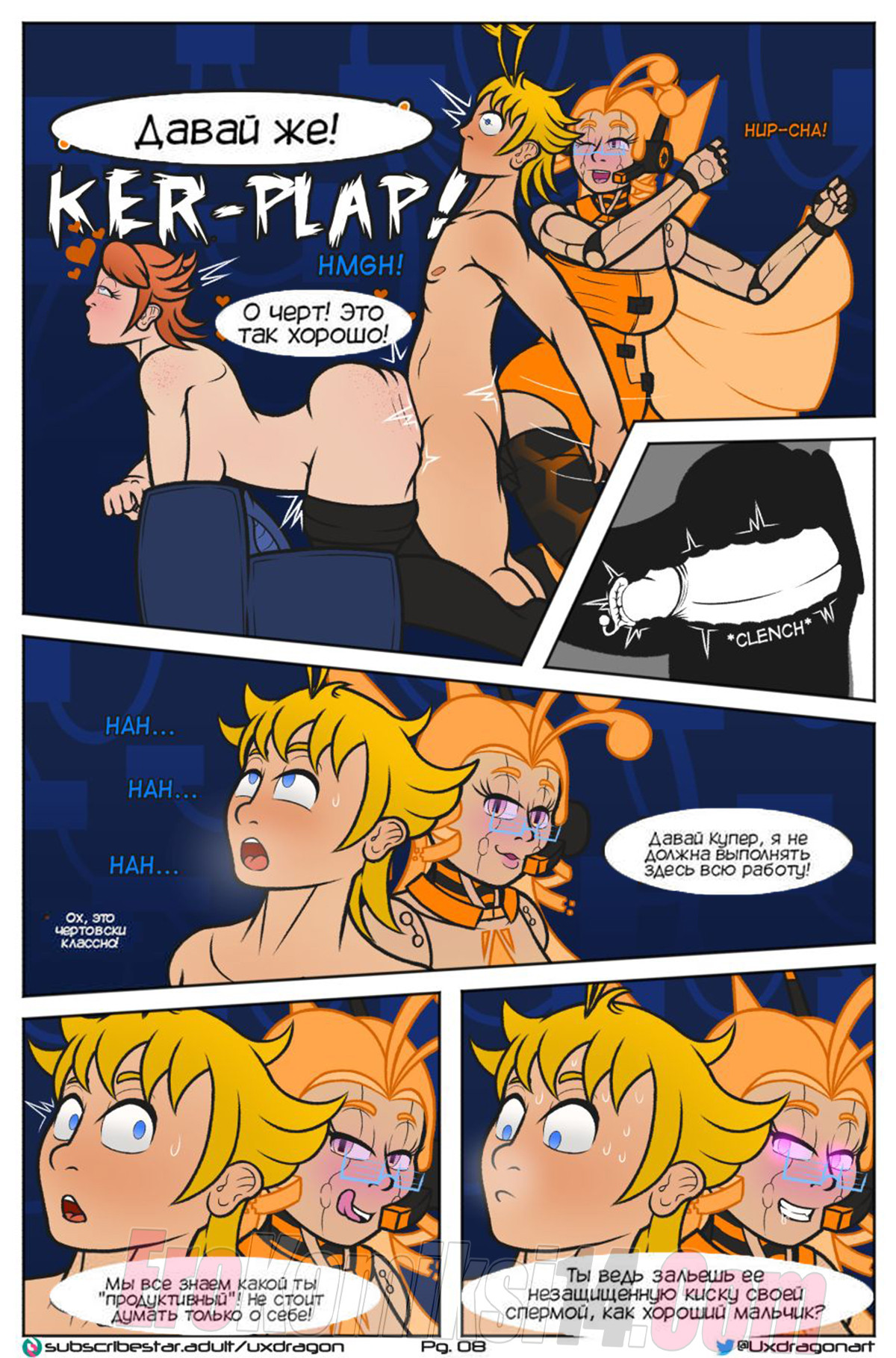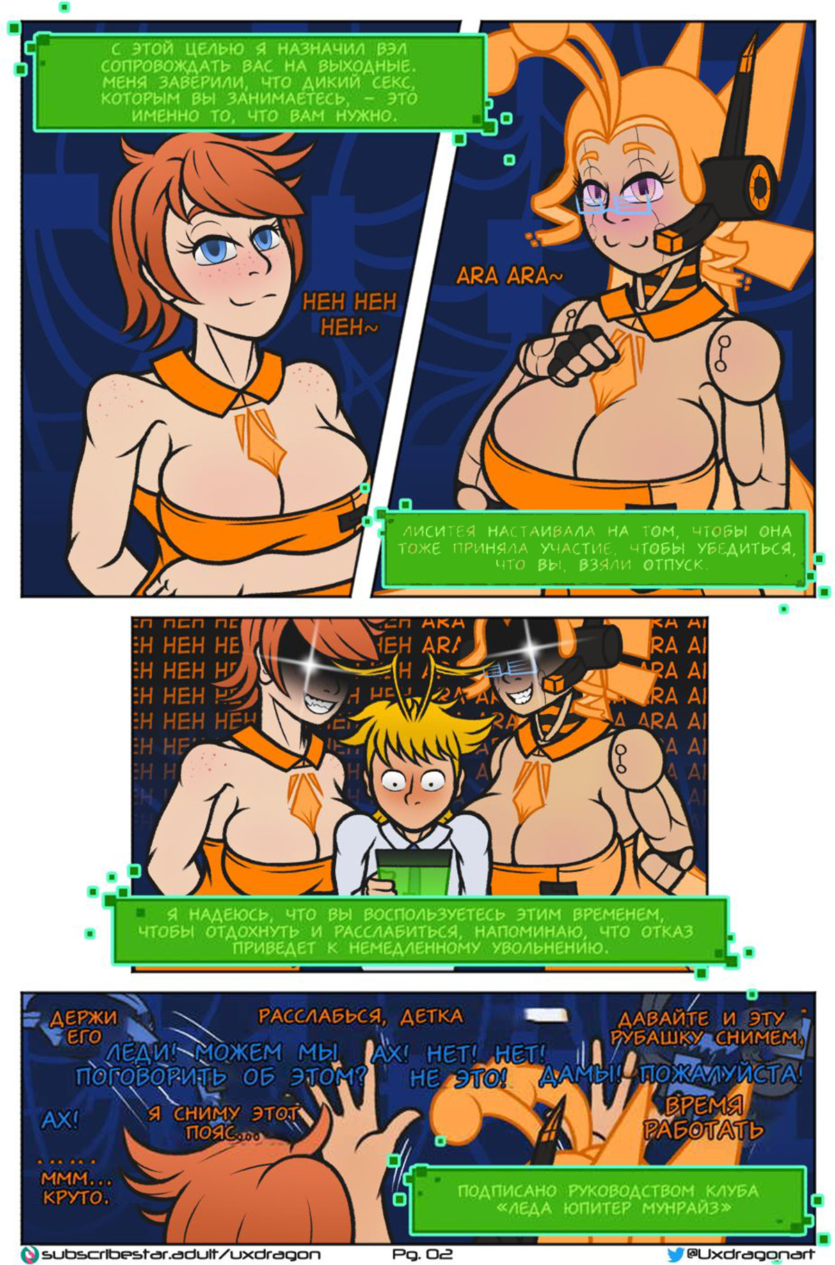 Порно комикс Обязательный дестрессинг. Mandatory Destressing. Uxdragon Две красотки предложили парню устроить себе выходной и решили ему помочь расслабиться. Они раздели его, а одна из них начала сосать его хуй, чтобы хорошенько возбудить. После этого она встала раком, готовая к тому, чтобы ее хорошенько выебали.
