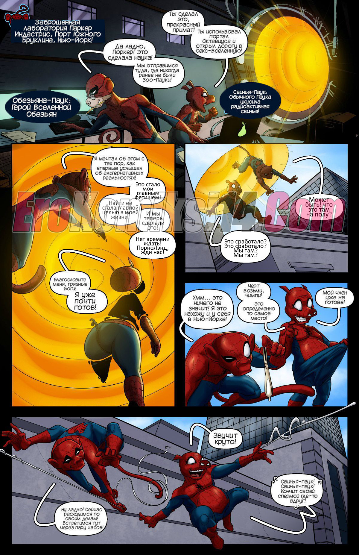 В этом комиксе нам рассказывают о двух версиях человека паука- Паук-обезьяна и Паук-свинья, который бродили по вселенным в поисках той самой секс-вселенной и вот наконец она её нашли… А что было дальше, читайте в комиксе…