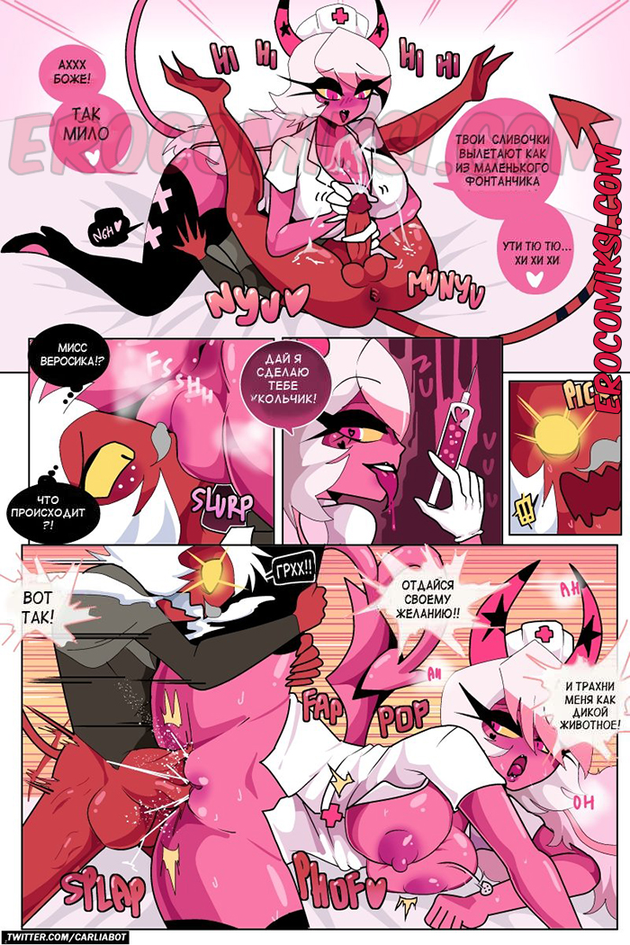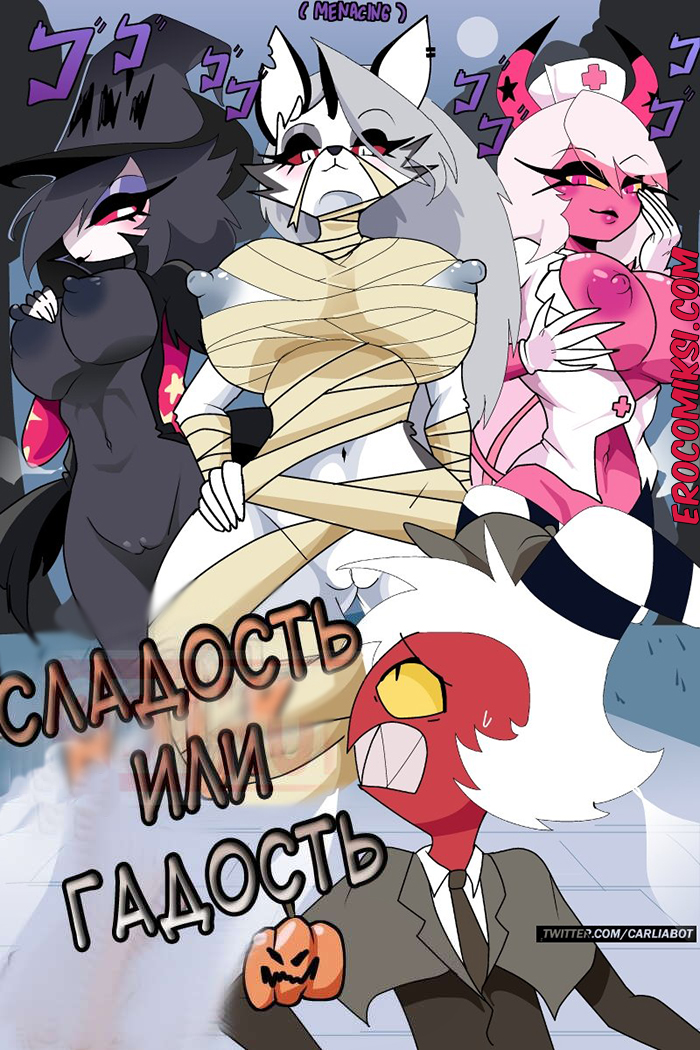 Порно комикс Адский босс. Сладость или гадость. Trick or Treat Carliabot. Helluva Boss. Moxxies Горячая сексуальная блондинка с большими сиськами накинулась на парня демона. Она лишила его возможности двигаться и стала сосать его большой хуй, после чего напрыгнула на него и хорошенько трахнула.
