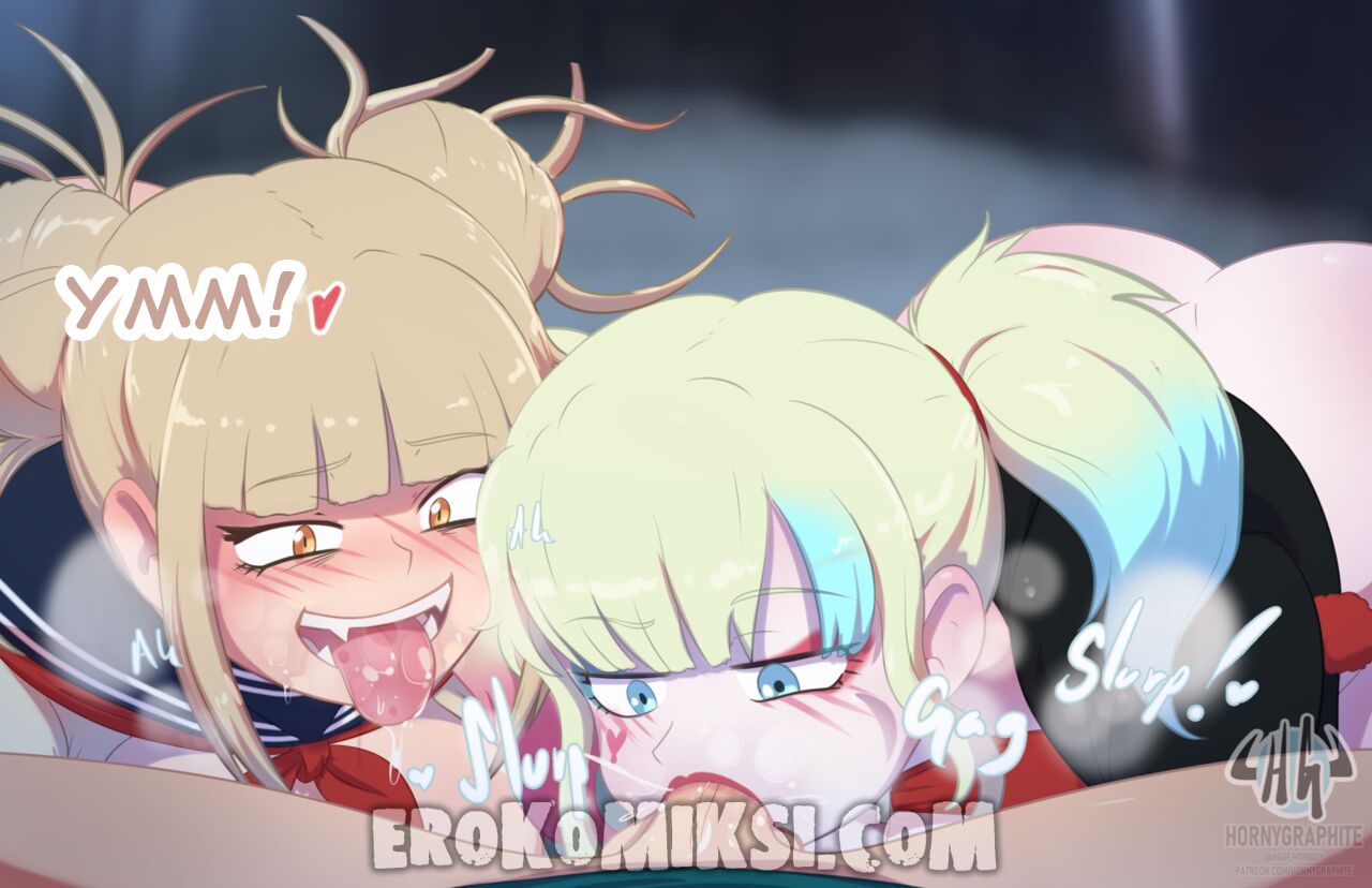 Порно комикс Академия. Поимка Изуко злодейками. Himiko x Harley x Deku. Hornygraphite Горячие блондиночки были очень возбуждены и решили повеселиться с Деку. Они разделись и отсосали большой хуй парня, после чего дали ему выебать свои пизденки…
