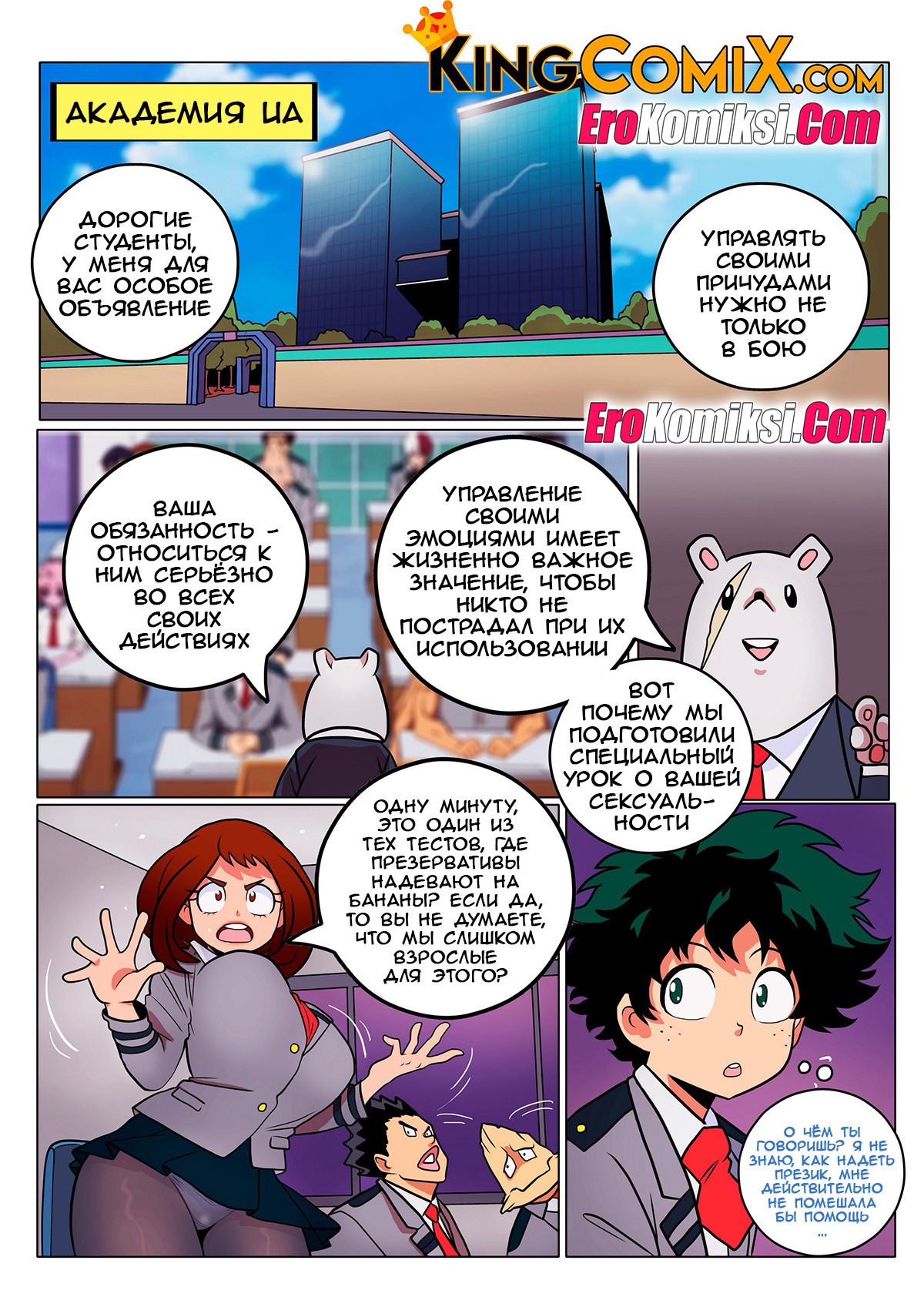 Порно комикс Академия. Секс класс. SexClass. Kingcomix Для учеников академии создали специальные занятия секса. Парень отправился в класс, где его встретила сочная училка с оголенными большими сиськами, что очень возбудило парня и у него встал член…