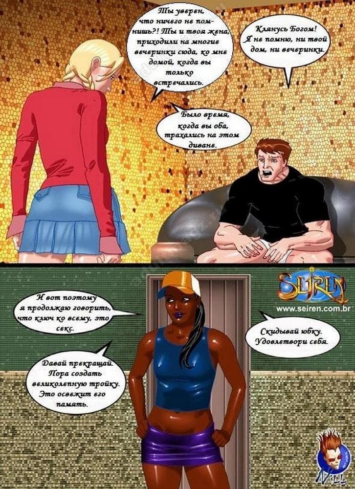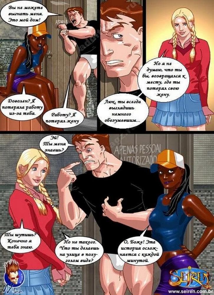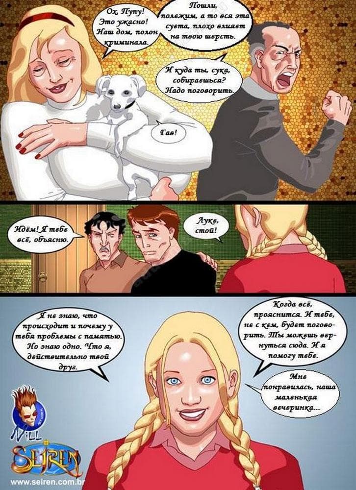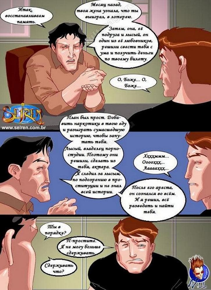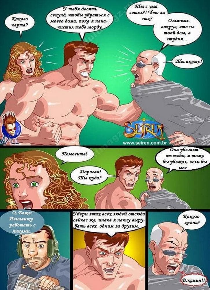 Классный цветной порно комикс про актера, снимающегося в порно фильмах, у которого в голове, что – то замкнуло, и он уже думает, что на самом деле его сексуальная партнерша – это жена, а все вокруг обнаглевшие люди, проникшие к нему в дом. Хорошо, что есть альтернативные женщины, готовые привести в чувства бедолагу, естественно, с помощью своих тугих дырочек.