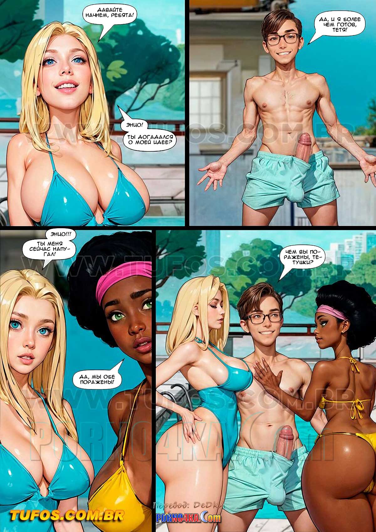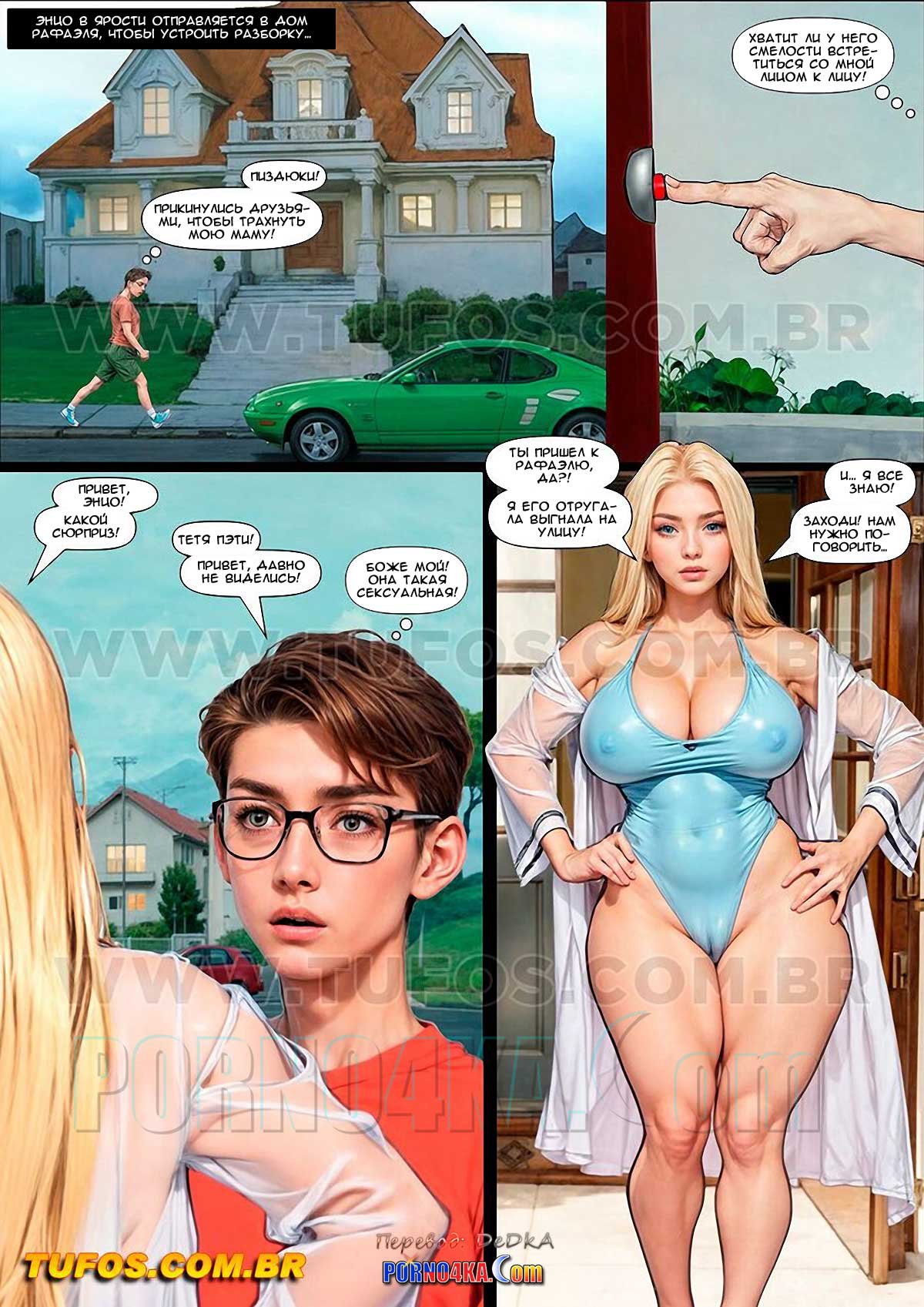 Порно комикс Анаконды. Часть 14: Месть Энцо. Энцо хочет отомстить своим друзьям… Худенький парень отправляется к одному из них, но не застает его дома! Но там Энцо обнаруживает матерей обоих друзей, которые уже знают обо всех проделках своих сыновей. Обе милфы хотят наказать своих сыновей, и, увидев Энцо, у них появляется идей о том, как это сделать…