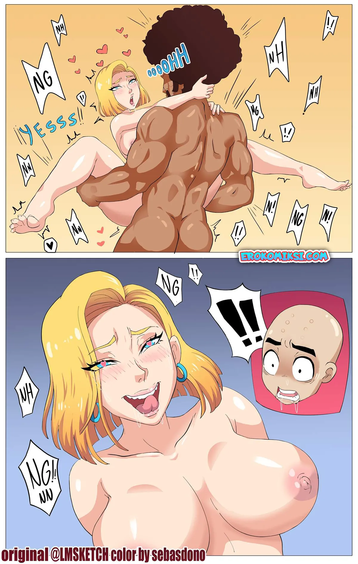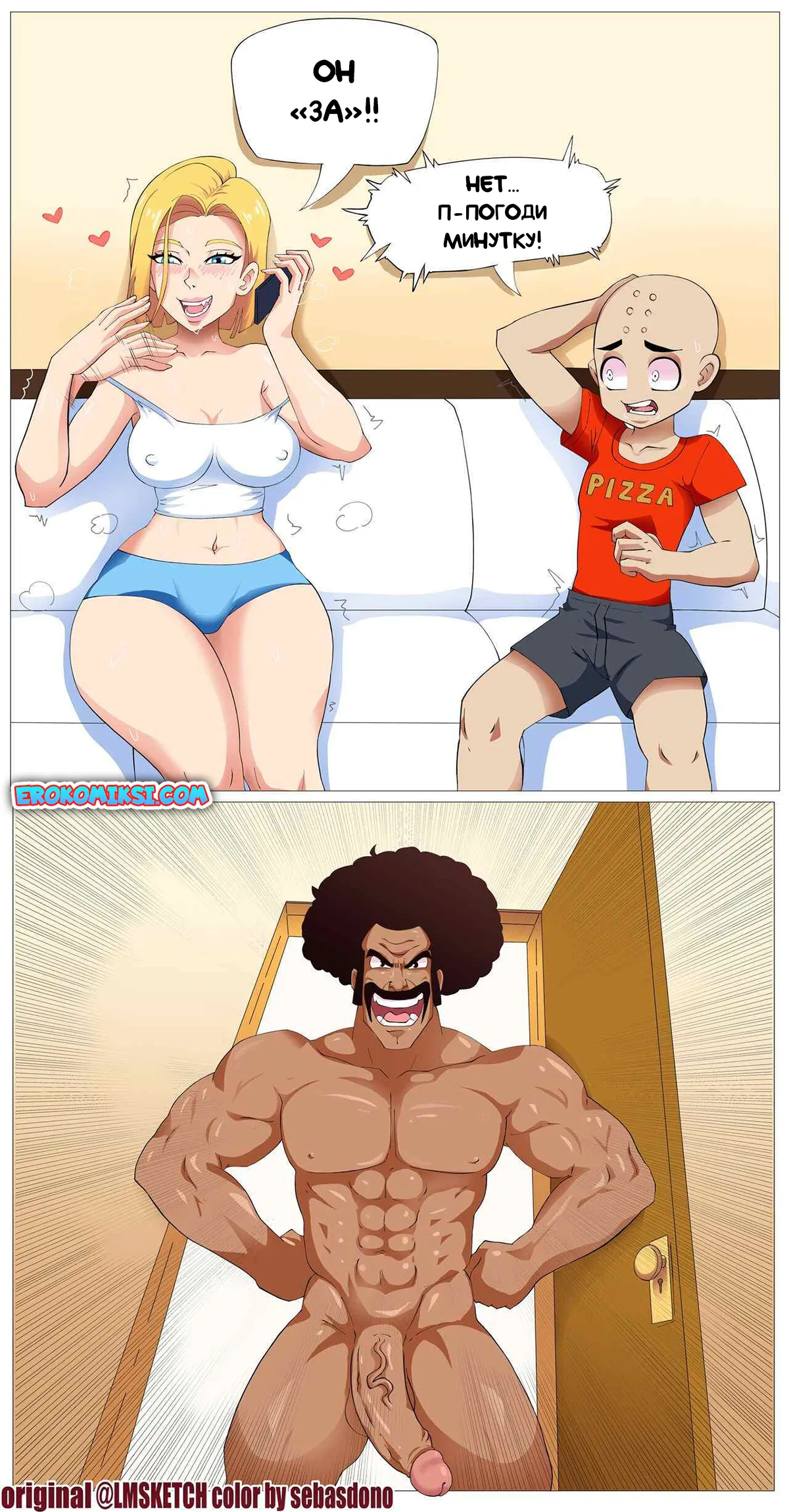 Порно комикс Андроид 18 NTR. Крилин случайно что-то ляпнул про НТР, а Андроид 18 сразу восприняла это по своему. Она мгновенно кому-то позвонила и сказала, что он не против. Чернокожий парень пришёл через секунду и начал трахать девушку на глазах у ее парня…