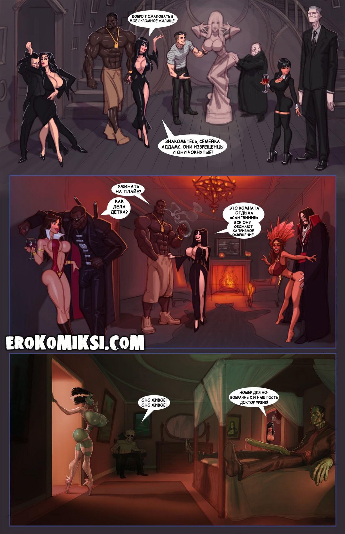 Порно комикс Бал монстров Эльвиры. Грудастая и сексуальная вампирша Эльвира совсем не ждала на свою нечестивую вечеринку огромного чёрного парня, который случайно перепутал дома, но всё равно впустила его в дом, ради жёсткого траха…