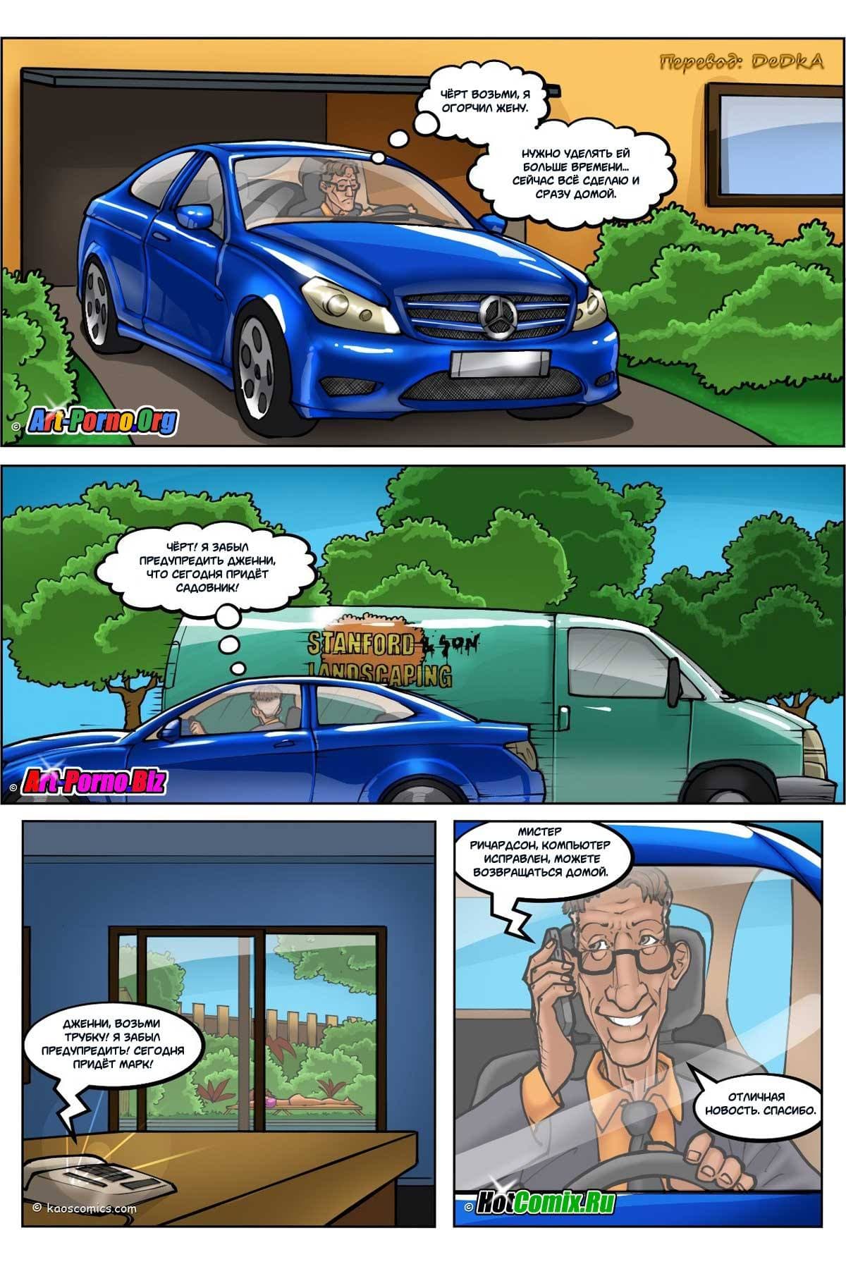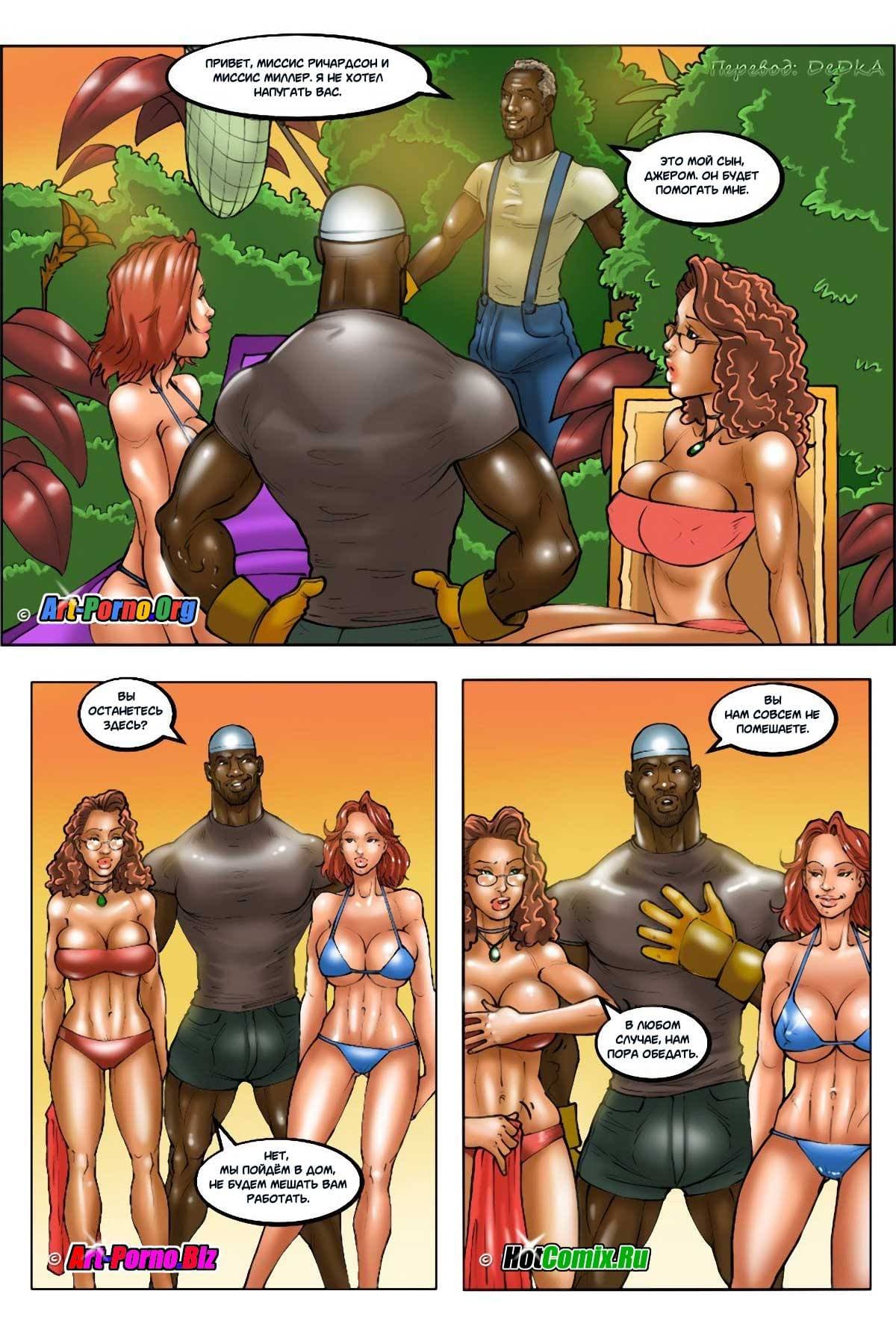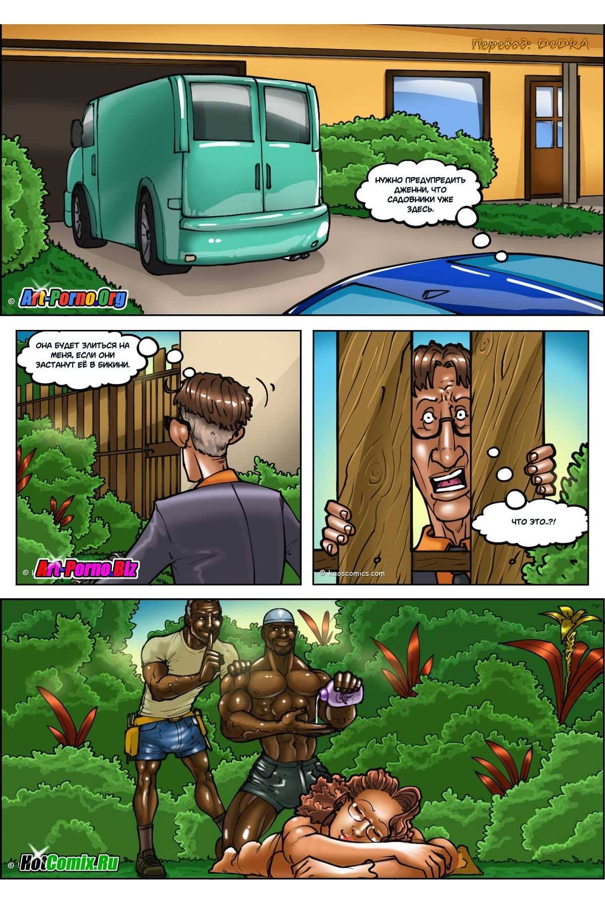 Перед вами порно комикс, в котором происходит измена жены. История начинается с того, что Миссис Дженни Ричардсон обращалась с просьбой к своему мужу Чарльзу не брать к ним в дом чернокожего садовника. Но мистер Чарльз Ричардсон не слушал ее, так как расовые вопросы его не интересовали. Поэтому он не только нанял негра, но и разрешил тому брать с собой помощником своего сына, недавно отбывавшего срок в колонии. Правда, через некоторый промежуток времени мистер Чарльз Ричардсон очень пожалел, что не прислушивался к мнению жены. Зато его благоверная, наоборот, стала испытывать удовольствие, от того, что ее сад обрабатывают такие чернокожие работники.